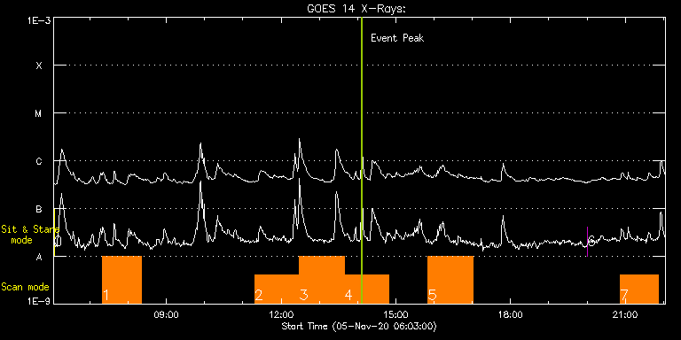 EIS Observation timeline overlay to GOES-Xray curve Code 1" 2" 40" 266" EIS Observations list for this event: STUDY ACRONYM ID DATE OBSERVED DESCRIPTION NOAA# TARGET 0 XRT_synop_AIA | 74950 | 2020/11/05 06:03:34 | Pointing Monitoring | | Quiet Sun TIMELINE ID DATE OBSERVED FITS FILE XCEN (+W/-E) YCEN (+N/-S) DUR ----------------------------------------------------------------------------------------------------------------- 74950 | 2020/11/05 06:03:34.000 | eis_l0_20201105_060334.fits.gz | -132.57 | -0.58 | 10s 1 HPW021VEL260x512v2 | 74942 | 2020/11/05 07:19:19 | Solar Orbiter/SPICE observation suppor | | Active Region TIMELINE ID DATE OBSERVED FITS FILE XCEN (+W/-E) YCEN (+N/-S) DUR ----------------------------------------------------------------------------------------------------------------- 74942 | 2020/11/05 07:19:19.000 | eis_l0_20201105_071919.fits.gz | -483.25 | 286.16 | 1h0m45s 2 HOP81_new_study | 74951 | 2020/11/05 11:18:42 | Polar Monitoring Campaign during the S | | Coronal Hole TIMELINE ID DATE OBSERVED FITS FILE XCEN (+W/-E) YCEN (+N/-S) DUR ----------------------------------------------------------------------------------------------------------------- 74951 | 2020/11/05 11:18:42.000 | eis_l0_20201105_111842.fits.gz | -25.83 | -921.61 | 1h9m45s 3 HOP81_new_study | 74952 | 2020/11/05 12:28:59 | Polar Monitoring Campaign during the S | | Coronal Hole TIMELINE ID DATE OBSERVED FITS FILE XCEN (+W/-E) YCEN (+N/-S) DUR ----------------------------------------------------------------------------------------------------------------- 74952 | 2020/11/05 12:28:59.000 | eis_l0_20201105_122859.fits.gz | -25.91 | -921.38 | 1h9m45s 4 HOP81_new_study | 74953 | 2020/11/05 13:38:48 | Polar Monitoring Campaign during the S | | Coronal Hole TIMELINE ID DATE OBSERVED FITS FILE XCEN (+W/-E) YCEN (+N/-S) DUR ----------------------------------------------------------------------------------------------------------------- 74953 | 2020/11/05 13:38:48.000 | eis_l0_20201105_133848.fits.gz | -25.91 | -921.45 | 1h9m45s 5 HOP81_new_study | 74954 | 2020/11/05 15:50:44 | Polar Monitoring Campaign during the S | | Coronal Hole TIMELINE ID DATE OBSERVED FITS FILE XCEN (+W/-E) YCEN (+N/-S) DUR ----------------------------------------------------------------------------------------------------------------- 74954 | 2020/11/05 15:50:44.000 | eis_l0_20201105_155044.fits.gz | -25.91 | -921.53 | 1h9m44s 6 regcal077 | 74966 | 2020/11/05 20:00:12 | Flatfield, 2 exposures, led 80ms, full | | Engineering TIMELINE ID DATE OBSERVED FITS FILE XCEN (+W/-E) YCEN (+N/-S) DUR ----------------------------------------------------------------------------------------------------------------- 74966 | 2020/11/05 20:00:12.000 | eis_l0_20201105_200012.fits.gz | -643.87 | -514.29 | 4s 7 HPW021VEL260x512v2 | 74956 | 2020/11/05 20:51:41 | Solar Orbiter/SPICE observation suppor | 2781 | Active Region TIMELINE ID DATE OBSERVED FITS FILE XCEN (+W/-E) YCEN (+N/-S) DUR ----------------------------------------------------------------------------------------------------------------- 74956 | 2020/11/05 20:51:41.000 | eis_l0_20201105_205141.fits.gz | -657.00 | -426.53 | 1h0m45s : Check study information : Download file : View thumbnails For this event, also check for: