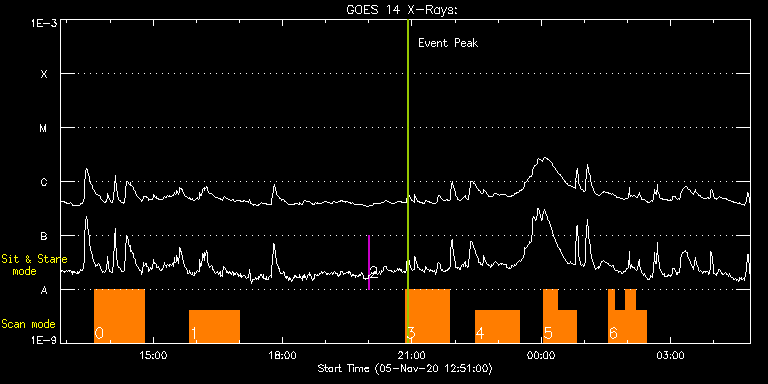 EIS Observation timeline overlay to GOES-Xray curve Code 1" 2" 40" 266" EIS Observations list for this event: STUDY ACRONYM ID DATE OBSERVED DESCRIPTION NOAA# TARGET 0 HOP81_new_study | 74953 | 2020/11/05 13:38:48 | Polar Monitoring Campaign during the S | | Coronal Hole TIMELINE ID DATE OBSERVED FITS FILE XCEN (+W/-E) YCEN (+N/-S) DUR ----------------------------------------------------------------------------------------------------------------- 74953 | 2020/11/05 13:38:48.000 | eis_l0_20201105_133848.fits.gz | -25.91 | -921.45 | 1h9m45s 1 HOP81_new_study | 74954 | 2020/11/05 15:50:44 | Polar Monitoring Campaign during the S | | Coronal Hole TIMELINE ID DATE OBSERVED FITS FILE XCEN (+W/-E) YCEN (+N/-S) DUR ----------------------------------------------------------------------------------------------------------------- 74954 | 2020/11/05 15:50:44.000 | eis_l0_20201105_155044.fits.gz | -25.91 | -921.53 | 1h9m44s 2 regcal077 | 74966 | 2020/11/05 20:00:12 | Flatfield, 2 exposures, led 80ms, full | | Engineering TIMELINE ID DATE OBSERVED FITS FILE XCEN (+W/-E) YCEN (+N/-S) DUR ----------------------------------------------------------------------------------------------------------------- 74966 | 2020/11/05 20:00:12.000 | eis_l0_20201105_200012.fits.gz | -643.87 | -514.29 | 4s 3 HPW021VEL260x512v2 | 74956 | 2020/11/05 20:51:41 | Solar Orbiter/SPICE observation suppor | 2781 | Active Region TIMELINE ID DATE OBSERVED FITS FILE XCEN (+W/-E) YCEN (+N/-S) DUR ----------------------------------------------------------------------------------------------------------------- 74956 | 2020/11/05 20:51:41.000 | eis_l0_20201105_205141.fits.gz | -657.00 | -426.53 | 1h0m45s 4 Atlas_60 | 74959 | 2020/11/05 22:28:13 | Solar Orbiter/SPICE observation suppor | 2781 | Quiet Sun TIMELINE ID DATE OBSERVED FITS FILE XCEN (+W/-E) YCEN (+N/-S) DUR ----------------------------------------------------------------------------------------------------------------- 74959 | 2020/11/05 22:28:13.000 | eis_l0_20201105_222813.fits.gz | -647.00 | -427.07 | 1h1m40s 5 DHB_006 | 74967 | 2020/11/06 00:03:14 | Solar Orbiter/SPICE observation suppor | 2781 | Active Region TIMELINE ID DATE OBSERVED FITS FILE XCEN (+W/-E) YCEN (+N/-S) DUR ----------------------------------------------------------------------------------------------------------------- 74967 | 2020/11/06 00:03:14.000 | eis_l0_20201106_000314.fits.gz | -638.09 | -427.68 | 19m39s 74967 | 2020/11/06 00:23:27.000 | eis_l0_20201106_002327.fits.gz | -636.09 | -427.92 | 24m58s 6 ar_evolution | 74968 | 2020/11/06 01:33:44 | AR evolution | | Active Region TIMELINE ID DATE OBSERVED FITS FILE XCEN (+W/-E) YCEN (+N/-S) DUR ----------------------------------------------------------------------------------------------------------------- 74968 | 2020/11/06 01:33:44.000 | eis_l0_20201106_013344.fits.gz | -628.90 | -428.15 | 8m17s 74968 | 2020/11/06 01:42:03.000 | eis_l0_20201106_014203.fits.gz | -627.97 | -428.30 | 14m47s 74968 | 2020/11/06 01:56:53.000 | eis_l0_20201106_015653.fits.gz | -626.51 | -428.38 | 14m47s 74968 | 2020/11/06 02:11:43.000 | eis_l0_20201106_021143.fits.gz | -624.88 | -428.46 | 14m47s : Check study information : Download file : View thumbnails For this event, also check for: