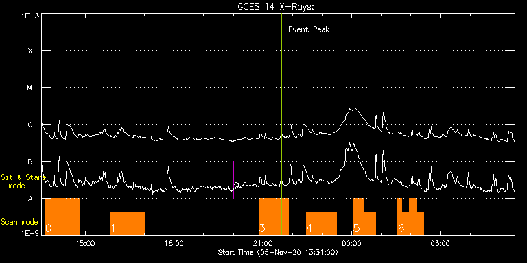 EIS Observation timeline overlay to GOES-Xray curve Code 1" 2" 40" 266" EIS Observations list for this event: STUDY ACRONYM ID DATE OBSERVED DESCRIPTION NOAA# TARGET 0 HOP81_new_study | 74953 | 2020/11/05 13:38:48 | Polar Monitoring Campaign during the S | | Coronal Hole TIMELINE ID DATE OBSERVED FITS FILE XCEN (+W/-E) YCEN (+N/-S) DUR ----------------------------------------------------------------------------------------------------------------- 74953 | 2020/11/05 13:38:48.000 | eis_l0_20201105_133848.fits.gz | -25.91 | -921.45 | 1h9m45s 1 HOP81_new_study | 74954 | 2020/11/05 15:50:44 | Polar Monitoring Campaign during the S | | Coronal Hole TIMELINE ID DATE OBSERVED FITS FILE XCEN (+W/-E) YCEN (+N/-S) DUR ----------------------------------------------------------------------------------------------------------------- 74954 | 2020/11/05 15:50:44.000 | eis_l0_20201105_155044.fits.gz | -25.91 | -921.53 | 1h9m44s 2 regcal077 | 74966 | 2020/11/05 20:00:12 | Flatfield, 2 exposures, led 80ms, full | | Engineering TIMELINE ID DATE OBSERVED FITS FILE XCEN (+W/-E) YCEN (+N/-S) DUR ----------------------------------------------------------------------------------------------------------------- 74966 | 2020/11/05 20:00:12.000 | eis_l0_20201105_200012.fits.gz | -643.87 | -514.29 | 4s 3 HPW021VEL260x512v2 | 74956 | 2020/11/05 20:51:41 | Solar Orbiter/SPICE observation suppor | 2781 | Active Region TIMELINE ID DATE OBSERVED FITS FILE XCEN (+W/-E) YCEN (+N/-S) DUR ----------------------------------------------------------------------------------------------------------------- 74956 | 2020/11/05 20:51:41.000 | eis_l0_20201105_205141.fits.gz | -657.00 | -426.53 | 1h0m45s 4 Atlas_60 | 74959 | 2020/11/05 22:28:13 | Solar Orbiter/SPICE observation suppor | 2781 | Quiet Sun TIMELINE ID DATE OBSERVED FITS FILE XCEN (+W/-E) YCEN (+N/-S) DUR ----------------------------------------------------------------------------------------------------------------- 74959 | 2020/11/05 22:28:13.000 | eis_l0_20201105_222813.fits.gz | -647.00 | -427.07 | 1h1m40s 5 DHB_006 | 74967 | 2020/11/06 00:03:14 | Solar Orbiter/SPICE observation suppor | 2781 | Active Region TIMELINE ID DATE OBSERVED FITS FILE XCEN (+W/-E) YCEN (+N/-S) DUR ----------------------------------------------------------------------------------------------------------------- 74967 | 2020/11/06 00:03:14.000 | eis_l0_20201106_000314.fits.gz | -638.09 | -427.68 | 19m39s 74967 | 2020/11/06 00:23:27.000 | eis_l0_20201106_002327.fits.gz | -636.09 | -427.92 | 24m58s 6 ar_evolution | 74968 | 2020/11/06 01:33:44 | AR evolution | | Active Region TIMELINE ID DATE OBSERVED FITS FILE XCEN (+W/-E) YCEN (+N/-S) DUR ----------------------------------------------------------------------------------------------------------------- 74968 | 2020/11/06 01:33:44.000 | eis_l0_20201106_013344.fits.gz | -628.90 | -428.15 | 8m17s 74968 | 2020/11/06 01:42:03.000 | eis_l0_20201106_014203.fits.gz | -627.97 | -428.30 | 14m47s 74968 | 2020/11/06 01:56:53.000 | eis_l0_20201106_015653.fits.gz | -626.51 | -428.38 | 14m47s 74968 | 2020/11/06 02:11:43.000 | eis_l0_20201106_021143.fits.gz | -624.88 | -428.46 | 14m47s : Check study information : Download file : View thumbnails For this event, also check for:
