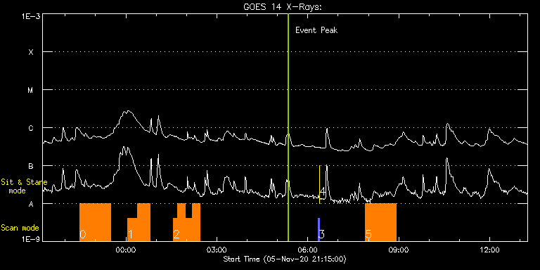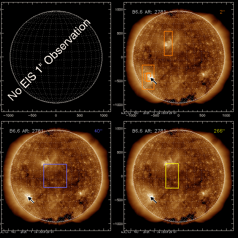 EIS Observation timeline overlay to GOES-Xray curve Code 1" 2" 40" 266" EIS Observations list for this event: STUDY ACRONYM ID DATE OBSERVED DESCRIPTION NOAA# TARGET 0 Atlas_60 | 74959 | 2020/11/05 22:28:13 | Solar Orbiter/SPICE observation suppor | 2781 | Quiet Sun TIMELINE ID DATE OBSERVED FITS FILE XCEN (+W/-E) YCEN (+N/-S) DUR ----------------------------------------------------------------------------------------------------------------- 74959 | 2020/11/05 22:28:13.000 | eis_l0_20201105_222813.fits.gz | -647.00 | -427.07 | 1h1m40s 1 DHB_006 | 74967 | 2020/11/06 00:03:14 | Solar Orbiter/SPICE observation suppor | 2781 | Active Region TIMELINE ID DATE OBSERVED FITS FILE XCEN (+W/-E) YCEN (+N/-S) DUR ----------------------------------------------------------------------------------------------------------------- 74967 | 2020/11/06 00:03:14.000 | eis_l0_20201106_000314.fits.gz | -638.09 | -427.68 | 19m39s 74967 | 2020/11/06 00:23:27.000 | eis_l0_20201106_002327.fits.gz | -636.09 | -427.92 | 24m58s 2 ar_evolution | 74968 | 2020/11/06 01:33:44 | AR evolution | | Active Region TIMELINE ID DATE OBSERVED FITS FILE XCEN (+W/-E) YCEN (+N/-S) DUR ----------------------------------------------------------------------------------------------------------------- 74968 | 2020/11/06 01:33:44.000 | eis_l0_20201106_013344.fits.gz | -628.90 | -428.15 | 8m17s 74968 | 2020/11/06 01:42:03.000 | eis_l0_20201106_014203.fits.gz | -627.97 | -428.30 | 14m47s 74968 | 2020/11/06 01:56:53.000 | eis_l0_20201106_015653.fits.gz | -626.51 | -428.38 | 14m47s 74968 | 2020/11/06 02:11:43.000 | eis_l0_20201106_021143.fits.gz | -624.88 | -428.46 | 14m47s 3 PRY_slot_contextLITE | 74962 | 2020/11/06 06:20:20 | Pointing Monitoring | | Active Region TIMELINE ID DATE OBSERVED FITS FILE XCEN (+W/-E) YCEN (+N/-S) DUR ----------------------------------------------------------------------------------------------------------------- 74962 | 2020/11/06 06:20:20.000 | eis_l0_20201106_062020.fits.gz | -15.29 | -0.50 | 2m56s 4 XRT_synop_AIA | 74963 | 2020/11/06 06:23:35 | Pointing Monitoring | | Quiet Sun TIMELINE ID DATE OBSERVED FITS FILE XCEN (+W/-E) YCEN (+N/-S) DUR ----------------------------------------------------------------------------------------------------------------- 74963 | 2020/11/06 06:23:35.000 | eis_l0_20201106_062335.fits.gz | -132.57 | -0.50 | 10s 5 HPW021VEL260x512v2 | 74958 | 2020/11/06 07:53:50 | Solar Orbiter/SPICE observation suppor | 2780 | Active Region TIMELINE ID DATE OBSERVED FITS FILE XCEN (+W/-E) YCEN (+N/-S) DUR ----------------------------------------------------------------------------------------------------------------- 74958 | 2020/11/06 07:53:50.000 | eis_l0_20201106_075350.fits.gz | -214.49 | 283.15 | 1h0m44s : Check study information : Download file : View thumbnails For this event, also check for: