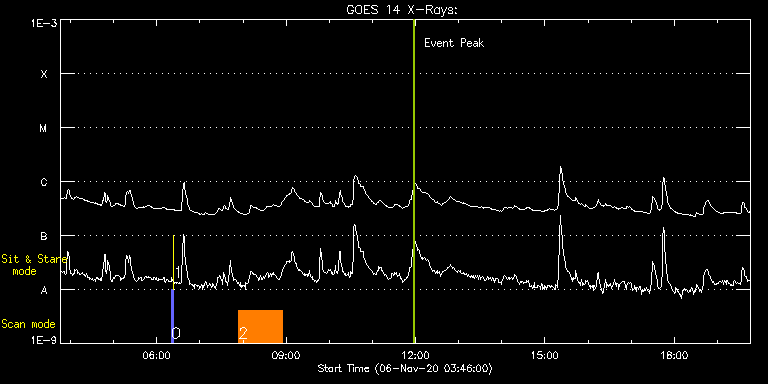 EIS Observation timeline overlay to GOES-Xray curve Code 1" 2" 40" 266" EIS Observations list for this event: STUDY ACRONYM ID DATE OBSERVED DESCRIPTION NOAA# TARGET 0 PRY_slot_contextLITE | 74962 | 2020/11/06 06:20:20 | Pointing Monitoring | | Active Region TIMELINE ID DATE OBSERVED FITS FILE XCEN (+W/-E) YCEN (+N/-S) DUR ----------------------------------------------------------------------------------------------------------------- 74962 | 2020/11/06 06:20:20.000 | eis_l0_20201106_062020.fits.gz | -15.29 | -0.50 | 2m56s 1 XRT_synop_AIA | 74963 | 2020/11/06 06:23:35 | Pointing Monitoring | | Quiet Sun TIMELINE ID DATE OBSERVED FITS FILE XCEN (+W/-E) YCEN (+N/-S) DUR ----------------------------------------------------------------------------------------------------------------- 74963 | 2020/11/06 06:23:35.000 | eis_l0_20201106_062335.fits.gz | -132.57 | -0.50 | 10s 2 HPW021VEL260x512v2 | 74958 | 2020/11/06 07:53:50 | Solar Orbiter/SPICE observation suppor | 2780 | Active Region TIMELINE ID DATE OBSERVED FITS FILE XCEN (+W/-E) YCEN (+N/-S) DUR ----------------------------------------------------------------------------------------------------------------- 74958 | 2020/11/06 07:53:50.000 | eis_l0_20201106_075350.fits.gz | -214.49 | 283.15 | 1h0m44s : Check study information : Download file : View thumbnails For this event, also check for: