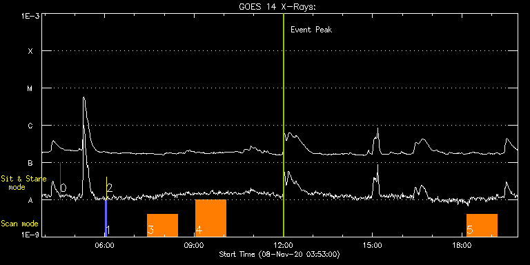 EIS Observation timeline overlay to GOES-Xray curve Code 1" 2" 40" 266" EIS Observations list for this event: STUDY ACRONYM ID DATE OBSERVED DESCRIPTION NOAA# TARGET 0 regcal070 | 74994 | 2020/11/08 04:30:11 | Flat field with overscan pixels (50*8) | | Engineering TIMELINE ID DATE OBSERVED FITS FILE XCEN (+W/-E) YCEN (+N/-S) DUR ----------------------------------------------------------------------------------------------------------------- 74994 | 2020/11/08 04:30:11.000 | eis_l0_20201108_043011.fits.gz | 14.51 | 205.58 | 2s 1 PRY_slot_contextLITE | 74995 | 2020/11/08 06:00:19 | Pointing Monitoring | | Active Region TIMELINE ID DATE OBSERVED FITS FILE XCEN (+W/-E) YCEN (+N/-S) DUR ----------------------------------------------------------------------------------------------------------------- 74995 | 2020/11/08 06:00:19.000 | eis_l0_20201108_060019.fits.gz | -15.29 | -0.42 | 2m57s 2 XRT_synop_AIA | 74996 | 2020/11/08 06:03:34 | Pointing Monitoring | | Quiet Sun TIMELINE ID DATE OBSERVED FITS FILE XCEN (+W/-E) YCEN (+N/-S) DUR ----------------------------------------------------------------------------------------------------------------- 74996 | 2020/11/08 06:03:34.000 | eis_l0_20201108_060334.fits.gz | -132.57 | -0.50 | 10s 3 HPW021VEL260x512v2 | 74976 | 2020/11/08 07:26:19 | HOP407-Solar Orbiter/SPICE STP122 obse | | Active Region TIMELINE ID DATE OBSERVED FITS FILE XCEN (+W/-E) YCEN (+N/-S) DUR ----------------------------------------------------------------------------------------------------------------- 74976 | 2020/11/08 07:26:19.000 | eis_l0_20201108_072619.fits.gz | 131.33 | 285.23 | 1h0m44s 4 HPW021VEL260x512v2 | 74977 | 2020/11/08 09:03:39 | HOP407-Solar Orbiter/SPICE STP122 obse | 2780 | Active Region TIMELINE ID DATE OBSERVED FITS FILE XCEN (+W/-E) YCEN (+N/-S) DUR ----------------------------------------------------------------------------------------------------------------- 74977 | 2020/11/08 09:03:39.000 | eis_l0_20201108_090339.fits.gz | 145.08 | 285.62 | 1h0m45s 5 Large_CH_Map | 75001 | 2020/11/08 18:09:40 | HOP407-Solar Orbiter/SPICE STP122 obse | | Quiet Sun TIMELINE ID DATE OBSERVED FITS FILE XCEN (+W/-E) YCEN (+N/-S) DUR ----------------------------------------------------------------------------------------------------------------- 75001 | 2020/11/08 18:09:40.000 | eis_l0_20201108_180940.fits.gz | -4.79 | 37.58 | 1h1m53s : Check study information : Download file : View thumbnails For this event, also check for:
