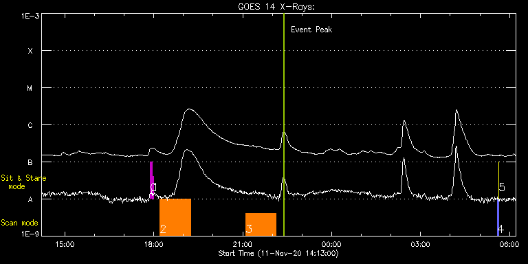EIS Observation timeline overlay to GOES-Xray curve Code 1" 2" 40" 266" EIS Observations list for this event: STUDY ACRONYM ID DATE OBSERVED DESCRIPTION NOAA# TARGET 0 regcal071 | 75049 | 2020/11/11 17:53:11 | Dark exposures, CCD bottom rows (100s | | Engineering TIMELINE ID DATE OBSERVED FITS FILE XCEN (+W/-E) YCEN (+N/-S) DUR ----------------------------------------------------------------------------------------------------------------- 75049 | 2020/11/11 17:53:11.000 | eis_l0_20201111_175311.fits.gz | 14.51 | -305.50 | 3m22s 1 regcal072 | 75050 | 2020/11/11 17:57:00 | Dark exposures, top CCD rows (100s exp | | Engineering TIMELINE ID DATE OBSERVED FITS FILE XCEN (+W/-E) YCEN (+N/-S) DUR ----------------------------------------------------------------------------------------------------------------- 75050 | 2020/11/11 17:57:00.000 | eis_l0_20201111_175700.fits.gz | 14.59 | 205.50 | 3m21s 2 Atlas_60 | 75042 | 2020/11/11 18:12:40 | HOP407-Solar Orbiter/SPICE STP122 obse | | Quiet Sun TIMELINE ID DATE OBSERVED FITS FILE XCEN (+W/-E) YCEN (+N/-S) DUR ----------------------------------------------------------------------------------------------------------------- 75042 | 2020/11/11 18:12:40.000 | eis_l0_20201111_181240.fits.gz | -3.97 | 37.50 | 1h1m39s 3 HPW021VEL260x512v2 | 75045 | 2020/11/11 21:06:10 | HOP407-Solar Orbiter/SPICE STP122 obse | 2781 | Active Region TIMELINE ID DATE OBSERVED FITS FILE XCEN (+W/-E) YCEN (+N/-S) DUR ----------------------------------------------------------------------------------------------------------------- 75045 | 2020/11/11 21:06:10.000 | eis_l0_20201111_210610.fits.gz | 467.69 | -425.45 | 1h0m44s 4 PRY_slot_contextLITE | 75036 | 2020/11/12 05:35:20 | Pointing Monitoring | | Active Region TIMELINE ID DATE OBSERVED FITS FILE XCEN (+W/-E) YCEN (+N/-S) DUR ----------------------------------------------------------------------------------------------------------------- 75036 | 2020/11/12 05:35:20.000 | eis_l0_20201112_053520.fits.gz | -15.21 | -0.42 | 2m56s 5 XRT_synop_AIA | 75037 | 2020/11/12 05:38:35 | Pointing Monitoring | | Quiet Sun TIMELINE ID DATE OBSERVED FITS FILE XCEN (+W/-E) YCEN (+N/-S) DUR ----------------------------------------------------------------------------------------------------------------- 75037 | 2020/11/12 05:38:35.000 | eis_l0_20201112_053835.fits.gz | -132.49 | -0.50 | 10s : Check study information : Download file : View thumbnails For this event, also check for: