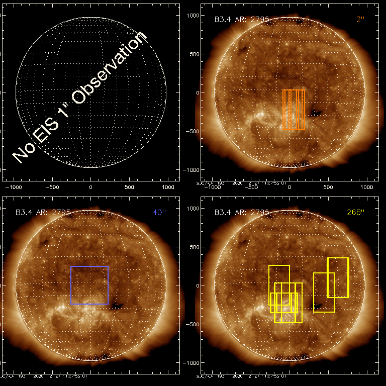 EIS Observation timeline overlay to GOES-Xray curve Code 1" 2" 40" 266" EIS Observations list for this event: STUDY ACRONYM ID DATE OBSERVED DESCRIPTION NOAA# TARGET 0 PRY_slot_contextLITE | 75481 | 2020/12/27 05:40:11 | Pointing Monitoring | | Active Region TIMELINE ID DATE OBSERVED FITS FILE XCEN (+W/-E) YCEN (+N/-S) DUR ----------------------------------------------------------------------------------------------------------------- 75481 | 2020/12/27 05:40:11.000 | eis_l0_20201227_054011.fits.gz | -15.29 | -0.58 | 2m57s 1 XRT_synop_AIA | 75482 | 2020/12/27 05:43:26 | Pointing Monitoring | | Quiet Sun TIMELINE ID DATE OBSERVED FITS FILE XCEN (+W/-E) YCEN (+N/-S) DUR ----------------------------------------------------------------------------------------------------------------- 75482 | 2020/12/27 05:43:26.000 | eis_l0_20201227_054326.fits.gz | -132.57 | -0.42 | 10s 2 HPW021VEL260x512v2 | 75491 | 2020/12/27 06:40:18 | Test Data for Inverting 266 Slot Data | | Active Region TIMELINE ID DATE OBSERVED FITS FILE XCEN (+W/-E) YCEN (+N/-S) DUR ----------------------------------------------------------------------------------------------------------------- 75491 | 2020/12/27 06:40:18.000 | eis_l0_20201227_064018.fits.gz | 1.63 | -228.64 | 1h0m45s 3 HPW024_266fullccd25s | 75492 | 2020/12/27 08:17:31 | Test Data for Inverting 266 Slot Data | | Active Region TIMELINE ID DATE OBSERVED FITS FILE XCEN (+W/-E) YCEN (+N/-S) DUR ----------------------------------------------------------------------------------------------------------------- 75492 | 2020/12/27 08:17:31.000 | eis_l0_20201227_081731.fits.gz | -115.46 | -228.56 | 25s 75492 | 2020/12/27 08:18:33.000 | eis_l0_20201227_081833.fits.gz | -115.38 | -228.56 | 25s 75492 | 2020/12/27 08:19:34.000 | eis_l0_20201227_081934.fits.gz | -115.23 | -228.64 | 25s 75492 | 2020/12/27 08:20:35.000 | eis_l0_20201227_082035.fits.gz | -115.07 | -228.56 | 26s 75492 | 2020/12/27 08:21:37.000 | eis_l0_20201227_082137.fits.gz | -114.92 | -228.64 | 25s 75492 | 2020/12/27 08:22:38.000 | eis_l0_20201227_082238.fits.gz | -114.69 | -228.56 | 25s 75492 | 2020/12/27 08:23:39.000 | eis_l0_20201227_082339.fits.gz | -114.53 | -228.56 | 25s 75492 | 2020/12/27 08:24:41.000 | eis_l0_20201227_082441.fits.gz | -114.46 | -228.56 | 25s 75492 | 2020/12/27 08:25:42.000 | eis_l0_20201227_082542.fits.gz | -114.38 | -228.64 | 25s 75492 | 2020/12/27 08:26:43.000 | eis_l0_20201227_082643.fits.gz | -114.22 | -228.64 | 25s 75492 | 2020/12/27 08:27:45.000 | eis_l0_20201227_082745.fits.gz | -113.99 | -228.64 | 25s 75492 | 2020/12/27 08:28:46.000 | eis_l0_20201227_082846.fits.gz | -113.76 | -228.72 | 25s 75492 | 2020/12/27 08:29:47.000 | eis_l0_20201227_082947.fits.gz | -113.68 | -228.56 | 25s 75492 | 2020/12/27 08:30:49.000 | eis_l0_20201227_083049.fits.gz | -113.61 | -228.56 | 25s 75492 | 2020/12/27 08:31:50.000 | eis_l0_20201227_083150.fits.gz | -113.37 | -228.56 | 25s 75492 | 2020/12/27 08:32:51.000 | eis_l0_20201227_083251.fits.gz | -113.30 | -228.56 | 25s 75492 | 2020/12/27 08:33:53.000 | eis_l0_20201227_083353.fits.gz | -112.99 | -228.72 | 25s 75492 | 2020/12/27 08:34:54.000 | eis_l0_20201227_083454.fits.gz | -112.99 | -228.56 | 25s 75492 | 2020/12/27 08:35:55.000 | eis_l0_20201227_083555.fits.gz | -112.83 | -228.49 | 26s 75492 | 2020/12/27 08:36:57.000 | eis_l0_20201227_083657.fits.gz | -112.60 | -228.56 | 25s 75492 | 2020/12/27 08:37:58.000 | eis_l0_20201227_083758.fits.gz | -112.52 | -228.49 | 25s 75492 | 2020/12/27 08:38:59.000 | eis_l0_20201227_083859.fits.gz | -112.29 | -228.56 | 26s 75492 | 2020/12/27 08:40:01.000 | eis_l0_20201227_084001.fits.gz | -112.14 | -228.72 | 25s 75492 | 2020/12/27 08:41:02.000 | eis_l0_20201227_084102.fits.gz | -111.98 | -228.56 | 25s 75492 | 2020/12/27 08:42:03.000 | eis_l0_20201227_084203.fits.gz | -111.83 | -228.64 | 26s 75492 | 2020/12/27 08:43:05.000 | eis_l0_20201227_084305.fits.gz | -111.67 | -228.64 | 25s 75492 | 2020/12/27 08:44:06.000 | eis_l0_20201227_084406.fits.gz | -111.60 | -228.72 | 25s 75492 | 2020/12/27 08:45:07.000 | eis_l0_20201227_084507.fits.gz | -111.44 | -228.72 | 26s 75492 | 2020/12/27 08:46:09.000 | eis_l0_20201227_084609.fits.gz | -111.29 | -228.56 | 25s 75492 | 2020/12/27 08:47:10.000 | eis_l0_20201227_084710.fits.gz | -111.13 | -228.72 | 25s 75492 | 2020/12/27 08:48:11.000 | eis_l0_20201227_084811.fits.gz | -110.90 | -228.56 | 25s 75492 | 2020/12/27 08:49:13.000 | eis_l0_20201227_084913.fits.gz | -110.75 | -228.56 | 25s 75492 | 2020/12/27 08:50:14.000 | eis_l0_20201227_085014.fits.gz | -110.59 | -228.64 | 25s 75492 | 2020/12/27 08:51:15.000 | eis_l0_20201227_085115.fits.gz | -110.51 | -228.56 | 26s 75492 | 2020/12/27 08:52:17.000 | eis_l0_20201227_085217.fits.gz | -110.36 | -228.64 | 25s 75492 | 2020/12/27 08:53:18.000 | eis_l0_20201227_085318.fits.gz | -110.21 | -228.72 | 25s 75492 | 2020/12/27 08:54:20.000 | eis_l0_20201227_085420.fits.gz | -110.05 | -228.64 | 25s 75492 | 2020/12/27 08:55:21.000 | eis_l0_20201227_085521.fits.gz | -109.82 | -228.64 | 25s 75492 | 2020/12/27 08:56:22.000 | eis_l0_20201227_085622.fits.gz | -109.67 | -228.64 | 25s 75492 | 2020/12/27 08:57:24.000 | eis_l0_20201227_085724.fits.gz | -109.43 | -228.64 | 25s 75492 | 2020/12/27 08:58:25.000 | eis_l0_20201227_085825.fits.gz | -109.43 | -228.72 | 25s 75492 | 2020/12/27 08:59:26.000 | eis_l0_20201227_085926.fits.gz | -109.28 | -228.64 | 25s 75492 | 2020/12/27 09:00:28.000 | eis_l0_20201227_090028.fits.gz | -109.12 | -228.64 | 25s 75492 | 2020/12/27 09:01:29.000 | eis_l0_20201227_090129.fits.gz | -108.97 | -228.56 | 25s 75492 | 2020/12/27 09:02:30.000 | eis_l0_20201227_090230.fits.gz | -108.89 | -228.79 | 25s 75492 | 2020/12/27 09:03:31.000 | eis_l0_20201227_090331.fits.gz | -108.58 | -228.64 | 26s 75492 | 2020/12/27 09:04:33.000 | eis_l0_20201227_090433.fits.gz | -108.51 | -228.64 | 25s 75492 | 2020/12/27 09:05:34.000 | eis_l0_20201227_090534.fits.gz | -108.35 | -228.56 | 25s 75492 | 2020/12/27 09:06:35.000 | eis_l0_20201227_090635.fits.gz | -108.20 | -22