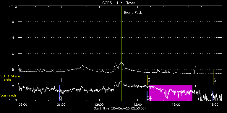 EIS Observation timeline overlay to GOES-Xray curve Code 1" 2" 40" 266" EIS Observations list for this event: STUDY ACRONYM ID DATE OBSERVED DESCRIPTION NOAA# TARGET 0 PRY_slot_contextLITE | 75546 | 2020/12/30 05:50:50 | Change of EIS pointing and alignment w | | Active Region TIMELINE ID DATE OBSERVED FITS FILE XCEN (+W/-E) YCEN (+N/-S) DUR ----------------------------------------------------------------------------------------------------------------- 75546 | 2020/12/30 05:50:50.000 | eis_l0_20201230_055050.fits.gz | -15.37 | -0.27 | 2m57s 1 XRT_synop_AIA | 75547 | 2020/12/30 05:54:05 | Change of EIS pointing and alignment w | | Quiet Sun TIMELINE ID DATE OBSERVED FITS FILE XCEN (+W/-E) YCEN (+N/-S) DUR ----------------------------------------------------------------------------------------------------------------- 75547 | 2020/12/30 05:54:05.000 | eis_l0_20201230_055405.fits.gz | -132.57 | -0.35 | 10s 2 PRY_slot_contextLITE | 75548 | 2020/12/30 12:42:27 | Change of EIS pointing and alignment w | | Active Region TIMELINE ID DATE OBSERVED FITS FILE XCEN (+W/-E) YCEN (+N/-S) DUR ----------------------------------------------------------------------------------------------------------------- 75548 | 2020/12/30 12:42:27.000 | eis_l0_20201230_124227.fits.gz | -15.29 | -0.35 | 2m56s 3 XRT_synop_AIA | 75549 | 2020/12/30 12:45:41 | Change of EIS pointing and alignment w | | Quiet Sun TIMELINE ID DATE OBSERVED FITS FILE XCEN (+W/-E) YCEN (+N/-S) DUR ----------------------------------------------------------------------------------------------------------------- 75549 | 2020/12/30 12:45:41.000 | eis_l0_20201230_124541.fits.gz | -132.49 | -0.35 | 11s 4 HPW021_VEL_240x512v2 | 75585 | 2020/12/30 12:52:33 | AR velocity study | | Quiet Sun TIMELINE ID DATE OBSERVED FITS FILE XCEN (+W/-E) YCEN (+N/-S) DUR ----------------------------------------------------------------------------------------------------------------- 75585 | 2020/12/30 12:52:33.000 | eis_l0_20201230_125233.fits.gz | 220.75 | -297.61 | 3h23m47s 5 PRY_slot_contextLITE | 75550 | 2020/12/30 17:52:33 | Change of EIS pointing and alignment w | | Active Region TIMELINE ID DATE OBSERVED FITS FILE XCEN (+W/-E) YCEN (+N/-S) DUR ----------------------------------------------------------------------------------------------------------------- 75550 | 2020/12/30 17:52:33.000 | eis_l0_20201230_175233.fits.gz | -15.14 | -0.58 | 2m57s 6 XRT_synop_AIA | 75551 | 2020/12/30 17:55:48 | Change of EIS pointing and alignment w | | Quiet Sun TIMELINE ID DATE OBSERVED FITS FILE XCEN (+W/-E) YCEN (+N/-S) DUR ----------------------------------------------------------------------------------------------------------------- 75551 | 2020/12/30 17:55:48.000 | eis_l0_20201230_175548.fits.gz | -132.57 | -0.50 | 10s : Check study information : Download file : View thumbnails For this event, also check for: