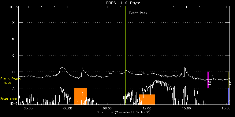 EIS Observation timeline overlay to GOES-Xray curve Code 1" 2" 40" 266" EIS Observations list for this event: STUDY ACRONYM ID DATE OBSERVED DESCRIPTION NOAA# TARGET 0 synop008 | 76061 | 2021/02/23 06:31:12 | Synoptic quiet Sun study | | Quiet Sun TIMELINE ID DATE OBSERVED FITS FILE XCEN (+W/-E) YCEN (+N/-S) DUR ----------------------------------------------------------------------------------------------------------------- 76061 | 2021/02/23 06:31:12.000 | eis_l0_20210223_063112.fits.gz | -1.31 | 37.12 | 54m28s 1 HOP81_new_study | 76107 | 2021/02/23 11:25:14 | HOP 206 - polar panorama map | | Coronal Hole TIMELINE ID DATE OBSERVED FITS FILE XCEN (+W/-E) YCEN (+N/-S) DUR ----------------------------------------------------------------------------------------------------------------- 76107 | 2021/02/23 11:25:14.000 | eis_l0_20210223_112514.fits.gz | -22.49 | -902.61 | 1h9m44s 2 regcal071 | 76103 | 2021/02/23 16:36:12 | Dark exposures, CCD bottom rows (100s | | Engineering TIMELINE ID DATE OBSERVED FITS FILE XCEN (+W/-E) YCEN (+N/-S) DUR ----------------------------------------------------------------------------------------------------------------- 76103 | 2021/02/23 16:36:12.000 | eis_l0_20210223_163612.fits.gz | -7.43 | -1264.45 | 3m22s 3 regcal072 | 76104 | 2021/02/23 16:40:01 | Dark exposures, top CCD rows (100s exp | | Engineering TIMELINE ID DATE OBSERVED FITS FILE XCEN (+W/-E) YCEN (+N/-S) DUR ----------------------------------------------------------------------------------------------------------------- 76104 | 2021/02/23 16:40:01.000 | eis_l0_20210223_164001.fits.gz | -7.43 | -753.53 | 3m22s 4 PRY_slot_contextLITE | 76072 | 2021/02/23 18:08:20 | Change in EIS pointing and alignment w | | Active Region TIMELINE ID DATE OBSERVED FITS FILE XCEN (+W/-E) YCEN (+N/-S) DUR ----------------------------------------------------------------------------------------------------------------- 76072 | 2021/02/23 18:08:20.000 | eis_l0_20210223_180820.fits.gz | -15.14 | -0.27 | 2m56s 5 XRT_synop_AIA | 76073 | 2021/02/23 18:11:35 | Changes in EIS pointing and algnment w | | Quiet Sun TIMELINE ID DATE OBSERVED FITS FILE XCEN (+W/-E) YCEN (+N/-S) DUR ----------------------------------------------------------------------------------------------------------------- 76073 | 2021/02/23 18:11:35.000 | eis_l0_20210223_181135.fits.gz | -132.57 | -0.42 | 10s : Check study information : Download file : View thumbnails For this event, also check for: