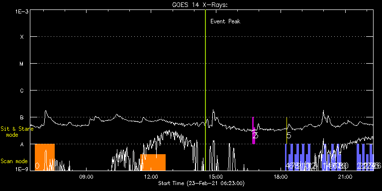 EIS Observation timeline overlay to GOES-Xray curve Code 1" 2" 40" 266" EIS Observations list for this event: STUDY ACRONYM ID DATE OBSERVED DESCRIPTION NOAA# TARGET 0 synop008 | 76061 | 2021/02/23 06:31:12 | Synoptic quiet Sun study | | Quiet Sun TIMELINE ID DATE OBSERVED FITS FILE XCEN (+W/-E) YCEN (+N/-S) DUR ----------------------------------------------------------------------------------------------------------------- 76061 | 2021/02/23 06:31:12.000 | eis_l0_20210223_063112.fits.gz | -1.31 | 37.12 | 54m28s 1 HOP81_new_study | 76107 | 2021/02/23 11:25:14 | HOP 206 - polar panorama map | | Coronal Hole TIMELINE ID DATE OBSERVED FITS FILE XCEN (+W/-E) YCEN (+N/-S) DUR ----------------------------------------------------------------------------------------------------------------- 76107 | 2021/02/23 11:25:14.000 | eis_l0_20210223_112514.fits.gz | -22.49 | -902.61 | 1h9m44s 2 regcal071 | 76103 | 2021/02/23 16:36:12 | Dark exposures, CCD bottom rows (100s | | Engineering TIMELINE ID DATE OBSERVED FITS FILE XCEN (+W/-E) YCEN (+N/-S) DUR ----------------------------------------------------------------------------------------------------------------- 76103 | 2021/02/23 16:36:12.000 | eis_l0_20210223_163612.fits.gz | -7.43 | -1264.45 | 3m22s 3 regcal072 | 76104 | 2021/02/23 16:40:01 | Dark exposures, top CCD rows (100s exp | | Engineering TIMELINE ID DATE OBSERVED FITS FILE XCEN (+W/-E) YCEN (+N/-S) DUR ----------------------------------------------------------------------------------------------------------------- 76104 | 2021/02/23 16:40:01.000 | eis_l0_20210223_164001.fits.gz | -7.43 | -753.53 | 3m22s 4 PRY_slot_contextLITE | 76072 | 2021/02/23 18:08:20 | Change in EIS pointing and alignment w | | Active Region TIMELINE ID DATE OBSERVED FITS FILE XCEN (+W/-E) YCEN (+N/-S) DUR ----------------------------------------------------------------------------------------------------------------- 76072 | 2021/02/23 18:08:20.000 | eis_l0_20210223_180820.fits.gz | -15.14 | -0.27 | 2m56s 5 XRT_synop_AIA | 76073 | 2021/02/23 18:11:35 | Changes in EIS pointing and algnment w | | Quiet Sun TIMELINE ID DATE OBSERVED FITS FILE XCEN (+W/-E) YCEN (+N/-S) DUR ----------------------------------------------------------------------------------------------------------------- 76073 | 2021/02/23 18:11:35.000 | eis_l0_20210223_181135.fits.gz | -132.57 | -0.42 | 10s 6 full_sun_slot_scan_2 | 76077 | 2021/02/23 18:17:57 | HOP 130 - full disk slot scan | | Quiet Sun TIMELINE ID DATE OBSERVED FITS FILE XCEN (+W/-E) YCEN (+N/-S) DUR ----------------------------------------------------------------------------------------------------------------- 76077 | 2021/02/23 18:17:57.000 | eis_l0_20210223_181757.fits.gz | 920.80 | 185.50 | 5m27s 7 full_sun_slot_scan_2 | 76078 | 2021/02/23 18:23:29 | HOP 130 - full disk slot scan | | Quiet Sun TIMELINE ID DATE OBSERVED FITS FILE XCEN (+W/-E) YCEN (+N/-S) DUR ----------------------------------------------------------------------------------------------------------------- 76078 | 2021/02/23 18:23:29.000 | eis_l0_20210223_182329.fits.gz | 920.64 | -286.42 | 5m27s 8 full_sun_slot_scan_2 | 76079 | 2021/02/23 18:33:43 | HOP 130 - full disk slot scan | | Quiet Sun TIMELINE ID DATE OBSERVED FITS FILE XCEN (+W/-E) YCEN (+N/-S) DUR ----------------------------------------------------------------------------------------------------------------- 76079 | 2021/02/23 18:33:43.000 | eis_l0_20210223_183343.fits.gz | 452.68 | 185.58 | 5m28s 9 full_sun_slot_scan_2 | 76080 | 2021/02/23 18:39:16 | HOP 130 - full disk slot scan | | Quiet Sun TIMELINE ID DATE OBSERVED FITS FILE XCEN (+W/-E) YCEN (+N/-S) DUR ----------------------------------------------------------------------------------------------------------------- 76080 | 2021/02/23 18:39:16.000 | eis_l0_20210223_183916.fits.gz | 452.68 | -286.58 | 5m27s 10 full_sun_slot_scan_2 | 76081 | 2021/02/23 18:49:43 | HOP 130 - full disk slot scan | | Quiet Sun TIMELINE ID DATE OBSERVED FITS FILE XCEN (+W/-E) YCEN (+N/-S) DUR ----------------------------------------------------------------------------------------------------------------- 76081 | 2021/02/23 18:49:43.000 | eis_l0_20210223_184943.fits.gz | -15.29 | 185.42 | 5m27s 11 full_sun_slot_scan_2 | 76082 | 2021/02/23 18:55:16 | HOP 130 - full disk slot scan | | Quiet Sun TIMELINE ID DATE OBSERVED FITS FILE XCEN (+W/-E) YCEN (+N/-S) DUR ----------------------------------------------------------------------------------------------------------------- 76082 | 2021/02/23 18:55:16.000 | eis_l0_20210223_185516.fits.gz | -15.29 | -286.50 | 5m26s 12 full_sun_slot_scan_2 | 76083 | 2021/02/23 19:05:43 | HOP 130 - full disk slot scan | | Quiet Sun TIMELINE ID DATE OBSERVED FITS FILE XCEN (+W/-E) YCEN (+N/-S) DUR ----------------------------------------------------------------------------------------------------------------- 76083 | 2021/02/23 19:05:43.000 | eis_l0_20210223_190543.fits.gz | -483.26 | 185.58 | 5m27s 13 full_sun_slot_scan_2 | 76084 | 2021/02/23 19:11:16 | HOP 130 - full disk slot scan | | Quiet Sun TIMELINE ID DATE OBSERVED FITS FILE XCEN (+W/-E) YCEN (+N/-S) DUR ----------------------------------------------------------------------------------------------------------------- 76084 | 2021/02/23 19:11:16.000 | eis_l0_20210223_191116.fits.gz | -483.26 | -286.42 | 5m26s 14 full_sun_slot_scan_2 | 76085 | 2021/02/23 19:50:13 | HOP 130 - full disk slot scan | | Quiet Sun TIMELINE ID DATE OBSERVED FITS FILE XCEN (+W/-E) YCEN (+N/-S) DUR ----------------------------------------------------------------------------------------------------------------- 76085 | 2021/02/23 19:50:13.000 | eis_l0_20210223_195013.fits.gz | -9884.69 | -9777.20 | 5m27s 15 full_sun_slot_scan_2 | 76086 | 2021/02/23 19:55:45 | HOP 130 - full disk slot scan | | Quiet Sun TIMELINE ID DATE OBSERVED FITS FILE XCEN (+W/-E) YCEN (+N/-S) DUR -------------------------------------------------------------------------------------------------------------