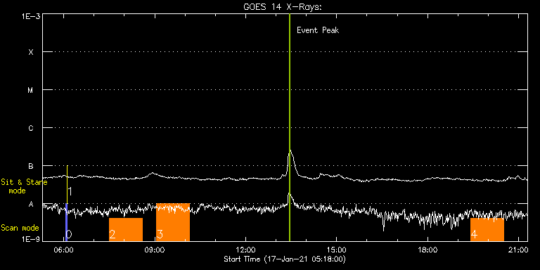 EIS Observation timeline overlay to GOES-Xray curve Code 1" 2" 40" 266" EIS Observations list for this event: STUDY ACRONYM ID DATE OBSERVED DESCRIPTION NOAA# TARGET 0 PRY_slot_contextLITE | 75716 | 2021/01/17 06:03:19 | Pointing Monitoring | | Active Region TIMELINE ID DATE OBSERVED FITS FILE XCEN (+W/-E) YCEN (+N/-S) DUR ----------------------------------------------------------------------------------------------------------------- 75716 | 2021/01/17 06:03:19.000 | eis_l0_20210117_060319.fits.gz | -15.29 | -0.50 | 2m57s 1 XRT_synop_AIA | 75717 | 2021/01/17 06:06:34 | Pointing Monitoring | | Quiet Sun TIMELINE ID DATE OBSERVED FITS FILE XCEN (+W/-E) YCEN (+N/-S) DUR ----------------------------------------------------------------------------------------------------------------- 75717 | 2021/01/17 06:06:34.000 | eis_l0_20210117_060634.fits.gz | -132.64 | -0.35 | 10s 2 DHB_007 | 75701 | 2021/01/17 07:29:49 | PSP perihelion: footpoint southwest (H | | Quiet Sun TIMELINE ID DATE OBSERVED FITS FILE XCEN (+W/-E) YCEN (+N/-S) DUR ----------------------------------------------------------------------------------------------------------------- 75701 | 2021/01/17 07:29:49.000 | eis_l0_20210117_072949.fits.gz | 480.11 | -385.76 | 1h5m24s 3 DHB_007 | 75702 | 2021/01/17 09:03:40 | PSP perihelion: Disk center (HOP410) | | Quiet Sun TIMELINE ID DATE OBSERVED FITS FILE XCEN (+W/-E) YCEN (+N/-S) DUR ----------------------------------------------------------------------------------------------------------------- 75702 | 2021/01/17 09:03:40.000 | eis_l0_20210117_090340.fits.gz | -33.00 | 3.58 | 1h5m24s 4 DHB_007 | 75703 | 2021/01/17 19:25:39 | PSP perihelion: Disk center (HOP410) | | Quiet Sun TIMELINE ID DATE OBSERVED FITS FILE XCEN (+W/-E) YCEN (+N/-S) DUR ----------------------------------------------------------------------------------------------------------------- 75703 | 2021/01/17 19:25:39.000 | eis_l0_20210117_192539.fits.gz | -32.92 | 3.50 | 1h5m24s : Check study information : Download file : View thumbnails For this event, also check for: