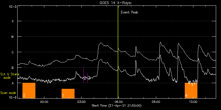 EIS Observation timeline overlay to GOES-Xray curve Code 1" 2" 40" 266" EIS Observations list for this event: STUDY ACRONYM ID DATE OBSERVED DESCRIPTION NOAA# TARGET 0 HPW021VEL260x512v2 | 76855 | 2021/04/21 22:15:13 | HOP407 Solar Orbitor | 2818 | Active Region TIMELINE ID DATE OBSERVED FITS FILE XCEN (+W/-E) YCEN (+N/-S) DUR ----------------------------------------------------------------------------------------------------------------- 76855 | 2021/04/21 22:15:13.000 | eis_l0_20210421_221513.fits.gz | -796.84 | -291.03 | 1h0m45s 1 HPW021VEL260x512v2 | 76856 | 2021/04/22 01:24:13 | HOP407 Solar Orbitor | | Active Region TIMELINE ID DATE OBSERVED FITS FILE XCEN (+W/-E) YCEN (+N/-S) DUR ----------------------------------------------------------------------------------------------------------------- 76856 | 2021/04/22 01:24:13.000 | eis_l0_20210422_012413.fits.gz | -784.17 | -289.02 | 1h0m44s 2 regcal078 | 76862 | 2021/04/22 03:09:44 | Dark exposures, 0s, 2 exposures, botto | | Engineering TIMELINE ID DATE OBSERVED FITS FILE XCEN (+W/-E) YCEN (+N/-S) DUR ----------------------------------------------------------------------------------------------------------------- 76862 | 2021/04/22 03:09:44.000 | eis_l0_20210422_030944.fits.gz | 14.59 | -305.50 | 2s 3 regcal079 | 76863 | 2021/04/22 03:29:26 | Dark exposures, 0s, 2 exposures, top c | | Engineering TIMELINE ID DATE OBSERVED FITS FILE XCEN (+W/-E) YCEN (+N/-S) DUR ----------------------------------------------------------------------------------------------------------------- 76863 | 2021/04/22 03:29:26.000 | eis_l0_20210422_032926.fits.gz | 14.51 | 205.58 | 2s 4 HPW021VEL260x512v2 | 76878 | 2021/04/22 11:19:09 | Eastern AR Obs | 2818 | Active Region TIMELINE ID DATE OBSERVED FITS FILE XCEN (+W/-E) YCEN (+N/-S) DUR ----------------------------------------------------------------------------------------------------------------- 76878 | 2021/04/22 11:19:09.000 | eis_l0_20210422_111909.fits.gz | -697.03 | -284.85 | 1h0m44s : Check study information : Download file : View thumbnails For this event, also check for: