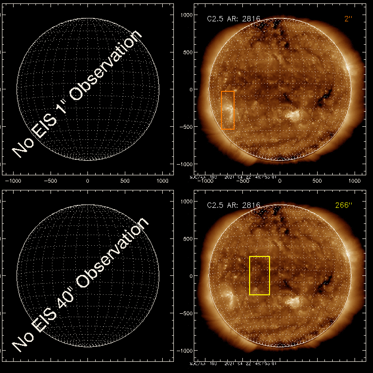 EIS Observation timeline overlay to GOES-Xray curve Code 1" 2" 40" 266" EIS Observations list for this event: STUDY ACRONYM ID DATE OBSERVED DESCRIPTION NOAA# TARGET 0 HPW021VEL260x512v2 | 76878 | 2021/04/22 11:19:09 | Eastern AR Obs | 2818 | Active Region TIMELINE ID DATE OBSERVED FITS FILE XCEN (+W/-E) YCEN (+N/-S) DUR ----------------------------------------------------------------------------------------------------------------- 76878 | 2021/04/22 11:19:09.000 | eis_l0_20210422_111909.fits.gz | -697.03 | -284.85 | 1h0m44s 1 HPW021VEL260x512v2 | 76888 | 2021/04/22 14:32:18 | Solar Orbitor with IRIS/EIS | | Active Region TIMELINE ID DATE OBSERVED FITS FILE XCEN (+W/-E) YCEN (+N/-S) DUR ----------------------------------------------------------------------------------------------------------------- 76888 | 2021/04/22 14:32:18.000 | eis_l0_20210422_143218.fits.gz | -9895.16 | -9963.20 | 1h0m44s 2 HPW021VEL260x512v2 | 76889 | 2021/04/22 16:10:54 | Solar Orbitor with IRIS/EIS | | Active Region TIMELINE ID DATE OBSERVED FITS FILE XCEN (+W/-E) YCEN (+N/-S) DUR ----------------------------------------------------------------------------------------------------------------- 76889 | 2021/04/22 16:10:54.000 | eis_l0_20210422_161054.fits.gz | -9895.16 | -9963.20 | 1h0m45s 3 XRT_synop_AIA | 76885 | 2021/04/22 18:00:34 | | | Quiet Sun TIMELINE ID DATE OBSERVED FITS FILE XCEN (+W/-E) YCEN (+N/-S) DUR ----------------------------------------------------------------------------------------------------------------- 76885 | 2021/04/22 18:00:34.000 | eis_l0_20210422_180034.fits.gz | -269.37 | -0.73 | 10s 4 HPW021VEL260x512v2 | 76890 | 2021/04/22 19:36:05 | Solar Orbitor with IRIS/EIS | | Active Region TIMELINE ID DATE OBSERVED FITS FILE XCEN (+W/-E) YCEN (+N/-S) DUR ----------------------------------------------------------------------------------------------------------------- 76890 | 2021/04/22 19:36:05.000 | eis_l0_20210422_193605.fits.gz | -9895.16 | -9963.20 | 1h0m44s 5 HPW021VEL260x512v2 | 76891 | 2021/04/22 21:10:37 | Solar Orbitor with IRIS/EIS | | Active Region TIMELINE ID DATE OBSERVED FITS FILE XCEN (+W/-E) YCEN (+N/-S) DUR ----------------------------------------------------------------------------------------------------------------- 76891 | 2021/04/22 21:10:37.000 | eis_l0_20210422_211037.fits.gz | -9895.16 | -9963.20 | 1h0m45s : Check study information : Download file : View thumbnails For this event, also check for: