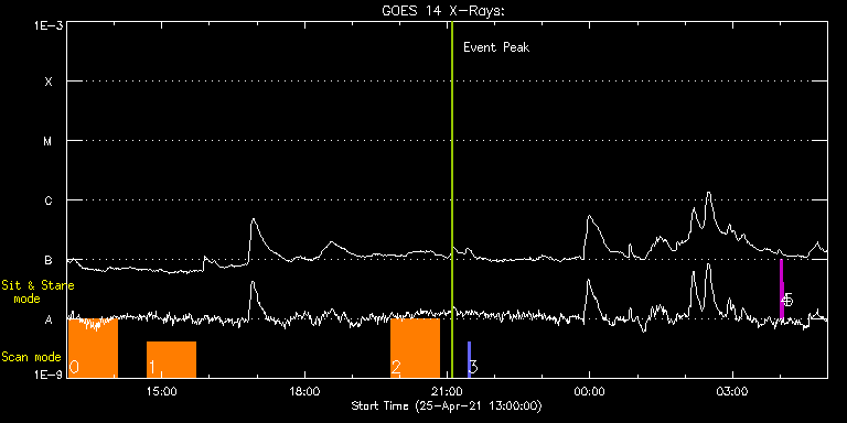 EIS Observation timeline overlay to GOES-Xray curve Code 1" 2" 40" 266" EIS Observations list for this event: STUDY ACRONYM ID DATE OBSERVED DESCRIPTION NOAA# TARGET 0 HPW021VEL260x512v2 | 76921 | 2021/04/25 13:03:13 | HOP407 (Solar Orbiter/SPICE observatio | | Active Region TIMELINE ID DATE OBSERVED FITS FILE XCEN (+W/-E) YCEN (+N/-S) DUR ----------------------------------------------------------------------------------------------------------------- 76921 | 2021/04/25 13:03:13.000 | eis_l0_20210425_130313.fits.gz | -9915.13 | -9972.20 | 1h0m44s 1 HPW021VEL260x512v2 | 76913 | 2021/04/25 14:41:43 | HOP407 (Solar Orbiter/SPICE observatio | | Active Region TIMELINE ID DATE OBSERVED FITS FILE XCEN (+W/-E) YCEN (+N/-S) DUR ----------------------------------------------------------------------------------------------------------------- 76913 | 2021/04/25 14:41:43.000 | eis_l0_20210425_144143.fits.gz | -9915.13 | -9972.20 | 1h0m44s 2 dhb_atlas_120m_30" | 76933 | 2021/04/25 19:49:12 | QS observation support SOT | | Quiet Sun TIMELINE ID DATE OBSERVED FITS FILE XCEN (+W/-E) YCEN (+N/-S) DUR ----------------------------------------------------------------------------------------------------------------- 76933 | 2021/04/25 19:49:12.000 | eis_l0_20210425_194912.fits.gz | -12.13 | 751.53 | 1h0m50s 3 PRY_slot_contextLITE | 76932 | 2021/04/25 21:26:19 | QS Study | | Active Region TIMELINE ID DATE OBSERVED FITS FILE XCEN (+W/-E) YCEN (+N/-S) DUR ----------------------------------------------------------------------------------------------------------------- 76932 | 2021/04/25 21:26:19.000 | eis_l0_20210425_212619.fits.gz | -17.21 | 751.61 | 2m57s 4 regcal074 | 76929 | 2021/04/26 04:00:11 | Dark exposures including overscan pixe | | Engineering TIMELINE ID DATE OBSERVED FITS FILE XCEN (+W/-E) YCEN (+N/-S) DUR ----------------------------------------------------------------------------------------------------------------- 76929 | 2021/04/26 04:00:11.000 | eis_l0_20210426_040011.fits.gz | 14.59 | 205.58 | 3m21s 5 regcal076 | 76931 | 2021/04/26 04:04:00 | Flatfield, 1 exposure, led 100ms, ccd | | Engineering TIMELINE ID DATE OBSERVED FITS FILE XCEN (+W/-E) YCEN (+N/-S) DUR ----------------------------------------------------------------------------------------------------------------- 76931 | 2021/04/26 04:04:00.000 | eis_l0_20210426_040400.fits.gz | 14.51 | -50.50 | 1s : Check study information : Download file : View thumbnails For this event, also check for: