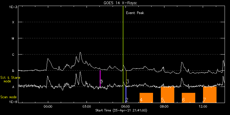 EIS Observation timeline overlay to GOES-Xray curve Code 1" 2" 40" 266" EIS Observations list for this event: STUDY ACRONYM ID DATE OBSERVED DESCRIPTION NOAA# TARGET 0 regcal074 | 76929 | 2021/04/26 04:00:11 | Dark exposures including overscan pixe | | Engineering TIMELINE ID DATE OBSERVED FITS FILE XCEN (+W/-E) YCEN (+N/-S) DUR ----------------------------------------------------------------------------------------------------------------- 76929 | 2021/04/26 04:00:11.000 | eis_l0_20210426_040011.fits.gz | 14.59 | 205.58 | 3m21s 1 regcal076 | 76931 | 2021/04/26 04:04:00 | Flatfield, 1 exposure, led 100ms, ccd | | Engineering TIMELINE ID DATE OBSERVED FITS FILE XCEN (+W/-E) YCEN (+N/-S) DUR ----------------------------------------------------------------------------------------------------------------- 76931 | 2021/04/26 04:04:00.000 | eis_l0_20210426_040400.fits.gz | 14.51 | -50.50 | 1s 2 PRY_slot_contextLITE | 76925 | 2021/04/26 06:00:12 | Pointing Monitoring | 2818 | Active Region TIMELINE ID DATE OBSERVED FITS FILE XCEN (+W/-E) YCEN (+N/-S) DUR ----------------------------------------------------------------------------------------------------------------- 76925 | 2021/04/26 06:00:12.000 | eis_l0_20210426_060012.fits.gz | -15.21 | -0.50 | 2m57s 3 XRT_synop_AIA | 76926 | 2021/04/26 06:03:27 | Pointing Monitoring | | Quiet Sun TIMELINE ID DATE OBSERVED FITS FILE XCEN (+W/-E) YCEN (+N/-S) DUR ----------------------------------------------------------------------------------------------------------------- 76926 | 2021/04/26 06:03:27.000 | eis_l0_20210426_060327.fits.gz | -132.57 | -0.42 | 10s 4 Atlas_60 | 76916 | 2021/04/26 07:05:49 | HOP407 (Solar Orbiter/SPICE observatio | | Quiet Sun TIMELINE ID DATE OBSERVED FITS FILE XCEN (+W/-E) YCEN (+N/-S) DUR ----------------------------------------------------------------------------------------------------------------- 76916 | 2021/04/26 07:05:49.000 | eis_l0_20210426_070549.fits.gz | -9914.88 | -10052.20 | 1h1m39s 5 Atlas_60 | 76917 | 2021/04/26 08:44:39 | HOP407 (Solar Orbiter/SPICE observatio | | Quiet Sun TIMELINE ID DATE OBSERVED FITS FILE XCEN (+W/-E) YCEN (+N/-S) DUR ----------------------------------------------------------------------------------------------------------------- 76917 | 2021/04/26 08:44:39.000 | eis_l0_20210426_084439.fits.gz | -9914.88 | -9892.20 | 1h1m40s 6 HPW021VEL260x512v2 | 76918 | 2021/04/26 10:22:42 | HOP407 (Solar Orbiter/SPICE observatio | | Active Region TIMELINE ID DATE OBSERVED FITS FILE XCEN (+W/-E) YCEN (+N/-S) DUR ----------------------------------------------------------------------------------------------------------------- 76918 | 2021/04/26 10:22:42.000 | eis_l0_20210426_102242.fits.gz | -9915.38 | -9972.20 | 1h0m45s 7 HPW021VEL260x512v2 | 76919 | 2021/04/26 12:01:12 | HOP407 (Solar Orbiter/SPICE observatio | | Active Region TIMELINE ID DATE OBSERVED FITS FILE XCEN (+W/-E) YCEN (+N/-S) DUR ----------------------------------------------------------------------------------------------------------------- 76919 | 2021/04/26 12:01:12.000 | eis_l0_20210426_120112.fits.gz | -9915.38 | -9972.20 | 1h0m45s : Check study information : Download file : View thumbnails For this event, also check for: