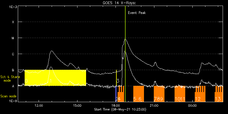 EIS Observation timeline overlay to GOES-Xray curve Code 1" 2" 40" 266" EIS Observations list for this event: STUDY ACRONYM ID DATE OBSERVED DESCRIPTION NOAA# TARGET 0 Flare266_Hunter01 | 77120 | 2021/05/08 10:54:34 | Flare Hunter | | Flare TIMELINE ID DATE OBSERVED FITS FILE XCEN (+W/-E) YCEN (+N/-S) DUR ----------------------------------------------------------------------------------------------------------------- 77120 | 2021/05/08 10:54:34.000 | eis_l0_20210508_105434.fits.gz | -986.45 | 311.57 | 56m23s 77120 | 2021/05/08 11:51:49.000 | eis_l0_20210508_115149.fits.gz | -983.36 | 312.03 | 56m22s 77120 | 2021/05/08 12:49:03.000 | eis_l0_20210508_124903.fits.gz | -980.27 | 312.49 | 56m23s 77120 | 2021/05/08 13:46:18.000 | eis_l0_20210508_134618.fits.gz | -977.18 | 312.95 | 56m22s 77120 | 2021/05/08 14:43:32.000 | eis_l0_20210508_144332.fits.gz | -974.01 | 313.42 | 56m23s 1 Flare266_Hunter01 | 77120 | 2021/05/08 10:54:34 | Flare Hunter | | Flare TIMELINE ID DATE OBSERVED FITS FILE XCEN (+W/-E) YCEN (+N/-S) DUR ----------------------------------------------------------------------------------------------------------------- 77120 | 2021/05/08 10:54:34.000 | eis_l0_20210508_105434.fits.gz | -986.45 | 311.57 | 56m23s 77120 | 2021/05/08 11:51:49.000 | eis_l0_20210508_115149.fits.gz | -983.36 | 312.03 | 56m22s 77120 | 2021/05/08 12:49:03.000 | eis_l0_20210508_124903.fits.gz | -980.27 | 312.49 | 56m23s 77120 | 2021/05/08 13:46:18.000 | eis_l0_20210508_134618.fits.gz | -977.18 | 312.95 | 56m22s 77120 | 2021/05/08 14:43:32.000 | eis_l0_20210508_144332.fits.gz | -974.01 | 313.42 | 56m23s 2 PRY_slot_contextLITE | 77096 | 2021/05/08 17:59:58 | Pointing monitoring. | | Active Region TIMELINE ID DATE OBSERVED FITS FILE XCEN (+W/-E) YCEN (+N/-S) DUR ----------------------------------------------------------------------------------------------------------------- 77096 | 2021/05/08 17:59:58.000 | eis_l0_20210508_175958.fits.gz | -15.14 | -0.50 | 2m56s 3 XRT_synop_AIA | 77097 | 2021/05/08 18:03:12 | Pointing monitoring. | | Quiet Sun TIMELINE ID DATE OBSERVED FITS FILE XCEN (+W/-E) YCEN (+N/-S) DUR ----------------------------------------------------------------------------------------------------------------- 77097 | 2021/05/08 18:03:12.000 | eis_l0_20210508_180312.fits.gz | -132.49 | -0.35 | 10s 4 EL_DHB_01 | 77086 | 2021/05/08 18:09:50 | HOP395 | | Flare TIMELINE ID DATE OBSERVED FITS FILE XCEN (+W/-E) YCEN (+N/-S) DUR ----------------------------------------------------------------------------------------------------------------- 77086 | 2021/05/08 18:09:50.000 | eis_l0_20210508_180950.fits.gz | -829.93 | 313.89 | 4m50s 77086 | 2021/05/08 18:14:43.000 | eis_l0_20210508_181443.fits.gz | -829.62 | 313.89 | 4m51s 77086 | 2021/05/08 18:19:36.000 | eis_l0_20210508_181936.fits.gz | -829.31 | 314.04 | 4m51s 77086 | 2021/05/08 18:24:29.000 | eis_l0_20210508_182429.fits.gz | -829.08 | 314.04 | 4m50s 77086 | 2021/05/08 18:29:22.000 | eis_l0_20210508_182922.fits.gz | -828.61 | 313.96 | 4m50s 77086 | 2021/05/08 18:34:15.000 | eis_l0_20210508_183415.fits.gz | -828.38 | 314.04 | 4m50s 5 EL_DHB_01 | 77106 | 2021/05/08 19:22:41 | HOP395 | | Flare TIMELINE ID DATE OBSERVED FITS FILE XCEN (+W/-E) YCEN (+N/-S) DUR ----------------------------------------------------------------------------------------------------------------- 77106 | 2021/05/08 19:22:41.000 | eis_l0_20210508_192241.fits.gz | -825.53 | 314.43 | 4m50s 77106 | 2021/05/08 19:27:34.000 | eis_l0_20210508_192734.fits.gz | -825.22 | 314.58 | 4m50s 77106 | 2021/05/08 19:32:27.000 | eis_l0_20210508_193227.fits.gz | -824.83 | 314.58 | 4m50s 77106 | 2021/05/08 19:37:20.000 | eis_l0_20210508_193720.fits.gz | -824.52 | 314.58 | 4m50s 77106 | 2021/05/08 19:42:13.000 | eis_l0_20210508_194213.fits.gz | -824.29 | 314.58 | 4m50s 77106 | 2021/05/08 19:47:06.000 | eis_l0_20210508_194706.fits.gz | -824.06 | 314.58 | 4m50s 77106 | 2021/05/08 19:51:59.000 | eis_l0_20210508_195159.fits.gz | -823.75 | 314.66 | 4m50s 77106 | 2021/05/08 19:56:52.000 | eis_l0_20210508_195652.fits.gz | -823.36 | 314.74 | 4m50s 77106 | 2021/05/08 20:01:45.000 | eis_l0_20210508_200145.fits.gz | -823.05 | 314.81 | 4m50s 77106 | 2021/05/08 20:06:37.000 | eis_l0_20210508_200637.fits.gz | -822.74 | 314.81 | 4m50s 6 EL_DHB_01 | 77106 | 2021/05/08 19:22:41 | HOP395 | | Flare TIMELINE ID DATE OBSERVED FITS FILE XCEN (+W/-E) YCEN (+N/-S) DUR ----------------------------------------------------------------------------------------------------------------- 77106 | 2021/05/08 19:22:41.000 | eis_l0_20210508_192241.fits.gz | -825.53 | 314.43 | 4m50s 77106 | 2021/05/08 19:27:34.000 | eis_l0_20210508_192734.fits.gz | -825.22 | 314.58 | 4m50s 77106 | 2021/05/08 19:32:27.000 | eis_l0_20210508_193227.fits.gz | -824.83 | 314.58 | 4m50s 77106 | 2021/05/08 19:37:20.000 | eis_l0_20210508_193720.fits.gz | -824.52 | 314.58 | 4m50s 77106 | 2021/05/08 19:42:13.000 | eis_l0_20210508_194213.fits.gz | -824.29 | 314.58 | 4m50s 77106 | 2021/05/08 19:47:06.000 | eis_l0_20210508_194706.fits.gz | -824.06 | 314.58 | 4m50s 77106 | 2021/05/08 19:51:59.000 | eis_l0_20210508_195159.fits.gz | -823.75 | 314.66 | 4m50s 77106 | 2021/05/08 19:56:52.000 | eis_l0_20210508_195652.fits.gz | -823.36 | 314.74 | 4m50s 77106 | 2021/05/08 20:01:45.000 | eis_l0_20210508_200145.fits.gz | -823.05 | 314.81 | 4m50s 77106 | 2021/05/08 20:06:37.000 | eis_l0_20210508_200637.fits.gz | -822.74 | 314.81 | 4m50s 7 EL_DHB_01 | 77107 | 2021/05/08 20:59:41 | HOP395 | | Flare TIMELINE ID DATE OBSERVED FITS FILE XCEN (+W/-E) YCEN (+N/-S) DUR ----------------------------------------------------------------------------------------------------------------- 77107 | 2021/05/08 20:59:41.000 | eis_l0_20210508_205941.fits.gz | -819.42 | 315.20 | 4m39s 77107 | 2021/05/08 21:04:34.000 | eis_l0_20210508_210434.fits.gz | -819.11 | 315.28 | 4m50s 77107 | 2021/05/08 21:09:27.000 | eis_l0_20210508_210927.fits.gz | -818.80 | 315.28 | 4m50s 77107 | 2021/05/08 21:14:20.000 | eis_l0_20210
