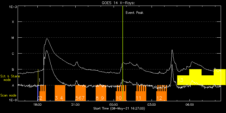 EIS Observation timeline overlay to GOES-Xray curve Code 1" 2" 40" 266" EIS Observations list for this event: STUDY ACRONYM ID DATE OBSERVED DESCRIPTION NOAA# TARGET 0 PRY_slot_contextLITE | 77096 | 2021/05/08 17:59:58 | Pointing monitoring. | | Active Region TIMELINE ID DATE OBSERVED FITS FILE XCEN (+W/-E) YCEN (+N/-S) DUR ----------------------------------------------------------------------------------------------------------------- 77096 | 2021/05/08 17:59:58.000 | eis_l0_20210508_175958.fits.gz | -15.14 | -0.50 | 2m56s 1 XRT_synop_AIA | 77097 | 2021/05/08 18:03:12 | Pointing monitoring. | | Quiet Sun TIMELINE ID DATE OBSERVED FITS FILE XCEN (+W/-E) YCEN (+N/-S) DUR ----------------------------------------------------------------------------------------------------------------- 77097 | 2021/05/08 18:03:12.000 | eis_l0_20210508_180312.fits.gz | -132.49 | -0.35 | 10s 2 EL_DHB_01 | 77086 | 2021/05/08 18:09:50 | HOP395 | | Flare TIMELINE ID DATE OBSERVED FITS FILE XCEN (+W/-E) YCEN (+N/-S) DUR ----------------------------------------------------------------------------------------------------------------- 77086 | 2021/05/08 18:09:50.000 | eis_l0_20210508_180950.fits.gz | -829.93 | 313.89 | 4m50s 77086 | 2021/05/08 18:14:43.000 | eis_l0_20210508_181443.fits.gz | -829.62 | 313.89 | 4m51s 77086 | 2021/05/08 18:19:36.000 | eis_l0_20210508_181936.fits.gz | -829.31 | 314.04 | 4m51s 77086 | 2021/05/08 18:24:29.000 | eis_l0_20210508_182429.fits.gz | -829.08 | 314.04 | 4m50s 77086 | 2021/05/08 18:29:22.000 | eis_l0_20210508_182922.fits.gz | -828.61 | 313.96 | 4m50s 77086 | 2021/05/08 18:34:15.000 | eis_l0_20210508_183415.fits.gz | -828.38 | 314.04 | 4m50s 3 EL_DHB_01 | 77106 | 2021/05/08 19:22:41 | HOP395 | | Flare TIMELINE ID DATE OBSERVED FITS FILE XCEN (+W/-E) YCEN (+N/-S) DUR ----------------------------------------------------------------------------------------------------------------- 77106 | 2021/05/08 19:22:41.000 | eis_l0_20210508_192241.fits.gz | -825.53 | 314.43 | 4m50s 77106 | 2021/05/08 19:27:34.000 | eis_l0_20210508_192734.fits.gz | -825.22 | 314.58 | 4m50s 77106 | 2021/05/08 19:32:27.000 | eis_l0_20210508_193227.fits.gz | -824.83 | 314.58 | 4m50s 77106 | 2021/05/08 19:37:20.000 | eis_l0_20210508_193720.fits.gz | -824.52 | 314.58 | 4m50s 77106 | 2021/05/08 19:42:13.000 | eis_l0_20210508_194213.fits.gz | -824.29 | 314.58 | 4m50s 77106 | 2021/05/08 19:47:06.000 | eis_l0_20210508_194706.fits.gz | -824.06 | 314.58 | 4m50s 77106 | 2021/05/08 19:51:59.000 | eis_l0_20210508_195159.fits.gz | -823.75 | 314.66 | 4m50s 77106 | 2021/05/08 19:56:52.000 | eis_l0_20210508_195652.fits.gz | -823.36 | 314.74 | 4m50s 77106 | 2021/05/08 20:01:45.000 | eis_l0_20210508_200145.fits.gz | -823.05 | 314.81 | 4m50s 77106 | 2021/05/08 20:06:37.000 | eis_l0_20210508_200637.fits.gz | -822.74 | 314.81 | 4m50s 4 EL_DHB_01 | 77106 | 2021/05/08 19:22:41 | HOP395 | | Flare TIMELINE ID DATE OBSERVED FITS FILE XCEN (+W/-E) YCEN (+N/-S) DUR ----------------------------------------------------------------------------------------------------------------- 77106 | 2021/05/08 19:22:41.000 | eis_l0_20210508_192241.fits.gz | -825.53 | 314.43 | 4m50s 77106 | 2021/05/08 19:27:34.000 | eis_l0_20210508_192734.fits.gz | -825.22 | 314.58 | 4m50s 77106 | 2021/05/08 19:32:27.000 | eis_l0_20210508_193227.fits.gz | -824.83 | 314.58 | 4m50s 77106 | 2021/05/08 19:37:20.000 | eis_l0_20210508_193720.fits.gz | -824.52 | 314.58 | 4m50s 77106 | 2021/05/08 19:42:13.000 | eis_l0_20210508_194213.fits.gz | -824.29 | 314.58 | 4m50s 77106 | 2021/05/08 19:47:06.000 | eis_l0_20210508_194706.fits.gz | -824.06 | 314.58 | 4m50s 77106 | 2021/05/08 19:51:59.000 | eis_l0_20210508_195159.fits.gz | -823.75 | 314.66 | 4m50s 77106 | 2021/05/08 19:56:52.000 | eis_l0_20210508_195652.fits.gz | -823.36 | 314.74 | 4m50s 77106 | 2021/05/08 20:01:45.000 | eis_l0_20210508_200145.fits.gz | -823.05 | 314.81 | 4m50s 77106 | 2021/05/08 20:06:37.000 | eis_l0_20210508_200637.fits.gz | -822.74 | 314.81 | 4m50s 5 EL_DHB_01 | 77107 | 2021/05/08 20:59:41 | HOP395 | | Flare TIMELINE ID DATE OBSERVED FITS FILE XCEN (+W/-E) YCEN (+N/-S) DUR ----------------------------------------------------------------------------------------------------------------- 77107 | 2021/05/08 20:59:41.000 | eis_l0_20210508_205941.fits.gz | -819.42 | 315.20 | 4m39s 77107 | 2021/05/08 21:04:34.000 | eis_l0_20210508_210434.fits.gz | -819.11 | 315.28 | 4m50s 77107 | 2021/05/08 21:09:27.000 | eis_l0_20210508_210927.fits.gz | -818.80 | 315.28 | 4m50s 77107 | 2021/05/08 21:14:20.000 | eis_l0_20210508_211420.fits.gz | -818.42 | 315.43 | 4m51s 77107 | 2021/05/08 21:19:13.000 | eis_l0_20210508_211913.fits.gz | -818.19 | 315.35 | 4m50s 77107 | 2021/05/08 21:24:06.000 | eis_l0_20210508_212406.fits.gz | -817.88 | 315.35 | 4m50s 77107 | 2021/05/08 21:28:59.000 | eis_l0_20210508_212859.fits.gz | -817.65 | 315.51 | 4m50s 77107 | 2021/05/08 21:33:52.000 | eis_l0_20210508_213352.fits.gz | -817.26 | 315.51 | 4m50s 77107 | 2021/05/08 21:38:45.000 | eis_l0_20210508_213845.fits.gz | -816.95 | 315.59 | 4m50s 77107 | 2021/05/08 21:43:38.000 | eis_l0_20210508_214338.fits.gz | -816.64 | 315.51 | 4m50s 6 EL_DHB_01 | 77107 | 2021/05/08 21:33:52 | HOP395 | | Flare TIMELINE ID DATE OBSERVED FITS FILE XCEN (+W/-E) YCEN (+N/-S) DUR ----------------------------------------------------------------------------------------------------------------- 77107 | 2021/05/08 20:59:41.000 | eis_l0_20210508_205941.fits.gz | -819.42 | 315.20 | 4m39s 77107 | 2021/05/08 21:04:34.000 | eis_l0_20210508_210434.fits.gz | -819.11 | 315.28 | 4m50s 77107 | 2021/05/08 21:09:27.000 | eis_l0_20210508_210927.fits.gz | -818.80 | 315.28 | 4m50s 77107 | 2021/05/08 21:14:20.000 | eis_l0_20210508_211420.fits.gz | -818.42 | 315.43 | 4m51s 77107 | 2021/05/08 21:19:13.000 | eis_l0_20210508_211913.fits.gz | -818.19 | 315.35 | 4m50s 77107 | 2021/05/08 21:24:06.000 | eis_l0_20210508_212406.fits.gz | -817.88 | 315.35 | 4m50s 77107 | 2021/05/08 21:28:59.000 | eis_l0_20210508