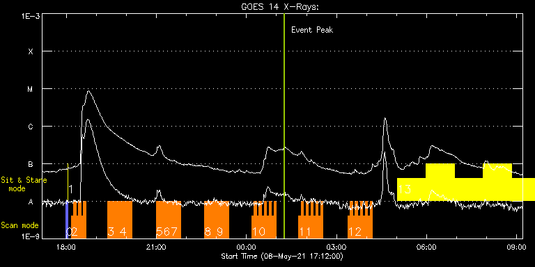 EIS Observation timeline overlay to GOES-Xray curve Code 1" 2" 40" 266" EIS Observations list for this event: STUDY ACRONYM ID DATE OBSERVED DESCRIPTION NOAA# TARGET 0 PRY_slot_contextLITE | 77096 | 2021/05/08 17:59:58 | Pointing monitoring. | | Active Region TIMELINE ID DATE OBSERVED FITS FILE XCEN (+W/-E) YCEN (+N/-S) DUR ----------------------------------------------------------------------------------------------------------------- 77096 | 2021/05/08 17:59:58.000 | eis_l0_20210508_175958.fits.gz | -15.14 | -0.50 | 2m56s 1 XRT_synop_AIA | 77097 | 2021/05/08 18:03:12 | Pointing monitoring. | | Quiet Sun TIMELINE ID DATE OBSERVED FITS FILE XCEN (+W/-E) YCEN (+N/-S) DUR ----------------------------------------------------------------------------------------------------------------- 77097 | 2021/05/08 18:03:12.000 | eis_l0_20210508_180312.fits.gz | -132.49 | -0.35 | 10s 2 EL_DHB_01 | 77086 | 2021/05/08 18:09:50 | HOP395 | | Flare TIMELINE ID DATE OBSERVED FITS FILE XCEN (+W/-E) YCEN (+N/-S) DUR ----------------------------------------------------------------------------------------------------------------- 77086 | 2021/05/08 18:09:50.000 | eis_l0_20210508_180950.fits.gz | -829.93 | 313.89 | 4m50s 77086 | 2021/05/08 18:14:43.000 | eis_l0_20210508_181443.fits.gz | -829.62 | 313.89 | 4m51s 77086 | 2021/05/08 18:19:36.000 | eis_l0_20210508_181936.fits.gz | -829.31 | 314.04 | 4m51s 77086 | 2021/05/08 18:24:29.000 | eis_l0_20210508_182429.fits.gz | -829.08 | 314.04 | 4m50s 77086 | 2021/05/08 18:29:22.000 | eis_l0_20210508_182922.fits.gz | -828.61 | 313.96 | 4m50s 77086 | 2021/05/08 18:34:15.000 | eis_l0_20210508_183415.fits.gz | -828.38 | 314.04 | 4m50s 3 EL_DHB_01 | 77106 | 2021/05/08 19:22:41 | HOP395 | | Flare TIMELINE ID DATE OBSERVED FITS FILE XCEN (+W/-E) YCEN (+N/-S) DUR ----------------------------------------------------------------------------------------------------------------- 77106 | 2021/05/08 19:22:41.000 | eis_l0_20210508_192241.fits.gz | -825.53 | 314.43 | 4m50s 77106 | 2021/05/08 19:27:34.000 | eis_l0_20210508_192734.fits.gz | -825.22 | 314.58 | 4m50s 77106 | 2021/05/08 19:32:27.000 | eis_l0_20210508_193227.fits.gz | -824.83 | 314.58 | 4m50s 77106 | 2021/05/08 19:37:20.000 | eis_l0_20210508_193720.fits.gz | -824.52 | 314.58 | 4m50s 77106 | 2021/05/08 19:42:13.000 | eis_l0_20210508_194213.fits.gz | -824.29 | 314.58 | 4m50s 77106 | 2021/05/08 19:47:06.000 | eis_l0_20210508_194706.fits.gz | -824.06 | 314.58 | 4m50s 77106 | 2021/05/08 19:51:59.000 | eis_l0_20210508_195159.fits.gz | -823.75 | 314.66 | 4m50s 77106 | 2021/05/08 19:56:52.000 | eis_l0_20210508_195652.fits.gz | -823.36 | 314.74 | 4m50s 77106 | 2021/05/08 20:01:45.000 | eis_l0_20210508_200145.fits.gz | -823.05 | 314.81 | 4m50s 77106 | 2021/05/08 20:06:37.000 | eis_l0_20210508_200637.fits.gz | -822.74 | 314.81 | 4m50s 4 EL_DHB_01 | 77106 | 2021/05/08 19:22:41 | HOP395 | | Flare TIMELINE ID DATE OBSERVED FITS FILE XCEN (+W/-E) YCEN (+N/-S) DUR ----------------------------------------------------------------------------------------------------------------- 77106 | 2021/05/08 19:22:41.000 | eis_l0_20210508_192241.fits.gz | -825.53 | 314.43 | 4m50s 77106 | 2021/05/08 19:27:34.000 | eis_l0_20210508_192734.fits.gz | -825.22 | 314.58 | 4m50s 77106 | 2021/05/08 19:32:27.000 | eis_l0_20210508_193227.fits.gz | -824.83 | 314.58 | 4m50s 77106 | 2021/05/08 19:37:20.000 | eis_l0_20210508_193720.fits.gz | -824.52 | 314.58 | 4m50s 77106 | 2021/05/08 19:42:13.000 | eis_l0_20210508_194213.fits.gz | -824.29 | 314.58 | 4m50s 77106 | 2021/05/08 19:47:06.000 | eis_l0_20210508_194706.fits.gz | -824.06 | 314.58 | 4m50s 77106 | 2021/05/08 19:51:59.000 | eis_l0_20210508_195159.fits.gz | -823.75 | 314.66 | 4m50s 77106 | 2021/05/08 19:56:52.000 | eis_l0_20210508_195652.fits.gz | -823.36 | 314.74 | 4m50s 77106 | 2021/05/08 20:01:45.000 | eis_l0_20210508_200145.fits.gz | -823.05 | 314.81 | 4m50s 77106 | 2021/05/08 20:06:37.000 | eis_l0_20210508_200637.fits.gz | -822.74 | 314.81 | 4m50s 5 EL_DHB_01 | 77107 | 2021/05/08 20:59:41 | HOP395 | | Flare TIMELINE ID DATE OBSERVED FITS FILE XCEN (+W/-E) YCEN (+N/-S) DUR ----------------------------------------------------------------------------------------------------------------- 77107 | 2021/05/08 20:59:41.000 | eis_l0_20210508_205941.fits.gz | -819.42 | 315.20 | 4m39s 77107 | 2021/05/08 21:04:34.000 | eis_l0_20210508_210434.fits.gz | -819.11 | 315.28 | 4m50s 77107 | 2021/05/08 21:09:27.000 | eis_l0_20210508_210927.fits.gz | -818.80 | 315.28 | 4m50s 77107 | 2021/05/08 21:14:20.000 | eis_l0_20210508_211420.fits.gz | -818.42 | 315.43 | 4m51s 77107 | 2021/05/08 21:19:13.000 | eis_l0_20210508_211913.fits.gz | -818.19 | 315.35 | 4m50s 77107 | 2021/05/08 21:24:06.000 | eis_l0_20210508_212406.fits.gz | -817.88 | 315.35 | 4m50s 77107 | 2021/05/08 21:28:59.000 | eis_l0_20210508_212859.fits.gz | -817.65 | 315.51 | 4m50s 77107 | 2021/05/08 21:33:52.000 | eis_l0_20210508_213352.fits.gz | -817.26 | 315.51 | 4m50s 77107 | 2021/05/08 21:38:45.000 | eis_l0_20210508_213845.fits.gz | -816.95 | 315.59 | 4m50s 77107 | 2021/05/08 21:43:38.000 | eis_l0_20210508_214338.fits.gz | -816.64 | 315.51 | 4m50s 6 EL_DHB_01 | 77107 | 2021/05/08 21:33:52 | HOP395 | | Flare TIMELINE ID DATE OBSERVED FITS FILE XCEN (+W/-E) YCEN (+N/-S) DUR ----------------------------------------------------------------------------------------------------------------- 77107 | 2021/05/08 20:59:41.000 | eis_l0_20210508_205941.fits.gz | -819.42 | 315.20 | 4m39s 77107 | 2021/05/08 21:04:34.000 | eis_l0_20210508_210434.fits.gz | -819.11 | 315.28 | 4m50s 77107 | 2021/05/08 21:09:27.000 | eis_l0_20210508_210927.fits.gz | -818.80 | 315.28 | 4m50s 77107 | 2021/05/08 21:14:20.000 | eis_l0_20210508_211420.fits.gz | -818.42 | 315.43 | 4m51s 77107 | 2021/05/08 21:19:13.000 | eis_l0_20210508_211913.fits.gz | -818.19 | 315.35 | 4m50s 77107 | 2021/05/08 21:24:06.000 | eis_l0_20210508_212406.fits.gz | -817.88 | 315.35 | 4m50s 77107 | 2021/05/08 21:28:59.000 | eis_l0_20210508