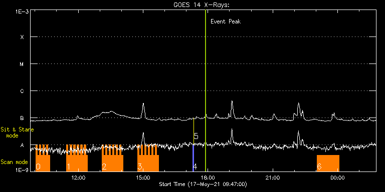 EIS Observation timeline overlay to GOES-Xray curve Code 1" 2" 40" 266" EIS Observations list for this event: STUDY ACRONYM ID DATE OBSERVED DESCRIPTION NOAA# TARGET 0 EL_DHB_02 | 77226 | 2021/05/17 10:02:12 | AR 12822 - Coronal magnetic fields | | Flare TIMELINE ID DATE OBSERVED FITS FILE XCEN (+W/-E) YCEN (+N/-S) DUR ----------------------------------------------------------------------------------------------------------------- 77226 | 2021/05/17 10:02:12.000 | eis_l0_20210517_100212.fits.gz | 720.85 | 228.97 | 4m50s 77226 | 2021/05/17 10:07:05.000 | eis_l0_20210517_100705.fits.gz | 721.16 | 228.82 | 4m50s 77226 | 2021/05/17 10:11:58.000 | eis_l0_20210517_101158.fits.gz | 721.62 | 228.74 | 4m50s 77226 | 2021/05/17 10:16:51.000 | eis_l0_20210517_101651.fits.gz | 722.09 | 228.82 | 4m50s 77226 | 2021/05/17 10:21:44.000 | eis_l0_20210517_102144.fits.gz | 722.47 | 228.82 | 4m50s 77226 | 2021/05/17 10:26:37.000 | eis_l0_20210517_102637.fits.gz | 722.94 | 228.66 | 4m50s 77226 | 2021/05/17 10:31:30.000 | eis_l0_20210517_103130.fits.gz | 723.40 | 228.82 | 4m50s 77226 | 2021/05/17 10:36:23.000 | eis_l0_20210517_103623.fits.gz | 723.86 | 228.66 | 4m51s 1 EL_DHB_02 | 77222 | 2021/05/17 11:27:12 | AR 12822 - Coronal magnetic fields | | Flare TIMELINE ID DATE OBSERVED FITS FILE XCEN (+W/-E) YCEN (+N/-S) DUR ----------------------------------------------------------------------------------------------------------------- 77222 | 2021/05/17 11:27:12.000 | eis_l0_20210517_112712.fits.gz | 728.34 | 228.35 | 4m50s 77222 | 2021/05/17 11:32:05.000 | eis_l0_20210517_113205.fits.gz | 728.73 | 228.27 | 4m50s 77222 | 2021/05/17 11:36:58.000 | eis_l0_20210517_113658.fits.gz | 729.20 | 228.35 | 4m50s 77222 | 2021/05/17 11:41:51.000 | eis_l0_20210517_114151.fits.gz | 729.66 | 228.35 | 4m50s 77222 | 2021/05/17 11:46:44.000 | eis_l0_20210517_114644.fits.gz | 730.04 | 228.27 | 4m50s 77222 | 2021/05/17 11:51:37.000 | eis_l0_20210517_115137.fits.gz | 730.43 | 228.27 | 4m50s 77222 | 2021/05/17 11:56:29.000 | eis_l0_20210517_115629.fits.gz | 730.89 | 228.20 | 4m51s 77222 | 2021/05/17 12:01:22.000 | eis_l0_20210517_120122.fits.gz | 731.36 | 228.12 | 4m50s 77222 | 2021/05/17 12:06:15.000 | eis_l0_20210517_120615.fits.gz | 731.74 | 228.04 | 4m50s 77222 | 2021/05/17 12:11:08.000 | eis_l0_20210517_121108.fits.gz | 732.21 | 228.12 | 4m50s 77222 | 2021/05/17 12:16:01.000 | eis_l0_20210517_121601.fits.gz | 732.59 | 228.12 | 4m50s 77222 | 2021/05/17 12:20:54.000 | eis_l0_20210517_122054.fits.gz | 733.06 | 228.12 | 4m50s 2 EL_DHB_02 | 77223 | 2021/05/17 13:05:42 | AR 12822 - Coronal magnetic fields | | Flare TIMELINE ID DATE OBSERVED FITS FILE XCEN (+W/-E) YCEN (+N/-S) DUR ----------------------------------------------------------------------------------------------------------------- 77223 | 2021/05/17 13:05:42.000 | eis_l0_20210517_130542.fits.gz | 737.00 | 227.74 | 4m50s 77223 | 2021/05/17 13:10:35.000 | eis_l0_20210517_131035.fits.gz | 737.46 | 227.74 | 4m50s 77223 | 2021/05/17 13:15:28.000 | eis_l0_20210517_131528.fits.gz | 737.77 | 227.74 | 4m50s 77223 | 2021/05/17 13:20:21.000 | eis_l0_20210517_132021.fits.gz | 738.23 | 227.58 | 4m50s 77223 | 2021/05/17 13:25:14.000 | eis_l0_20210517_132514.fits.gz | 738.62 | 227.50 | 4m50s 77223 | 2021/05/17 13:30:07.000 | eis_l0_20210517_133007.fits.gz | 738.93 | 227.74 | 4m50s 77223 | 2021/05/17 13:35:00.000 | eis_l0_20210517_133500.fits.gz | 739.47 | 227.66 | 4m50s 77223 | 2021/05/17 13:39:53.000 | eis_l0_20210517_133953.fits.gz | 739.78 | 227.50 | 4m51s 77223 | 2021/05/17 13:44:47.000 | eis_l0_20210517_134447.fits.gz | 740.32 | 227.58 | 4m49s 77223 | 2021/05/17 13:49:39.000 | eis_l0_20210517_134939.fits.gz | 740.71 | 227.58 | 4m51s 77223 | 2021/05/17 13:54:33.000 | eis_l0_20210517_135433.fits.gz | 741.17 | 227.43 | 4m50s 77223 | 2021/05/17 13:59:25.000 | eis_l0_20210517_135925.fits.gz | 741.48 | 227.35 | 4m50s 3 EL_DHB_02 | 77224 | 2021/05/17 14:44:12 | AR 12822 - Coronal magnetic fields | | Flare TIMELINE ID DATE OBSERVED FITS FILE XCEN (+W/-E) YCEN (+N/-S) DUR ----------------------------------------------------------------------------------------------------------------- 77224 | 2021/05/17 14:44:12.000 | eis_l0_20210517_144412.fits.gz | 745.34 | 227.35 | 4m50s 77224 | 2021/05/17 14:49:05.000 | eis_l0_20210517_144905.fits.gz | 745.73 | 227.04 | 4m51s 77224 | 2021/05/17 14:53:59.000 | eis_l0_20210517_145359.fits.gz | 746.19 | 227.12 | 4m50s 77224 | 2021/05/17 14:58:51.000 | eis_l0_20210517_145851.fits.gz | 746.58 | 227.04 | 4m50s 77224 | 2021/05/17 15:03:44.000 | eis_l0_20210517_150344.fits.gz | 747.04 | 227.04 | 4m50s 77224 | 2021/05/17 15:08:37.000 | eis_l0_20210517_150837.fits.gz | 747.42 | 226.96 | 4m50s 77224 | 2021/05/17 15:13:30.000 | eis_l0_20210517_151330.fits.gz | 747.81 | 226.96 | 4m51s 77224 | 2021/05/17 15:18:23.000 | eis_l0_20210517_151823.fits.gz | 748.28 | 226.96 | 4m51s 77224 | 2021/05/17 15:23:16.000 | eis_l0_20210517_152316.fits.gz | 748.58 | 227.04 | 4m50s 77224 | 2021/05/17 15:28:09.000 | eis_l0_20210517_152809.fits.gz | 749.05 | 226.88 | 4m50s 77224 | 2021/05/17 15:33:02.000 | eis_l0_20210517_153302.fits.gz | 749.36 | 226.81 | 4m50s 77224 | 2021/05/17 15:37:55.000 | eis_l0_20210517_153755.fits.gz | 749.82 | 226.88 | 4m50s 4 PRY_slot_contextLITE | 77202 | 2021/05/17 17:17:19 | Pointing monitoring | | Active Region TIMELINE ID DATE OBSERVED FITS FILE XCEN (+W/-E) YCEN (+N/-S) DUR ----------------------------------------------------------------------------------------------------------------- 77202 | 2021/05/17 17:17:19.000 | eis_l0_20210517_171719.fits.gz | -37.01 | -28.58 | 2m56s 5 XRT_synop_AIA | 77203 | 2021/05/17 17:20:34 | Pointing monitoring | | Quiet Sun TIMELINE ID DATE OBSERVED FITS FILE XCEN (+W/-E) YCEN (+N/-S) DUR ----------------------------------------------------------------------------------------------------------------- 77203 | 2021/05/17 17:20:34.000 | eis_l0_20210517_172034.fits.gz | -154.20 | -28.58 | 10s 6 Large_CH_Map | 77212 | 2021/05/17 23