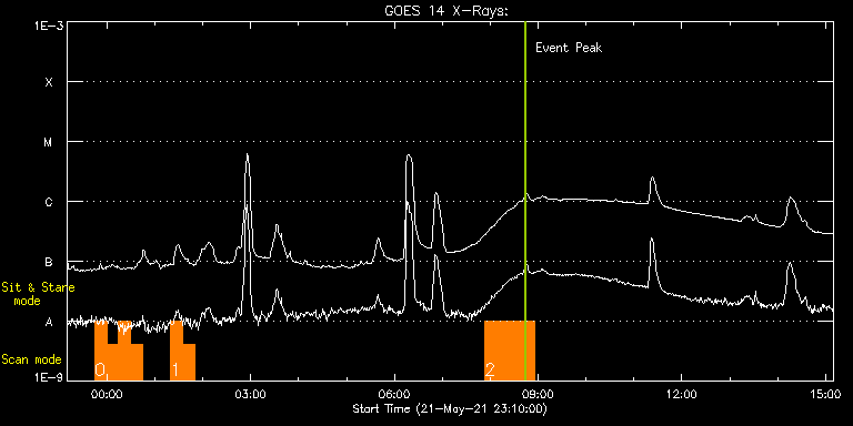 EIS Observation timeline overlay to GOES-Xray curve Code 1" 2" 40" 266" EIS Observations list for this event: STUDY ACRONYM ID DATE OBSERVED DESCRIPTION NOAA# TARGET 0 ar_evolution | 77308 | 2021/05/21 23:44:43 | AR 12824 - active region evolution | | Active Region TIMELINE ID DATE OBSERVED FITS FILE XCEN (+W/-E) YCEN (+N/-S) DUR ----------------------------------------------------------------------------------------------------------------- 77308 | 2021/05/21 23:44:43.000 | eis_l0_20210521_234443.fits.gz | -508.72 | 284.76 | 14m47s 77308 | 2021/05/21 23:59:33.000 | eis_l0_20210521_235933.fits.gz | -506.95 | 284.91 | 14m48s 77308 | 2021/05/22 00:14:24.000 | eis_l0_20210522_001424.fits.gz | -505.25 | 284.76 | 14m47s 77308 | 2021/05/22 00:29:14.000 | eis_l0_20210522_002914.fits.gz | -503.39 | 284.83 | 14m47s 1 ar_evolution | 77303 | 2021/05/22 01:19:43 | AR 12824 - active region evolution | | Active Region TIMELINE ID DATE OBSERVED FITS FILE XCEN (+W/-E) YCEN (+N/-S) DUR ----------------------------------------------------------------------------------------------------------------- 77303 | 2021/05/22 01:19:43.000 | eis_l0_20210522_011943.fits.gz | -497.54 | 285.07 | 14m47s 77303 | 2021/05/22 01:34:33.000 | eis_l0_20210522_013433.fits.gz | -495.69 | 284.99 | 14m47s 2 Large_CH_Map | 77296 | 2021/05/22 07:53:13 | HOP393: cycle 24/25 equatorial transit | | Quiet Sun TIMELINE ID DATE OBSERVED FITS FILE XCEN (+W/-E) YCEN (+N/-S) DUR ----------------------------------------------------------------------------------------------------------------- 77296 | 2021/05/22 07:53:13.000 | eis_l0_20210522_075313.fits.gz | -45.95 | -40.38 | 1h1m52s : Check study information : Download file : View thumbnails For this event, also check for: