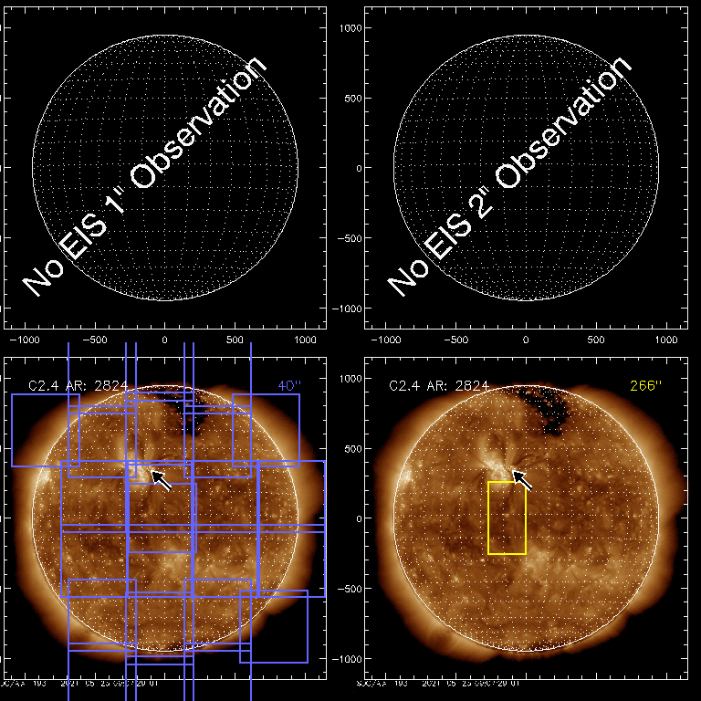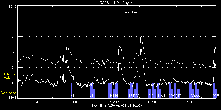 EIS Observation timeline overlay to GOES-Xray curve Code 1" 2" 40" 266" EIS Observations list for this event: STUDY ACRONYM ID DATE OBSERVED DESCRIPTION NOAA# TARGET 0 PRY_slot_contextLITE | 77341 | 2021/05/23 05:30:20 | Pointing Monitoring | | Active Region TIMELINE ID DATE OBSERVED FITS FILE XCEN (+W/-E) YCEN (+N/-S) DUR ----------------------------------------------------------------------------------------------------------------- 77341 | 2021/05/23 05:30:20.000 | eis_l0_20210523_053020.fits.gz | -15.29 | -0.50 | 2m56s 1 XRT_synop_AIA | 77342 | 2021/05/23 05:33:35 | Pointing Monitoring | | Quiet Sun TIMELINE ID DATE OBSERVED FITS FILE XCEN (+W/-E) YCEN (+N/-S) DUR ----------------------------------------------------------------------------------------------------------------- 77342 | 2021/05/23 05:33:35.000 | eis_l0_20210523_053335.fits.gz | -132.49 | -0.42 | 10s 2 full_sun_slot_scan_3 | 77313 | 2021/05/23 07:02:27 | HOP 130 Long Exposure #1/15-1 | | Quiet Sun TIMELINE ID DATE OBSERVED FITS FILE XCEN (+W/-E) YCEN (+N/-S) DUR ----------------------------------------------------------------------------------------------------------------- 77313 | 2021/05/23 07:02:27.000 | eis_l0_20210523_070227.fits.gz | 902.40 | 152.42 | 10m27s 3 full_sun_slot_scan_3 | 77313 | 2021/05/23 07:02:27 | HOP 130 Long Exposure #1/15-1 | | Quiet Sun TIMELINE ID DATE OBSERVED FITS FILE XCEN (+W/-E) YCEN (+N/-S) DUR ----------------------------------------------------------------------------------------------------------------- 77313 | 2021/05/23 07:02:27.000 | eis_l0_20210523_070227.fits.gz | 902.40 | 152.42 | 10m27s 4 full_sun_slot_scan_3 | 77314 | 2021/05/23 07:12:59 | HOP 130 Long Exposure #1/15-2 | | Quiet Sun TIMELINE ID DATE OBSERVED FITS FILE XCEN (+W/-E) YCEN (+N/-S) DUR ----------------------------------------------------------------------------------------------------------------- 77314 | 2021/05/23 07:12:59.000 | eis_l0_20210523_071259.fits.gz | 902.25 | -305.50 | 10m27s 5 full_sun_slot_scan_3 | 77315 | 2021/05/23 08:27:13 | HOP 130 Long Exposure #2/15-1 | | Quiet Sun TIMELINE ID DATE OBSERVED FITS FILE XCEN (+W/-E) YCEN (+N/-S) DUR ----------------------------------------------------------------------------------------------------------------- 77315 | 2021/05/23 08:27:13.000 | eis_l0_20210523_082713.fits.gz | 434.21 | 152.50 | 10m27s 6 full_sun_slot_scan_3 | 77316 | 2021/05/23 08:37:45 | HOP 130 Long Exposure #2/15-2 | | Quiet Sun TIMELINE ID DATE OBSERVED FITS FILE XCEN (+W/-E) YCEN (+N/-S) DUR ----------------------------------------------------------------------------------------------------------------- 77316 | 2021/05/23 08:37:45.000 | eis_l0_20210523_083745.fits.gz | 434.28 | -305.42 | 10m27s 7 full_sun_slot_scan_3 | 77316 | 2021/05/23 08:37:45 | HOP 130 Long Exposure #2/15-2 | | Quiet Sun TIMELINE ID DATE OBSERVED FITS FILE XCEN (+W/-E) YCEN (+N/-S) DUR ----------------------------------------------------------------------------------------------------------------- 77316 | 2021/05/23 08:37:45.000 | eis_l0_20210523_083745.fits.gz | 434.28 | -305.42 | 10m27s 8 full_sun_slot_scan_3 | 77317 | 2021/05/23 08:53:13 | HOP 130 Long Exposure #3/15-1 | 2824 | Quiet Sun TIMELINE ID DATE OBSERVED FITS FILE XCEN (+W/-E) YCEN (+N/-S) DUR ----------------------------------------------------------------------------------------------------------------- 77317 | 2021/05/23 08:53:13.000 | eis_l0_20210523_085313.fits.gz | -33.76 | 152.50 | 10m27s 9 full_sun_slot_scan_3 | 77318 | 2021/05/23 09:03:45 | HOP 130 Long Exposure #3/15-2 | | Quiet Sun TIMELINE ID DATE OBSERVED FITS FILE XCEN (+W/-E) YCEN (+N/-S) DUR ----------------------------------------------------------------------------------------------------------------- 77318 | 2021/05/23 09:03:45.000 | eis_l0_20210523_090345.fits.gz | -33.68 | -305.42 | 10m27s 10 full_sun_slot_scan_3 | 77319 | 2021/05/23 10:05:43 | HOP 130 Long Exposure #4/15-1 | 2825 | Quiet Sun TIMELINE ID DATE OBSERVED FITS FILE XCEN (+W/-E) YCEN (+N/-S) DUR ----------------------------------------------------------------------------------------------------------------- 77319 | 2021/05/23 10:05:43.000 | eis_l0_20210523_100543.fits.gz | -501.73 | 152.50 | 10m27s 11 full_sun_slot_scan_3 | 77320 | 2021/05/23 10:16:16 | HOP 130 Long Exposure #4/15-2 | | Quiet Sun TIMELINE ID DATE OBSERVED FITS FILE XCEN (+W/-E) YCEN (+N/-S) DUR ----------------------------------------------------------------------------------------------------------------- 77320 | 2021/05/23 10:16:16.000 | eis_l0_20210523_101616.fits.gz | -501.73 | -305.42 | 10m26s 12 full_sun_slot_scan_3 | 77321 | 2021/05/23 10:31:43 | HOP 130 Long Exposure #5/15-1 | | Quiet Sun TIMELINE ID DATE OBSERVED FITS FILE XCEN (+W/-E) YCEN (+N/-S) DUR ----------------------------------------------------------------------------------------------------------------- 77321 | 2021/05/23 10:31:43.000 | eis_l0_20210523_103143.fits.gz | -9903.16 | -9810.20 | 10m27s 13 full_sun_slot_scan_3 | 77322 | 2021/05/23 10:42:15 | HOP 130 Long Exposure #5/15-2 | | Quiet Sun TIMELINE ID DATE OBSERVED FITS FILE XCEN (+W/-E) YCEN (+N/-S) DUR ----------------------------------------------------------------------------------------------------------------- 77322 | 2021/05/23 10:42:15.000 | eis_l0_20210523_104215.fits.gz | -9903.16 | -10268.20 | 10m27s 14 full_sun_slot_scan_3 | 77323 | 2021/05/23 11:44:13 | HOP 130 Long Exposure #6/15 | | Quiet Sun TIMELINE ID DATE OBSERVED FITS FILE XCEN (+W/-E) YCEN (+N/-S) DUR ----------------------------------------------------------------------------------------------------------------- 77323 | 2021/05/23 11:44:13.000 | eis_l0_20210523_114413.fits.gz | 723.27 | 622.55 | 10m27s 15 full_sun_slot_scan_3 | 77324 | 2021/05/23 11:59:13 | HOP 130 Long Exposure #7/15-1 | | Quiet Sun TIMELINE ID DATE OBSERVED FITS FILE XCEN (+W/-E) YCEN (+N/-S) DUR ------------------------------------------------------------------------------------------------------