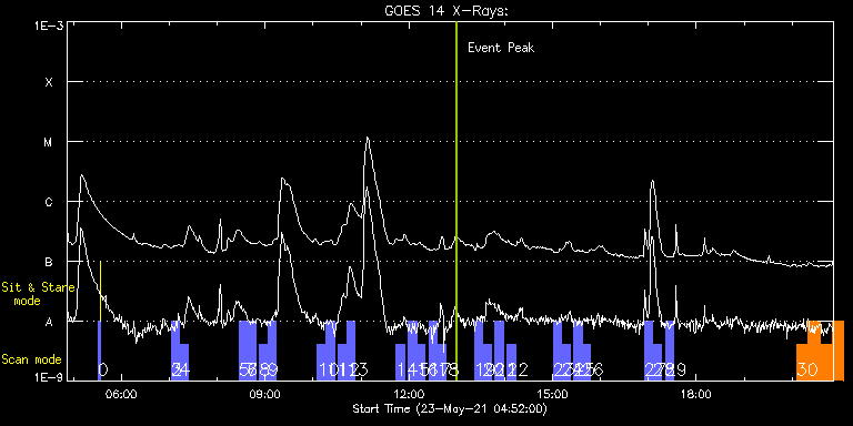 EIS Observation timeline overlay to GOES-Xray curve Code 1" 2" 40" 266" EIS Observations list for this event: STUDY ACRONYM ID DATE OBSERVED DESCRIPTION NOAA# TARGET 0 PRY_slot_contextLITE | 77341 | 2021/05/23 05:30:20 | Pointing Monitoring | | Active Region TIMELINE ID DATE OBSERVED FITS FILE XCEN (+W/-E) YCEN (+N/-S) DUR ----------------------------------------------------------------------------------------------------------------- 77341 | 2021/05/23 05:30:20.000 | eis_l0_20210523_053020.fits.gz | -15.29 | -0.50 | 2m56s 1 XRT_synop_AIA | 77342 | 2021/05/23 05:33:35 | Pointing Monitoring | | Quiet Sun TIMELINE ID DATE OBSERVED FITS FILE XCEN (+W/-E) YCEN (+N/-S) DUR ----------------------------------------------------------------------------------------------------------------- 77342 | 2021/05/23 05:33:35.000 | eis_l0_20210523_053335.fits.gz | -132.49 | -0.42 | 10s 2 full_sun_slot_scan_3 | 77313 | 2021/05/23 07:02:27 | HOP 130 Long Exposure #1/15-1 | | Quiet Sun TIMELINE ID DATE OBSERVED FITS FILE XCEN (+W/-E) YCEN (+N/-S) DUR ----------------------------------------------------------------------------------------------------------------- 77313 | 2021/05/23 07:02:27.000 | eis_l0_20210523_070227.fits.gz | 902.40 | 152.42 | 10m27s 3 full_sun_slot_scan_3 | 77313 | 2021/05/23 07:02:27 | HOP 130 Long Exposure #1/15-1 | | Quiet Sun TIMELINE ID DATE OBSERVED FITS FILE XCEN (+W/-E) YCEN (+N/-S) DUR ----------------------------------------------------------------------------------------------------------------- 77313 | 2021/05/23 07:02:27.000 | eis_l0_20210523_070227.fits.gz | 902.40 | 152.42 | 10m27s 4 full_sun_slot_scan_3 | 77314 | 2021/05/23 07:12:59 | HOP 130 Long Exposure #1/15-2 | | Quiet Sun TIMELINE ID DATE OBSERVED FITS FILE XCEN (+W/-E) YCEN (+N/-S) DUR ----------------------------------------------------------------------------------------------------------------- 77314 | 2021/05/23 07:12:59.000 | eis_l0_20210523_071259.fits.gz | 902.25 | -305.50 | 10m27s 5 full_sun_slot_scan_3 | 77315 | 2021/05/23 08:27:13 | HOP 130 Long Exposure #2/15-1 | | Quiet Sun TIMELINE ID DATE OBSERVED FITS FILE XCEN (+W/-E) YCEN (+N/-S) DUR ----------------------------------------------------------------------------------------------------------------- 77315 | 2021/05/23 08:27:13.000 | eis_l0_20210523_082713.fits.gz | 434.21 | 152.50 | 10m27s 6 full_sun_slot_scan_3 | 77316 | 2021/05/23 08:37:45 | HOP 130 Long Exposure #2/15-2 | | Quiet Sun TIMELINE ID DATE OBSERVED FITS FILE XCEN (+W/-E) YCEN (+N/-S) DUR ----------------------------------------------------------------------------------------------------------------- 77316 | 2021/05/23 08:37:45.000 | eis_l0_20210523_083745.fits.gz | 434.28 | -305.42 | 10m27s 7 full_sun_slot_scan_3 | 77316 | 2021/05/23 08:37:45 | HOP 130 Long Exposure #2/15-2 | | Quiet Sun TIMELINE ID DATE OBSERVED FITS FILE XCEN (+W/-E) YCEN (+N/-S) DUR ----------------------------------------------------------------------------------------------------------------- 77316 | 2021/05/23 08:37:45.000 | eis_l0_20210523_083745.fits.gz | 434.28 | -305.42 | 10m27s 8 full_sun_slot_scan_3 | 77317 | 2021/05/23 08:53:13 | HOP 130 Long Exposure #3/15-1 | 2824 | Quiet Sun TIMELINE ID DATE OBSERVED FITS FILE XCEN (+W/-E) YCEN (+N/-S) DUR ----------------------------------------------------------------------------------------------------------------- 77317 | 2021/05/23 08:53:13.000 | eis_l0_20210523_085313.fits.gz | -33.76 | 152.50 | 10m27s 9 full_sun_slot_scan_3 | 77318 | 2021/05/23 09:03:45 | HOP 130 Long Exposure #3/15-2 | | Quiet Sun TIMELINE ID DATE OBSERVED FITS FILE XCEN (+W/-E) YCEN (+N/-S) DUR ----------------------------------------------------------------------------------------------------------------- 77318 | 2021/05/23 09:03:45.000 | eis_l0_20210523_090345.fits.gz | -33.68 | -305.42 | 10m27s 10 full_sun_slot_scan_3 | 77319 | 2021/05/23 10:05:43 | HOP 130 Long Exposure #4/15-1 | 2825 | Quiet Sun TIMELINE ID DATE OBSERVED FITS FILE XCEN (+W/-E) YCEN (+N/-S) DUR ----------------------------------------------------------------------------------------------------------------- 77319 | 2021/05/23 10:05:43.000 | eis_l0_20210523_100543.fits.gz | -501.73 | 152.50 | 10m27s 11 full_sun_slot_scan_3 | 77320 | 2021/05/23 10:16:16 | HOP 130 Long Exposure #4/15-2 | | Quiet Sun TIMELINE ID DATE OBSERVED FITS FILE XCEN (+W/-E) YCEN (+N/-S) DUR ----------------------------------------------------------------------------------------------------------------- 77320 | 2021/05/23 10:16:16.000 | eis_l0_20210523_101616.fits.gz | -501.73 | -305.42 | 10m26s 12 full_sun_slot_scan_3 | 77321 | 2021/05/23 10:31:43 | HOP 130 Long Exposure #5/15-1 | | Quiet Sun TIMELINE ID DATE OBSERVED FITS FILE XCEN (+W/-E) YCEN (+N/-S) DUR ----------------------------------------------------------------------------------------------------------------- 77321 | 2021/05/23 10:31:43.000 | eis_l0_20210523_103143.fits.gz | -9903.16 | -9810.20 | 10m27s 13 full_sun_slot_scan_3 | 77322 | 2021/05/23 10:42:15 | HOP 130 Long Exposure #5/15-2 | | Quiet Sun TIMELINE ID DATE OBSERVED FITS FILE XCEN (+W/-E) YCEN (+N/-S) DUR ----------------------------------------------------------------------------------------------------------------- 77322 | 2021/05/23 10:42:15.000 | eis_l0_20210523_104215.fits.gz | -9903.16 | -10268.20 | 10m27s 14 full_sun_slot_scan_3 | 77323 | 2021/05/23 11:44:13 | HOP 130 Long Exposure #6/15 | | Quiet Sun TIMELINE ID DATE OBSERVED FITS FILE XCEN (+W/-E) YCEN (+N/-S) DUR ----------------------------------------------------------------------------------------------------------------- 77323 | 2021/05/23 11:44:13.000 | eis_l0_20210523_114413.fits.gz | 723.27 | 622.55 | 10m27s 15 full_sun_slot_scan_3 | 77324 | 2021/05/23 11:59:13 | HOP 130 Long Exposure #7/15-1 | | Quiet Sun TIMELINE ID DATE OBSERVED FITS FILE XCEN (+W/-E) YCEN (+N/-S) DUR ------------------------------------------------------------------------------------------------------