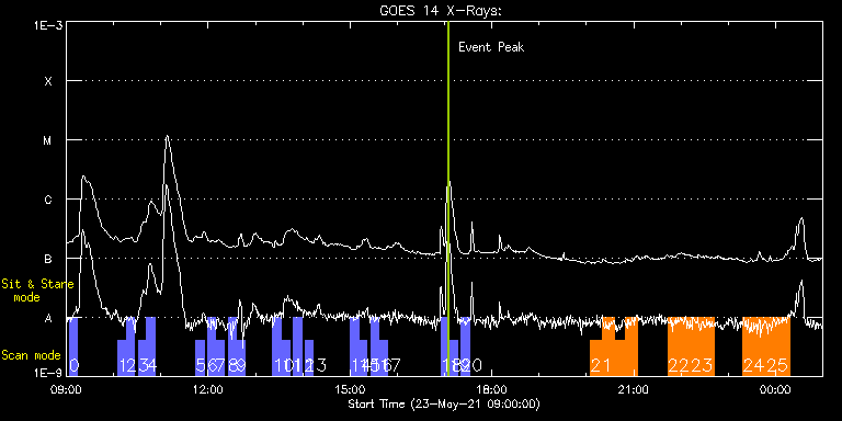 EIS Observation timeline overlay to GOES-Xray curve Code 1" 2" 40" 266" EIS Observations list for this event: STUDY ACRONYM ID DATE OBSERVED DESCRIPTION NOAA# TARGET 0 full_sun_slot_scan_3 | 77318 | 2021/05/23 09:03:45 | HOP 130 Long Exposure #3/15-2 | | Quiet Sun TIMELINE ID DATE OBSERVED FITS FILE XCEN (+W/-E) YCEN (+N/-S) DUR ----------------------------------------------------------------------------------------------------------------- 77318 | 2021/05/23 09:03:45.000 | eis_l0_20210523_090345.fits.gz | -33.68 | -305.42 | 10m27s 1 full_sun_slot_scan_3 | 77319 | 2021/05/23 10:05:43 | HOP 130 Long Exposure #4/15-1 | 2825 | Quiet Sun TIMELINE ID DATE OBSERVED FITS FILE XCEN (+W/-E) YCEN (+N/-S) DUR ----------------------------------------------------------------------------------------------------------------- 77319 | 2021/05/23 10:05:43.000 | eis_l0_20210523_100543.fits.gz | -501.73 | 152.50 | 10m27s 2 full_sun_slot_scan_3 | 77320 | 2021/05/23 10:16:16 | HOP 130 Long Exposure #4/15-2 | | Quiet Sun TIMELINE ID DATE OBSERVED FITS FILE XCEN (+W/-E) YCEN (+N/-S) DUR ----------------------------------------------------------------------------------------------------------------- 77320 | 2021/05/23 10:16:16.000 | eis_l0_20210523_101616.fits.gz | -501.73 | -305.42 | 10m26s 3 full_sun_slot_scan_3 | 77321 | 2021/05/23 10:31:43 | HOP 130 Long Exposure #5/15-1 | | Quiet Sun TIMELINE ID DATE OBSERVED FITS FILE XCEN (+W/-E) YCEN (+N/-S) DUR ----------------------------------------------------------------------------------------------------------------- 77321 | 2021/05/23 10:31:43.000 | eis_l0_20210523_103143.fits.gz | -9903.16 | -9810.20 | 10m27s 4 full_sun_slot_scan_3 | 77322 | 2021/05/23 10:42:15 | HOP 130 Long Exposure #5/15-2 | | Quiet Sun TIMELINE ID DATE OBSERVED FITS FILE XCEN (+W/-E) YCEN (+N/-S) DUR ----------------------------------------------------------------------------------------------------------------- 77322 | 2021/05/23 10:42:15.000 | eis_l0_20210523_104215.fits.gz | -9903.16 | -10268.20 | 10m27s 5 full_sun_slot_scan_3 | 77323 | 2021/05/23 11:44:13 | HOP 130 Long Exposure #6/15 | | Quiet Sun TIMELINE ID DATE OBSERVED FITS FILE XCEN (+W/-E) YCEN (+N/-S) DUR ----------------------------------------------------------------------------------------------------------------- 77323 | 2021/05/23 11:44:13.000 | eis_l0_20210523_114413.fits.gz | 723.27 | 622.55 | 10m27s 6 full_sun_slot_scan_3 | 77324 | 2021/05/23 11:59:13 | HOP 130 Long Exposure #7/15-1 | | Quiet Sun TIMELINE ID DATE OBSERVED FITS FILE XCEN (+W/-E) YCEN (+N/-S) DUR ----------------------------------------------------------------------------------------------------------------- 77324 | 2021/05/23 11:59:13.000 | eis_l0_20210523_115913.fits.gz | 377.18 | 999.75 | 10m27s 7 full_sun_slot_scan_3 | 77325 | 2021/05/23 12:09:45 | HOP 130 Long Exposure #7/15-2 | | Quiet Sun TIMELINE ID DATE OBSERVED FITS FILE XCEN (+W/-E) YCEN (+N/-S) DUR ----------------------------------------------------------------------------------------------------------------- 77325 | 2021/05/23 12:09:45.000 | eis_l0_20210523_120945.fits.gz | 377.18 | 541.60 | 10m27s 8 full_sun_slot_scan_3 | 77326 | 2021/05/23 12:25:13 | HOP 130 Long Exposure #8/15-1 | | Quiet Sun TIMELINE ID DATE OBSERVED FITS FILE XCEN (+W/-E) YCEN (+N/-S) DUR ----------------------------------------------------------------------------------------------------------------- 77326 | 2021/05/23 12:25:13.000 | eis_l0_20210523_122513.fits.gz | -33.76 | 1093.61 | 10m27s 9 full_sun_slot_scan_3 | 77327 | 2021/05/23 12:35:45 | HOP 130 Long Exposure #8/15-2 | | Quiet Sun TIMELINE ID DATE OBSERVED FITS FILE XCEN (+W/-E) YCEN (+N/-S) DUR ----------------------------------------------------------------------------------------------------------------- 77327 | 2021/05/23 12:35:45.000 | eis_l0_20210523_123545.fits.gz | -33.76 | 635.45 | 10m27s 10 full_sun_slot_scan_3 | 77328 | 2021/05/23 13:22:13 | HOP 130 Long Exposure #9/15-1 | | Quiet Sun TIMELINE ID DATE OBSERVED FITS FILE XCEN (+W/-E) YCEN (+N/-S) DUR ----------------------------------------------------------------------------------------------------------------- 77328 | 2021/05/23 13:22:13.000 | eis_l0_20210523_132213.fits.gz | -444.87 | 999.52 | 10m27s 11 full_sun_slot_scan_3 | 77329 | 2021/05/23 13:32:45 | HOP 130 Long Exposure #9/15-2 | | Quiet Sun TIMELINE ID DATE OBSERVED FITS FILE XCEN (+W/-E) YCEN (+N/-S) DUR ----------------------------------------------------------------------------------------------------------------- 77329 | 2021/05/23 13:32:45.000 | eis_l0_20210523_133245.fits.gz | -444.80 | 541.52 | 10m27s 12 full_sun_slot_scan_3 | 77330 | 2021/05/23 13:48:13 | HOP 130 Long Exposure #10/15 | | Quiet Sun TIMELINE ID DATE OBSERVED FITS FILE XCEN (+W/-E) YCEN (+N/-S) DUR ----------------------------------------------------------------------------------------------------------------- 77330 | 2021/05/23 13:48:13.000 | eis_l0_20210523_134813.fits.gz | -848.80 | 622.55 | 10m27s 13 full_sun_slot_scan_3 | 77331 | 2021/05/23 14:03:13 | HOP 130 Long Exposure #11/15 | | Quiet Sun TIMELINE ID DATE OBSERVED FITS FILE XCEN (+W/-E) YCEN (+N/-S) DUR ----------------------------------------------------------------------------------------------------------------- 77331 | 2021/05/23 14:03:13.000 | eis_l0_20210523_140313.fits.gz | 778.56 | -776.02 | 10m26s 14 full_sun_slot_scan_3 | 77332 | 2021/05/23 15:00:43 | HOP 130 Long Exposure #12/15-1 | | Quiet Sun TIMELINE ID DATE OBSERVED FITS FILE XCEN (+W/-E) YCEN (+N/-S) DUR ----------------------------------------------------------------------------------------------------------------- 77332 | 2021/05/23 15:00:43.000 | eis_l0_20210523_150043.fits.gz | 377.10 | -694.60 | 10m27s 15 full_sun_slot_scan_3 | 77333 | 2021/05/23 15:11:16 | HOP 130 Long Exposure #12/15-2 | | Quiet Sun TIMELINE ID DATE OBSERVED FITS FILE XCEN (+W/-E) YCEN (+N/-S) DUR ----------------------------------------------------------------------------