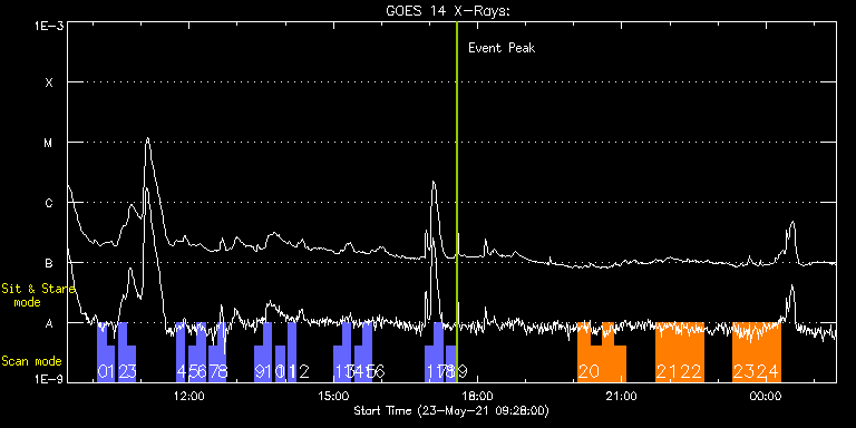 EIS Observation timeline overlay to GOES-Xray curve Code 1" 2" 40" 266" EIS Observations list for this event: STUDY ACRONYM ID DATE OBSERVED DESCRIPTION NOAA# TARGET 0 full_sun_slot_scan_3 | 77319 | 2021/05/23 10:05:43 | HOP 130 Long Exposure #4/15-1 | 2825 | Quiet Sun TIMELINE ID DATE OBSERVED FITS FILE XCEN (+W/-E) YCEN (+N/-S) DUR ----------------------------------------------------------------------------------------------------------------- 77319 | 2021/05/23 10:05:43.000 | eis_l0_20210523_100543.fits.gz | -501.73 | 152.50 | 10m27s 1 full_sun_slot_scan_3 | 77320 | 2021/05/23 10:16:16 | HOP 130 Long Exposure #4/15-2 | | Quiet Sun TIMELINE ID DATE OBSERVED FITS FILE XCEN (+W/-E) YCEN (+N/-S) DUR ----------------------------------------------------------------------------------------------------------------- 77320 | 2021/05/23 10:16:16.000 | eis_l0_20210523_101616.fits.gz | -501.73 | -305.42 | 10m26s 2 full_sun_slot_scan_3 | 77321 | 2021/05/23 10:31:43 | HOP 130 Long Exposure #5/15-1 | | Quiet Sun TIMELINE ID DATE OBSERVED FITS FILE XCEN (+W/-E) YCEN (+N/-S) DUR ----------------------------------------------------------------------------------------------------------------- 77321 | 2021/05/23 10:31:43.000 | eis_l0_20210523_103143.fits.gz | -9903.16 | -9810.20 | 10m27s 3 full_sun_slot_scan_3 | 77322 | 2021/05/23 10:42:15 | HOP 130 Long Exposure #5/15-2 | | Quiet Sun TIMELINE ID DATE OBSERVED FITS FILE XCEN (+W/-E) YCEN (+N/-S) DUR ----------------------------------------------------------------------------------------------------------------- 77322 | 2021/05/23 10:42:15.000 | eis_l0_20210523_104215.fits.gz | -9903.16 | -10268.20 | 10m27s 4 full_sun_slot_scan_3 | 77323 | 2021/05/23 11:44:13 | HOP 130 Long Exposure #6/15 | | Quiet Sun TIMELINE ID DATE OBSERVED FITS FILE XCEN (+W/-E) YCEN (+N/-S) DUR ----------------------------------------------------------------------------------------------------------------- 77323 | 2021/05/23 11:44:13.000 | eis_l0_20210523_114413.fits.gz | 723.27 | 622.55 | 10m27s 5 full_sun_slot_scan_3 | 77324 | 2021/05/23 11:59:13 | HOP 130 Long Exposure #7/15-1 | | Quiet Sun TIMELINE ID DATE OBSERVED FITS FILE XCEN (+W/-E) YCEN (+N/-S) DUR ----------------------------------------------------------------------------------------------------------------- 77324 | 2021/05/23 11:59:13.000 | eis_l0_20210523_115913.fits.gz | 377.18 | 999.75 | 10m27s 6 full_sun_slot_scan_3 | 77325 | 2021/05/23 12:09:45 | HOP 130 Long Exposure #7/15-2 | | Quiet Sun TIMELINE ID DATE OBSERVED FITS FILE XCEN (+W/-E) YCEN (+N/-S) DUR ----------------------------------------------------------------------------------------------------------------- 77325 | 2021/05/23 12:09:45.000 | eis_l0_20210523_120945.fits.gz | 377.18 | 541.60 | 10m27s 7 full_sun_slot_scan_3 | 77326 | 2021/05/23 12:25:13 | HOP 130 Long Exposure #8/15-1 | | Quiet Sun TIMELINE ID DATE OBSERVED FITS FILE XCEN (+W/-E) YCEN (+N/-S) DUR ----------------------------------------------------------------------------------------------------------------- 77326 | 2021/05/23 12:25:13.000 | eis_l0_20210523_122513.fits.gz | -33.76 | 1093.61 | 10m27s 8 full_sun_slot_scan_3 | 77327 | 2021/05/23 12:35:45 | HOP 130 Long Exposure #8/15-2 | | Quiet Sun TIMELINE ID DATE OBSERVED FITS FILE XCEN (+W/-E) YCEN (+N/-S) DUR ----------------------------------------------------------------------------------------------------------------- 77327 | 2021/05/23 12:35:45.000 | eis_l0_20210523_123545.fits.gz | -33.76 | 635.45 | 10m27s 9 full_sun_slot_scan_3 | 77328 | 2021/05/23 13:22:13 | HOP 130 Long Exposure #9/15-1 | | Quiet Sun TIMELINE ID DATE OBSERVED FITS FILE XCEN (+W/-E) YCEN (+N/-S) DUR ----------------------------------------------------------------------------------------------------------------- 77328 | 2021/05/23 13:22:13.000 | eis_l0_20210523_132213.fits.gz | -444.87 | 999.52 | 10m27s 10 full_sun_slot_scan_3 | 77329 | 2021/05/23 13:32:45 | HOP 130 Long Exposure #9/15-2 | | Quiet Sun TIMELINE ID DATE OBSERVED FITS FILE XCEN (+W/-E) YCEN (+N/-S) DUR ----------------------------------------------------------------------------------------------------------------- 77329 | 2021/05/23 13:32:45.000 | eis_l0_20210523_133245.fits.gz | -444.80 | 541.52 | 10m27s 11 full_sun_slot_scan_3 | 77330 | 2021/05/23 13:48:13 | HOP 130 Long Exposure #10/15 | | Quiet Sun TIMELINE ID DATE OBSERVED FITS FILE XCEN (+W/-E) YCEN (+N/-S) DUR ----------------------------------------------------------------------------------------------------------------- 77330 | 2021/05/23 13:48:13.000 | eis_l0_20210523_134813.fits.gz | -848.80 | 622.55 | 10m27s 12 full_sun_slot_scan_3 | 77331 | 2021/05/23 14:03:13 | HOP 130 Long Exposure #11/15 | | Quiet Sun TIMELINE ID DATE OBSERVED FITS FILE XCEN (+W/-E) YCEN (+N/-S) DUR ----------------------------------------------------------------------------------------------------------------- 77331 | 2021/05/23 14:03:13.000 | eis_l0_20210523_140313.fits.gz | 778.56 | -776.02 | 10m26s 13 full_sun_slot_scan_3 | 77332 | 2021/05/23 15:00:43 | HOP 130 Long Exposure #12/15-1 | | Quiet Sun TIMELINE ID DATE OBSERVED FITS FILE XCEN (+W/-E) YCEN (+N/-S) DUR ----------------------------------------------------------------------------------------------------------------- 77332 | 2021/05/23 15:00:43.000 | eis_l0_20210523_150043.fits.gz | 377.10 | -694.60 | 10m27s 14 full_sun_slot_scan_3 | 77333 | 2021/05/23 15:11:16 | HOP 130 Long Exposure #12/15-2 | | Quiet Sun TIMELINE ID DATE OBSERVED FITS FILE XCEN (+W/-E) YCEN (+N/-S) DUR ----------------------------------------------------------------------------------------------------------------- 77333 | 2021/05/23 15:11:16.000 | eis_l0_20210523_151116.fits.gz | 377.10 | -1152.52 | 10m26s 15 full_sun_slot_scan_3 | 77334 | 2021/05/23 15:26:43 | HOP 130 Long Exposure #13/15-1 | | Quiet Sun TIMELINE ID DATE OBSERVED FITS FILE XCEN (+W/-E) YCEN (+N/-S) DUR --------------------------------------------------------------------------