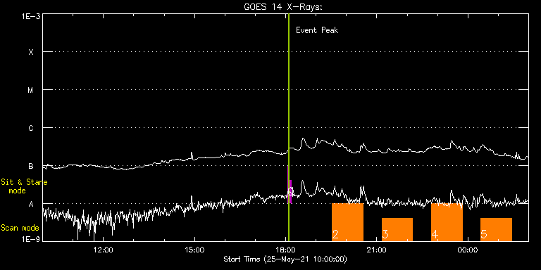 EIS Observation timeline overlay to GOES-Xray curve Code 1" 2" 40" 266" EIS Observations list for this event: STUDY ACRONYM ID DATE OBSERVED DESCRIPTION NOAA# TARGET 0 regcal071 | 77417 | 2021/05/25 18:03:42 | Dark exposures, CCD bottom rows (100s | | Engineering TIMELINE ID DATE OBSERVED FITS FILE XCEN (+W/-E) YCEN (+N/-S) DUR ----------------------------------------------------------------------------------------------------------------- 77417 | 2021/05/25 18:03:42.000 | eis_l0_20210525_180342.fits.gz | 14.59 | -305.50 | 3m22s 1 regcal072 | 77418 | 2021/05/25 18:07:31 | Dark exposures, top CCD rows (100s exp | | Engineering TIMELINE ID DATE OBSERVED FITS FILE XCEN (+W/-E) YCEN (+N/-S) DUR ----------------------------------------------------------------------------------------------------------------- 77418 | 2021/05/25 18:07:31.000 | eis_l0_20210525_180731.fits.gz | 14.59 | 205.50 | 3m21s 2 HPW021VEL260x512v2 | 77398 | 2021/05/25 19:32:11 | Active Region Studies | 2824 | Active Region TIMELINE ID DATE OBSERVED FITS FILE XCEN (+W/-E) YCEN (+N/-S) DUR ----------------------------------------------------------------------------------------------------------------- 77398 | 2021/05/25 19:32:11.000 | eis_l0_20210525_193211.fits.gz | 317.64 | 303.06 | 1h0m44s 3 HPW021VEL260x512v2 | 77399 | 2021/05/25 21:10:14 | Active Region Studies | 2824 | Active Region TIMELINE ID DATE OBSERVED FITS FILE XCEN (+W/-E) YCEN (+N/-S) DUR ----------------------------------------------------------------------------------------------------------------- 77399 | 2021/05/25 21:10:14.000 | eis_l0_20210525_211014.fits.gz | 330.85 | 302.83 | 1h0m44s 4 HPW021VEL260x512v2 | 77400 | 2021/05/25 22:48:13 | Active Region Studies | 2824 | Active Region TIMELINE ID DATE OBSERVED FITS FILE XCEN (+W/-E) YCEN (+N/-S) DUR ----------------------------------------------------------------------------------------------------------------- 77400 | 2021/05/25 22:48:13.000 | eis_l0_20210525_224813.fits.gz | 343.98 | 302.44 | 1h0m46s 5 Atlas_60 | 77401 | 2021/05/26 00:24:43 | Active Region Studies | | Quiet Sun TIMELINE ID DATE OBSERVED FITS FILE XCEN (+W/-E) YCEN (+N/-S) DUR ----------------------------------------------------------------------------------------------------------------- 77401 | 2021/05/26 00:24:43.000 | eis_l0_20210526_002443.fits.gz | 357.38 | 302.29 | 1h1m39s : Check study information : Download file : View thumbnails For this event, also check for: