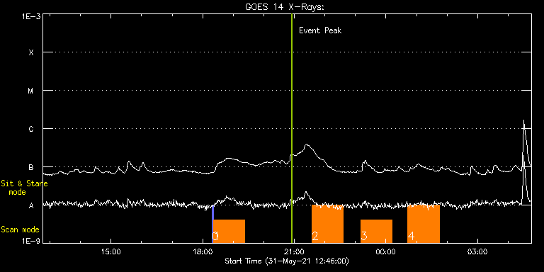 EIS Observation timeline overlay to GOES-Xray curve Code 1" 2" 40" 266" EIS Observations list for this event: STUDY ACRONYM ID DATE OBSERVED DESCRIPTION NOAA# TARGET 0 PRY_slot_contextLITE | 77396 | 2021/05/31 18:17:54 | EIS Spectral Atlas (off-limb; N. Pole) | | Active Region TIMELINE ID DATE OBSERVED FITS FILE XCEN (+W/-E) YCEN (+N/-S) DUR ----------------------------------------------------------------------------------------------------------------- 77396 | 2021/05/31 18:17:54.000 | eis_l0_20210531_181754.fits.gz | -34.26 | 952.59 | 2m56s 1 dhb_atlas_120m_30" | 77397 | 2021/05/31 18:21:16 | EIS Spectral Atlas (off-limb; N. Pole) | | Quiet Sun TIMELINE ID DATE OBSERVED FITS FILE XCEN (+W/-E) YCEN (+N/-S) DUR ----------------------------------------------------------------------------------------------------------------- 77397 | 2021/05/31 18:21:16.000 | eis_l0_20210531_182116.fits.gz | -19.52 | 952.43 | 1h0m48s 2 Large_CH_Map | 77370 | 2021/05/31 21:34:08 | HOP 336 (Cycle 25 bright points) North | | Quiet Sun TIMELINE ID DATE OBSERVED FITS FILE XCEN (+W/-E) YCEN (+N/-S) DUR ----------------------------------------------------------------------------------------------------------------- 77370 | 2021/05/31 21:34:08.000 | eis_l0_20210531_213408.fits.gz | -19.99 | 516.66 | 1h1m53s 3 Large_CH_Map | 77371 | 2021/05/31 23:10:08 | HOP 336 (Cycle 25 bright points) South | | Quiet Sun TIMELINE ID DATE OBSERVED FITS FILE XCEN (+W/-E) YCEN (+N/-S) DUR ----------------------------------------------------------------------------------------------------------------- 77371 | 2021/05/31 23:10:08.000 | eis_l0_20210531_231008.fits.gz | -19.59 | -639.58 | 1h1m53s 4 Large_CH_Map | 77372 | 2021/06/01 00:43:08 | HOP 336 (Cycle 25 bright points) South | | Quiet Sun TIMELINE ID DATE OBSERVED FITS FILE XCEN (+W/-E) YCEN (+N/-S) DUR ----------------------------------------------------------------------------------------------------------------- 77372 | 2021/06/01 00:43:08.000 | eis_l0_20210601_004308.fits.gz | -19.67 | -639.50 | 1h1m52s : Check study information : Download file : View thumbnails For this event, also check for: