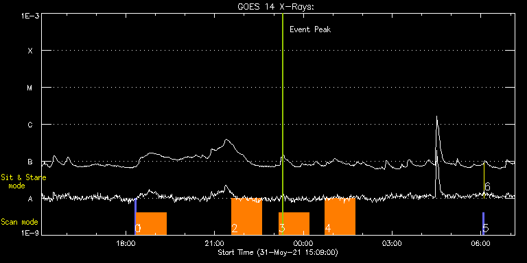 EIS Observation timeline overlay to GOES-Xray curve Code 1" 2" 40" 266" EIS Observations list for this event: STUDY ACRONYM ID DATE OBSERVED DESCRIPTION NOAA# TARGET 0 PRY_slot_contextLITE | 77396 | 2021/05/31 18:17:54 | EIS Spectral Atlas (off-limb; N. Pole) | | Active Region TIMELINE ID DATE OBSERVED FITS FILE XCEN (+W/-E) YCEN (+N/-S) DUR ----------------------------------------------------------------------------------------------------------------- 77396 | 2021/05/31 18:17:54.000 | eis_l0_20210531_181754.fits.gz | -34.26 | 952.59 | 2m56s 1 dhb_atlas_120m_30" | 77397 | 2021/05/31 18:21:16 | EIS Spectral Atlas (off-limb; N. Pole) | | Quiet Sun TIMELINE ID DATE OBSERVED FITS FILE XCEN (+W/-E) YCEN (+N/-S) DUR ----------------------------------------------------------------------------------------------------------------- 77397 | 2021/05/31 18:21:16.000 | eis_l0_20210531_182116.fits.gz | -19.52 | 952.43 | 1h0m48s 2 Large_CH_Map | 77370 | 2021/05/31 21:34:08 | HOP 336 (Cycle 25 bright points) North | | Quiet Sun TIMELINE ID DATE OBSERVED FITS FILE XCEN (+W/-E) YCEN (+N/-S) DUR ----------------------------------------------------------------------------------------------------------------- 77370 | 2021/05/31 21:34:08.000 | eis_l0_20210531_213408.fits.gz | -19.99 | 516.66 | 1h1m53s 3 Large_CH_Map | 77371 | 2021/05/31 23:10:08 | HOP 336 (Cycle 25 bright points) South | | Quiet Sun TIMELINE ID DATE OBSERVED FITS FILE XCEN (+W/-E) YCEN (+N/-S) DUR ----------------------------------------------------------------------------------------------------------------- 77371 | 2021/05/31 23:10:08.000 | eis_l0_20210531_231008.fits.gz | -19.59 | -639.58 | 1h1m53s 4 Large_CH_Map | 77372 | 2021/06/01 00:43:08 | HOP 336 (Cycle 25 bright points) South | | Quiet Sun TIMELINE ID DATE OBSERVED FITS FILE XCEN (+W/-E) YCEN (+N/-S) DUR ----------------------------------------------------------------------------------------------------------------- 77372 | 2021/06/01 00:43:08.000 | eis_l0_20210601_004308.fits.gz | -19.67 | -639.50 | 1h1m52s 5 PRY_slot_contextLITE | 77387 | 2021/06/01 06:03:18 | Pointing Monitoring | 2827 | Active Region TIMELINE ID DATE OBSERVED FITS FILE XCEN (+W/-E) YCEN (+N/-S) DUR ----------------------------------------------------------------------------------------------------------------- 77387 | 2021/06/01 06:03:18.000 | eis_l0_20210601_060318.fits.gz | -15.21 | -0.65 | 2m56s 6 XRT_synop_AIA | 77427 | 2021/06/01 06:06:32 | Pointing Monitoring | 2827 | Quiet Sun TIMELINE ID DATE OBSERVED FITS FILE XCEN (+W/-E) YCEN (+N/-S) DUR ----------------------------------------------------------------------------------------------------------------- 77427 | 2021/06/01 06:06:32.000 | eis_l0_20210601_060632.fits.gz | -132.57 | -0.50 | 11s : Check study information : Download file : View thumbnails For this event, also check for: