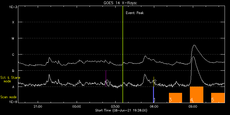 EIS Observation timeline overlay to GOES-Xray curve Code 1" 2" 40" 266" EIS Observations list for this event: STUDY ACRONYM ID DATE OBSERVED DESCRIPTION NOAA# TARGET 0 regcal070 | 77516 | 2021/06/09 02:15:12 | Flat field with overscan pixels (50*8) | | Engineering TIMELINE ID DATE OBSERVED FITS FILE XCEN (+W/-E) YCEN (+N/-S) DUR ----------------------------------------------------------------------------------------------------------------- 77516 | 2021/06/09 02:15:12.000 | eis_l0_20210609_021512.fits.gz | 14.59 | 205.58 | 2s 1 PRY_slot_contextLITE | 77499 | 2021/06/09 05:55:13 | Pointing Monitoring | 2832 | Active Region TIMELINE ID DATE OBSERVED FITS FILE XCEN (+W/-E) YCEN (+N/-S) DUR ----------------------------------------------------------------------------------------------------------------- 77499 | 2021/06/09 05:55:13.000 | eis_l0_20210609_055513.fits.gz | -15.29 | -0.42 | 2m56s 2 XRT_synop_AIA | 77500 | 2021/06/09 05:58:28 | Pointing Monitoring | 2832 | Quiet Sun TIMELINE ID DATE OBSERVED FITS FILE XCEN (+W/-E) YCEN (+N/-S) DUR ----------------------------------------------------------------------------------------------------------------- 77500 | 2021/06/09 05:58:28.000 | eis_l0_20210609_055828.fits.gz | -132.64 | -0.42 | 10s 3 HPW021VEL260x512v2 | 77521 | 2021/06/09 07:08:50 | Active Region Studies | 2829 | Active Region TIMELINE ID DATE OBSERVED FITS FILE XCEN (+W/-E) YCEN (+N/-S) DUR ----------------------------------------------------------------------------------------------------------------- 77521 | 2021/06/09 07:08:50.000 | eis_l0_20210609_070850.fits.gz | 453.43 | -364.17 | 1h0m44s 4 HPW021VEL260x512v2 | 77522 | 2021/06/09 08:47:13 | Active Region Studies | 2829 | Active Region TIMELINE ID DATE OBSERVED FITS FILE XCEN (+W/-E) YCEN (+N/-S) DUR ----------------------------------------------------------------------------------------------------------------- 77522 | 2021/06/09 08:47:13.000 | eis_l0_20210609_084713.fits.gz | 465.09 | -364.25 | 1h0m45s 5 HPW021VEL260x512v2 | 77523 | 2021/06/09 10:25:13 | Active Region Studies | 2829 | Active Region TIMELINE ID DATE OBSERVED FITS FILE XCEN (+W/-E) YCEN (+N/-S) DUR ----------------------------------------------------------------------------------------------------------------- 77523 | 2021/06/09 10:25:13.000 | eis_l0_20210609_102513.fits.gz | 476.76 | -364.33 | 1h0m44s : Check study information : Download file : View thumbnails For this event, also check for: