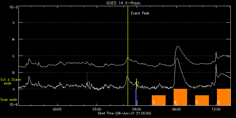 EIS Observation timeline overlay to GOES-Xray curve Code 1" 2" 40" 266" EIS Observations list for this event: STUDY ACRONYM ID DATE OBSERVED DESCRIPTION NOAA# TARGET 0 regcal070 | 77516 | 2021/06/09 02:15:12 | Flat field with overscan pixels (50*8) | | Engineering TIMELINE ID DATE OBSERVED FITS FILE XCEN (+W/-E) YCEN (+N/-S) DUR ----------------------------------------------------------------------------------------------------------------- 77516 | 2021/06/09 02:15:12.000 | eis_l0_20210609_021512.fits.gz | 14.59 | 205.58 | 2s 1 PRY_slot_contextLITE | 77499 | 2021/06/09 05:55:13 | Pointing Monitoring | 2832 | Active Region TIMELINE ID DATE OBSERVED FITS FILE XCEN (+W/-E) YCEN (+N/-S) DUR ----------------------------------------------------------------------------------------------------------------- 77499 | 2021/06/09 05:55:13.000 | eis_l0_20210609_055513.fits.gz | -15.29 | -0.42 | 2m56s 2 XRT_synop_AIA | 77500 | 2021/06/09 05:58:28 | Pointing Monitoring | 2832 | Quiet Sun TIMELINE ID DATE OBSERVED FITS FILE XCEN (+W/-E) YCEN (+N/-S) DUR ----------------------------------------------------------------------------------------------------------------- 77500 | 2021/06/09 05:58:28.000 | eis_l0_20210609_055828.fits.gz | -132.64 | -0.42 | 10s 3 HPW021VEL260x512v2 | 77521 | 2021/06/09 07:08:50 | Active Region Studies | 2829 | Active Region TIMELINE ID DATE OBSERVED FITS FILE XCEN (+W/-E) YCEN (+N/-S) DUR ----------------------------------------------------------------------------------------------------------------- 77521 | 2021/06/09 07:08:50.000 | eis_l0_20210609_070850.fits.gz | 453.43 | -364.17 | 1h0m44s 4 HPW021VEL260x512v2 | 77522 | 2021/06/09 08:47:13 | Active Region Studies | 2829 | Active Region TIMELINE ID DATE OBSERVED FITS FILE XCEN (+W/-E) YCEN (+N/-S) DUR ----------------------------------------------------------------------------------------------------------------- 77522 | 2021/06/09 08:47:13.000 | eis_l0_20210609_084713.fits.gz | 465.09 | -364.25 | 1h0m45s 5 HPW021VEL260x512v2 | 77523 | 2021/06/09 10:25:13 | Active Region Studies | 2829 | Active Region TIMELINE ID DATE OBSERVED FITS FILE XCEN (+W/-E) YCEN (+N/-S) DUR ----------------------------------------------------------------------------------------------------------------- 77523 | 2021/06/09 10:25:13.000 | eis_l0_20210609_102513.fits.gz | 476.76 | -364.33 | 1h0m44s 6 HPW021VEL260x512v2 | 77524 | 2021/06/09 12:03:40 | Active Region Studies | 2829 | Active Region TIMELINE ID DATE OBSERVED FITS FILE XCEN (+W/-E) YCEN (+N/-S) DUR ----------------------------------------------------------------------------------------------------------------- 77524 | 2021/06/09 12:03:40.000 | eis_l0_20210609_120340.fits.gz | 488.52 | -364.33 | 1h0m45s : Check study information : Download file : View thumbnails For this event, also check for: