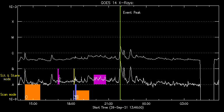EIS Observation timeline overlay to GOES-Xray curve Code 1" 2" 40" 266" EIS Observations list for this event: STUDY ACRONYM ID DATE OBSERVED DESCRIPTION NOAA# TARGET 0 raster_hefe3 | 79069 | 2021/09/29 14:20:54 | HOP 0361(Measuring high time cadence d | 2871 | Active Region TIMELINE ID DATE OBSERVED FITS FILE XCEN (+W/-E) YCEN (+N/-S) DUR ----------------------------------------------------------------------------------------------------------------- 79069 | 2021/09/29 14:20:54.000 | eis_l0_20210929_142054.fits.gz | 683.54 | -511.88 | 1h12m18s 1 regcal071 | 79096 | 2021/09/29 16:57:11 | Dark exposures, CCD bottom rows (100s | | Engineering TIMELINE ID DATE OBSERVED FITS FILE XCEN (+W/-E) YCEN (+N/-S) DUR ----------------------------------------------------------------------------------------------------------------- 79096 | 2021/09/29 16:57:11.000 | eis_l0_20210929_165711.fits.gz | 94.93 | -314.15 | 3m22s 2 regcal072 | 79097 | 2021/09/29 17:01:00 | Dark exposures, top CCD rows (100s exp | | Engineering TIMELINE ID DATE OBSERVED FITS FILE XCEN (+W/-E) YCEN (+N/-S) DUR ----------------------------------------------------------------------------------------------------------------- 79097 | 2021/09/29 17:01:00.000 | eis_l0_20210929_170100.fits.gz | 95.39 | 196.85 | 3m22s 3 PRY_slot_contextLITE | 79079 | 2021/09/29 18:11:49 | Pointing Monitoring | | Active Region TIMELINE ID DATE OBSERVED FITS FILE XCEN (+W/-E) YCEN (+N/-S) DUR ----------------------------------------------------------------------------------------------------------------- 79079 | 2021/09/29 18:11:49.000 | eis_l0_20210929_181149.fits.gz | -15.21 | -0.50 | 2m57s 4 XRT_synop_AIA | 79080 | 2021/09/29 18:15:04 | Pointing Monitoring | | Quiet Sun TIMELINE ID DATE OBSERVED FITS FILE XCEN (+W/-E) YCEN (+N/-S) DUR ----------------------------------------------------------------------------------------------------------------- 79080 | 2021/09/29 18:15:04.000 | eis_l0_20210929_181504.fits.gz | -132.57 | -0.50 | 10s 5 PRY_slot_contextLIQS | 79094 | 2021/09/29 18:19:57 | HOP 0420(Study of MHD Waves in the Chr | | Quiet Sun TIMELINE ID DATE OBSERVED FITS FILE XCEN (+W/-E) YCEN (+N/-S) DUR ----------------------------------------------------------------------------------------------------------------- 79094 | 2021/09/29 18:19:57.000 | eis_l0_20210929_181957.fits.gz | 54.66 | -12.92 | 5m27s 6 dhb_atlas_30x512 | 79095 | 2021/09/29 18:25:49 | HOP 0420(Study of MHD Waves in the Chr | | Quiet Sun TIMELINE ID DATE OBSERVED FITS FILE XCEN (+W/-E) YCEN (+N/-S) DUR ----------------------------------------------------------------------------------------------------------------- 79095 | 2021/09/29 18:25:49.000 | eis_l0_20210929_182549.fits.gz | 70.25 | -13.00 | 1h0m56s 7 HPW021VEL001x512v1_b | 79093 | 2021/09/29 19:48:56 | HOP 0420(Study of MHD Waves in the Chr | | Active Region TIMELINE ID DATE OBSERVED FITS FILE XCEN (+W/-E) YCEN (+N/-S) DUR ----------------------------------------------------------------------------------------------------------------- 79093 | 2021/09/29 19:48:56.000 | eis_l0_20210929_194856.fits.gz | 83.48 | -12.77 | 56m43s : Check study information : Download file : View thumbnails For this event, also check for: