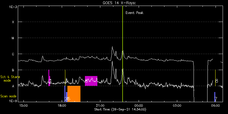 EIS Observation timeline overlay to GOES-Xray curve Code 1" 2" 40" 266" EIS Observations list for this event: STUDY ACRONYM ID DATE OBSERVED DESCRIPTION NOAA# TARGET 0 regcal071 | 79096 | 2021/09/29 16:57:11 | Dark exposures, CCD bottom rows (100s | | Engineering TIMELINE ID DATE OBSERVED FITS FILE XCEN (+W/-E) YCEN (+N/-S) DUR ----------------------------------------------------------------------------------------------------------------- 79096 | 2021/09/29 16:57:11.000 | eis_l0_20210929_165711.fits.gz | 94.93 | -314.15 | 3m22s 1 regcal072 | 79097 | 2021/09/29 17:01:00 | Dark exposures, top CCD rows (100s exp | | Engineering TIMELINE ID DATE OBSERVED FITS FILE XCEN (+W/-E) YCEN (+N/-S) DUR ----------------------------------------------------------------------------------------------------------------- 79097 | 2021/09/29 17:01:00.000 | eis_l0_20210929_170100.fits.gz | 95.39 | 196.85 | 3m22s 2 PRY_slot_contextLITE | 79079 | 2021/09/29 18:11:49 | Pointing Monitoring | | Active Region TIMELINE ID DATE OBSERVED FITS FILE XCEN (+W/-E) YCEN (+N/-S) DUR ----------------------------------------------------------------------------------------------------------------- 79079 | 2021/09/29 18:11:49.000 | eis_l0_20210929_181149.fits.gz | -15.21 | -0.50 | 2m57s 3 XRT_synop_AIA | 79080 | 2021/09/29 18:15:04 | Pointing Monitoring | | Quiet Sun TIMELINE ID DATE OBSERVED FITS FILE XCEN (+W/-E) YCEN (+N/-S) DUR ----------------------------------------------------------------------------------------------------------------- 79080 | 2021/09/29 18:15:04.000 | eis_l0_20210929_181504.fits.gz | -132.57 | -0.50 | 10s 4 PRY_slot_contextLIQS | 79094 | 2021/09/29 18:19:57 | HOP 0420(Study of MHD Waves in the Chr | | Quiet Sun TIMELINE ID DATE OBSERVED FITS FILE XCEN (+W/-E) YCEN (+N/-S) DUR ----------------------------------------------------------------------------------------------------------------- 79094 | 2021/09/29 18:19:57.000 | eis_l0_20210929_181957.fits.gz | 54.66 | -12.92 | 5m27s 5 dhb_atlas_30x512 | 79095 | 2021/09/29 18:25:49 | HOP 0420(Study of MHD Waves in the Chr | | Quiet Sun TIMELINE ID DATE OBSERVED FITS FILE XCEN (+W/-E) YCEN (+N/-S) DUR ----------------------------------------------------------------------------------------------------------------- 79095 | 2021/09/29 18:25:49.000 | eis_l0_20210929_182549.fits.gz | 70.25 | -13.00 | 1h0m56s 6 HPW021VEL001x512v1_b | 79093 | 2021/09/29 19:48:56 | HOP 0420(Study of MHD Waves in the Chr | | Active Region TIMELINE ID DATE OBSERVED FITS FILE XCEN (+W/-E) YCEN (+N/-S) DUR ----------------------------------------------------------------------------------------------------------------- 79093 | 2021/09/29 19:48:56.000 | eis_l0_20210929_194856.fits.gz | 83.48 | -12.77 | 56m43s 7 PRY_slot_contextLITE | 79081 | 2021/09/30 05:55:33 | Pointing Monitoring | | Active Region TIMELINE ID DATE OBSERVED FITS FILE XCEN (+W/-E) YCEN (+N/-S) DUR ----------------------------------------------------------------------------------------------------------------- 79081 | 2021/09/30 05:55:33.000 | eis_l0_20210930_055533.fits.gz | -15.29 | -0.42 | 2m57s 8 XRT_synop_AIA | 79082 | 2021/09/30 05:58:48 | Pointing Monitoring | | Quiet Sun TIMELINE ID DATE OBSERVED FITS FILE XCEN (+W/-E) YCEN (+N/-S) DUR ----------------------------------------------------------------------------------------------------------------- 79082 | 2021/09/30 05:58:48.000 | eis_l0_20210930_055848.fits.gz | -132.57 | -0.42 | 10s : Check study information : Download file : View thumbnails For this event, also check for:
