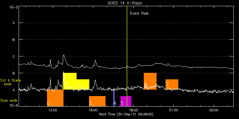 EIS Observation timeline overlay to GOES-Xray curve Code 1" 2" 40" 266" EIS Observations list for this event: STUDY ACRONYM ID DATE OBSERVED DESCRIPTION NOAA# TARGET 0 raster_hefe3 | 79098 | 2021/09/30 11:34:50 | HOP 0361(Measuring high time cadence d | | Active Region TIMELINE ID DATE OBSERVED FITS FILE XCEN (+W/-E) YCEN (+N/-S) DUR ----------------------------------------------------------------------------------------------------------------- 79098 | 2021/09/30 11:34:50.000 | eis_l0_20210930_113450.fits.gz | 736.35 | -536.57 | 1h12m19s 1 fast_slot_hefe3 | 79099 | 2021/09/30 12:47:34 | HOP 0361(Measuring high time cadence d | | Active Region TIMELINE ID DATE OBSERVED FITS FILE XCEN (+W/-E) YCEN (+N/-S) DUR ----------------------------------------------------------------------------------------------------------------- 79099 | 2021/09/30 12:47:34.000 | eis_l0_20210930_124734.fits.gz | 607.56 | -535.57 | 57m8s 2 fast_slot_hefe3 | 79100 | 2021/09/30 13:44:47 | HOP 0361(Measuring high time cadence d | | Active Region TIMELINE ID DATE OBSERVED FITS FILE XCEN (+W/-E) YCEN (+N/-S) DUR ----------------------------------------------------------------------------------------------------------------- 79100 | 2021/09/30 13:44:47.000 | eis_l0_20210930_134447.fits.gz | 610.44 | -534.72 | 57m10s 3 raster_hefe3 | 79102 | 2021/09/30 14:42:08 | HOP 0361(Measuring high time cadence d | | Active Region TIMELINE ID DATE OBSERVED FITS FILE XCEN (+W/-E) YCEN (+N/-S) DUR ----------------------------------------------------------------------------------------------------------------- 79102 | 2021/09/30 14:42:08.000 | eis_l0_20210930_144208.fits.gz | 745.10 | -534.10 | 1h12m18s 4 PRY_slot_contextLIQS | 79111 | 2021/09/30 16:30:20 | HOP 0420(Study of MHD Waves in the Chr | 2880 | Quiet Sun TIMELINE ID DATE OBSERVED FITS FILE XCEN (+W/-E) YCEN (+N/-S) DUR ----------------------------------------------------------------------------------------------------------------- 79111 | 2021/09/30 16:30:20.000 | eis_l0_20210930_163020.fits.gz | -501.12 | 389.24 | 5m27s 5 HPW021VEL120x512v2_b | 79112 | 2021/09/30 17:03:20 | HOP 0420(Study of MHD Waves in the Chr | | Active Region TIMELINE ID DATE OBSERVED FITS FILE XCEN (+W/-E) YCEN (+N/-S) DUR ----------------------------------------------------------------------------------------------------------------- 79112 | 2021/09/30 17:03:20.000 | eis_l0_20210930_170320.fits.gz | -482.77 | 389.01 | 46m53s 6 HPW021VEL001x512v2 | 79113 | 2021/09/30 18:47:27 | HOP 0420(Study of MHD Waves in the Chr | | Active Region TIMELINE ID DATE OBSERVED FITS FILE XCEN (+W/-E) YCEN (+N/-S) DUR ----------------------------------------------------------------------------------------------------------------- 79113 | 2021/09/30 18:47:27.000 | eis_l0_20210930_184727.fits.gz | -471.55 | 388.24 | 55m50s 7 HPW021VEL001x512v2 | 79114 | 2021/09/30 20:24:11 | HOP 0420(Study of MHD Waves in the Chr | | Active Region TIMELINE ID DATE OBSERVED FITS FILE XCEN (+W/-E) YCEN (+N/-S) DUR ----------------------------------------------------------------------------------------------------------------- 79114 | 2021/09/30 20:24:11.000 | eis_l0_20210930_202411.fits.gz | -461.20 | 387.54 | 55m49s : Check study information : Download file : View thumbnails For this event, also check for: