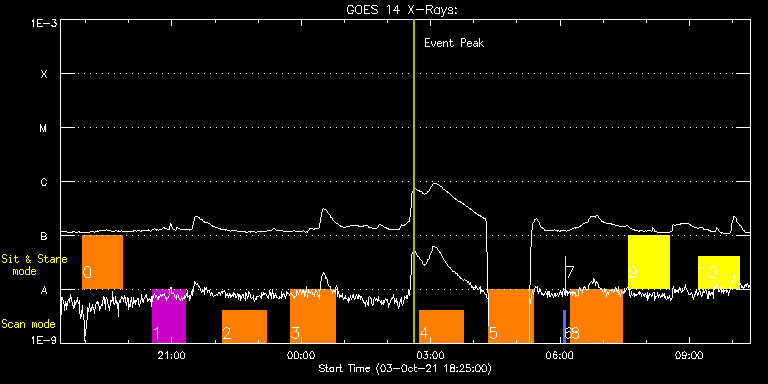 EIS Observation timeline overlay to GOES-Xray curve Code 1" 2" 40" 266" EIS Observations list for this event: STUDY ACRONYM ID DATE OBSERVED DESCRIPTION NOAA# TARGET 0 HPW021VEL001x512v2 | 79165 | 2021/10/03 18:55:56 | HOP 0420(Study of MHD Waves in the Chr | | Active Region TIMELINE ID DATE OBSERVED FITS FILE XCEN (+W/-E) YCEN (+N/-S) DUR ----------------------------------------------------------------------------------------------------------------- 79165 | 2021/10/03 18:55:56.000 | eis_l0_20211003_185556.fits.gz | 6.18 | 376.03 | 55m51s 1 HPW021VEL120x512v2_b | 79166 | 2021/10/03 20:32:26 | HOP 0420(Study of MHD Waves in the Chr | 2880 | Active Region TIMELINE ID DATE OBSERVED FITS FILE XCEN (+W/-E) YCEN (+N/-S) DUR ----------------------------------------------------------------------------------------------------------------- 79166 | 2021/10/03 20:32:26.000 | eis_l0_20211003_203226.fits.gz | 72.27 | 376.34 | 46m54s 2 Large_CH_Map | 79146 | 2021/10/03 22:09:56 | HOP 336 (Cycle 25 bright points) North | | Quiet Sun TIMELINE ID DATE OBSERVED FITS FILE XCEN (+W/-E) YCEN (+N/-S) DUR ----------------------------------------------------------------------------------------------------------------- 79146 | 2021/10/03 22:09:56.000 | eis_l0_20211003_220956.fits.gz | -41.99 | 458.97 | 1h1m53s 3 Large_CH_Map | 79149 | 2021/10/03 23:45:10 | HOP 336 (Cycle 25 bright points) North | | Quiet Sun TIMELINE ID DATE OBSERVED FITS FILE XCEN (+W/-E) YCEN (+N/-S) DUR ----------------------------------------------------------------------------------------------------------------- 79149 | 2021/10/03 23:45:10.000 | eis_l0_20211003_234510.fits.gz | -30.17 | 458.81 | 1h1m53s 4 Large_CH_Map | 79147 | 2021/10/04 02:44:10 | HOP 336 (Cycle 25 bright points) South | | Quiet Sun TIMELINE ID DATE OBSERVED FITS FILE XCEN (+W/-E) YCEN (+N/-S) DUR ----------------------------------------------------------------------------------------------------------------- 79147 | 2021/10/04 02:44:10.000 | eis_l0_20211004_024410.fits.gz | -35.89 | -697.58 | 1h1m53s 5 Large_CH_Map | 79150 | 2021/10/04 04:20:40 | HOP 336 (Cycle 25 bright points) South | | Quiet Sun TIMELINE ID DATE OBSERVED FITS FILE XCEN (+W/-E) YCEN (+N/-S) DUR ----------------------------------------------------------------------------------------------------------------- 79150 | 2021/10/04 04:20:40.000 | eis_l0_20211004_042040.fits.gz | -26.00 | -697.66 | 1h1m53s 6 PRY_slot_contextLITE | 79142 | 2021/10/04 06:04:50 | Pointing Monitoring | | Active Region TIMELINE ID DATE OBSERVED FITS FILE XCEN (+W/-E) YCEN (+N/-S) DUR ----------------------------------------------------------------------------------------------------------------- 79142 | 2021/10/04 06:04:50.000 | eis_l0_20211004_060450.fits.gz | -15.29 | -0.50 | 2m56s 7 XRT_synop_AIA | 79143 | 2021/10/04 06:08:04 | Pointing Monitoring | | Quiet Sun TIMELINE ID DATE OBSERVED FITS FILE XCEN (+W/-E) YCEN (+N/-S) DUR ----------------------------------------------------------------------------------------------------------------- 79143 | 2021/10/04 06:08:04.000 | eis_l0_20211004_060804.fits.gz | -132.49 | -0.42 | 10s 8 raster_hefe3 | 79151 | 2021/10/04 06:14:50 | HOP 0361(Measuring high time cadence d | | Active Region TIMELINE ID DATE OBSERVED FITS FILE XCEN (+W/-E) YCEN (+N/-S) DUR ----------------------------------------------------------------------------------------------------------------- 79151 | 2021/10/04 06:14:50.000 | eis_l0_20211004_061450.fits.gz | 144.87 | 378.04 | 1h12m18s 9 fast_slot_hefe3 | 79172 | 2021/10/04 07:35:33 | HOP 0361(Measuring high time cadence d | | Active Region TIMELINE ID DATE OBSERVED FITS FILE XCEN (+W/-E) YCEN (+N/-S) DUR ----------------------------------------------------------------------------------------------------------------- 79172 | 2021/10/04 07:35:33.000 | eis_l0_20211004_073533.fits.gz | 22.64 | 378.27 | 57m8s 10 fast_slot_hefe3 | 79171 | 2021/10/04 09:12:13 | HOP 0361(Measuring high time cadence d | | Active Region TIMELINE ID DATE OBSERVED FITS FILE XCEN (+W/-E) YCEN (+N/-S) DUR ----------------------------------------------------------------------------------------------------------------- 79171 | 2021/10/04 09:12:13.000 | eis_l0_20211004_091213.fits.gz | 34.87 | 378.66 | 57m8s : Check study information : Download file : View thumbnails For this event, also check for: