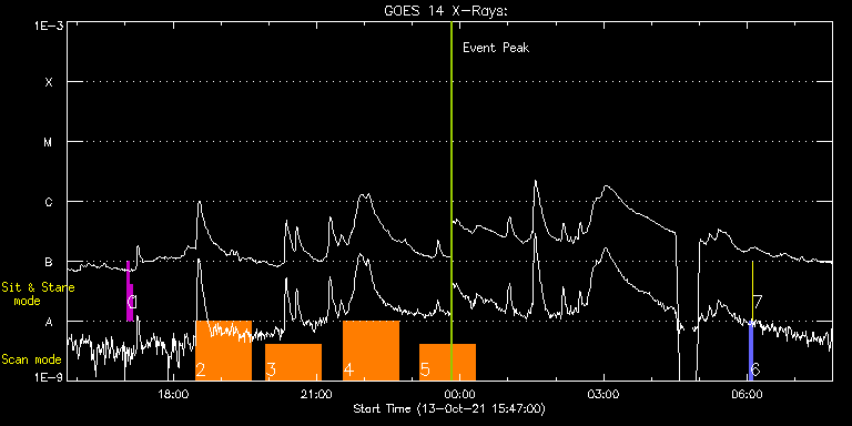 EIS Observation timeline overlay to GOES-Xray curve Code 1" 2" 40" 266" EIS Observations list for this event: STUDY ACRONYM ID DATE OBSERVED DESCRIPTION NOAA# TARGET 0 regcal071 | 79334 | 2021/10/13 17:02:11 | Dark exposures, CCD bottom rows (100s | | Engineering TIMELINE ID DATE OBSERVED FITS FILE XCEN (+W/-E) YCEN (+N/-S) DUR ----------------------------------------------------------------------------------------------------------------- 79334 | 2021/10/13 17:02:11.000 | eis_l0_20211013_170211.fits.gz | 680.93 | -142.35 | 3m22s 1 regcal072 | 79335 | 2021/10/13 17:06:00 | Dark exposures, top CCD rows (100s exp | | Engineering TIMELINE ID DATE OBSERVED FITS FILE XCEN (+W/-E) YCEN (+N/-S) DUR ----------------------------------------------------------------------------------------------------------------- 79335 | 2021/10/13 17:06:00.000 | eis_l0_20211013_170600.fits.gz | 681.31 | 368.65 | 3m22s 2 HOP81_new_study | 79310 | 2021/10/13 18:27:44 | HOP 81(Polar Monitoring Campaign durin | | Coronal Hole TIMELINE ID DATE OBSERVED FITS FILE XCEN (+W/-E) YCEN (+N/-S) DUR ----------------------------------------------------------------------------------------------------------------- 79310 | 2021/10/13 18:27:44.000 | eis_l0_20211013_182744.fits.gz | -19.15 | -904.43 | 1h9m45s 3 HOP81_new_study | 79311 | 2021/10/13 19:56:13 | HOP 81(Polar Monitoring Campaign durin | | Coronal Hole TIMELINE ID DATE OBSERVED FITS FILE XCEN (+W/-E) YCEN (+N/-S) DUR ----------------------------------------------------------------------------------------------------------------- 79311 | 2021/10/13 19:56:13.000 | eis_l0_20211013_195613.fits.gz | -19.25 | -904.51 | 1h9m44s 4 HOP81_new_study | 79312 | 2021/10/13 21:33:40 | HOP 81(Polar Monitoring Campaign durin | | Coronal Hole TIMELINE ID DATE OBSERVED FITS FILE XCEN (+W/-E) YCEN (+N/-S) DUR ----------------------------------------------------------------------------------------------------------------- 79312 | 2021/10/13 21:33:40.000 | eis_l0_20211013_213340.fits.gz | -19.25 | -904.35 | 1h9m44s 5 HOP81_new_study | 79313 | 2021/10/13 23:09:43 | HOP 81(Polar Monitoring Campaign durin | | Coronal Hole TIMELINE ID DATE OBSERVED FITS FILE XCEN (+W/-E) YCEN (+N/-S) DUR ----------------------------------------------------------------------------------------------------------------- 79313 | 2021/10/13 23:09:43.000 | eis_l0_20211013_230943.fits.gz | -19.33 | -904.43 | 1h9m45s 6 PRY_slot_contextLITE | 79323 | 2021/10/14 06:03:20 | Pointing Monitoring | | Active Region TIMELINE ID DATE OBSERVED FITS FILE XCEN (+W/-E) YCEN (+N/-S) DUR ----------------------------------------------------------------------------------------------------------------- 79323 | 2021/10/14 06:03:20.000 | eis_l0_20211014_060320.fits.gz | -15.21 | -0.42 | 2m56s 7 XRT_synop_AIA | 79324 | 2021/10/14 06:06:34 | Pointing Monitoring | | Quiet Sun TIMELINE ID DATE OBSERVED FITS FILE XCEN (+W/-E) YCEN (+N/-S) DUR ----------------------------------------------------------------------------------------------------------------- 79324 | 2021/10/14 06:06:34.000 | eis_l0_20211014_060634.fits.gz | -132.49 | -0.50 | 10s : Check study information : Download file : View thumbnails For this event, also check for: