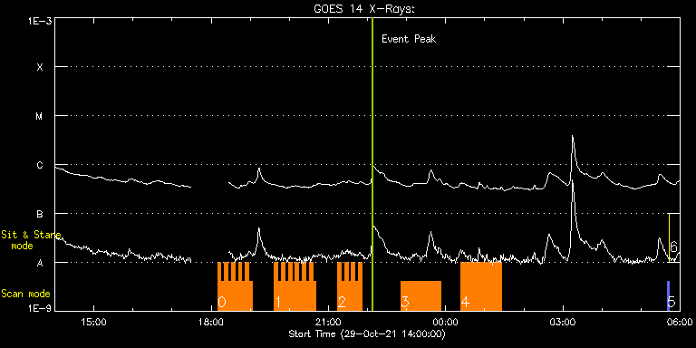 EIS Observation timeline overlay to GOES-Xray curve Code 1" 2" 40" 266" EIS Observations list for this event: STUDY ACRONYM ID DATE OBSERVED DESCRIPTION NOAA# TARGET 0 HH_Flare+AR_180x152 | 79577 | 2021/10/29 18:09:50 | Flare studies | 2887 | Flare TIMELINE ID DATE OBSERVED FITS FILE XCEN (+W/-E) YCEN (+N/-S) DUR ----------------------------------------------------------------------------------------------------------------- 79577 | 2021/10/29 18:09:50.000 | eis_l0_20211029_180950.fits.gz | 254.48 | -505.84 | 5m19s 79577 | 2021/10/29 18:15:11.000 | eis_l0_20211029_181511.fits.gz | 255.10 | -505.68 | 5m18s 79577 | 2021/10/29 18:20:32.000 | eis_l0_20211029_182032.fits.gz | 255.79 | -505.76 | 5m18s 79577 | 2021/10/29 18:25:53.000 | eis_l0_20211029_182553.fits.gz | 256.49 | -505.84 | 5m18s 79577 | 2021/10/29 18:31:14.000 | eis_l0_20211029_183114.fits.gz | 257.18 | -505.61 | 5m18s 79577 | 2021/10/29 18:36:35.000 | eis_l0_20211029_183635.fits.gz | 257.88 | -505.61 | 5m18s 79577 | 2021/10/29 18:41:56.000 | eis_l0_20211029_184156.fits.gz | 258.57 | -505.53 | 5m18s 79577 | 2021/10/29 18:47:17.000 | eis_l0_20211029_184717.fits.gz | 259.19 | -505.61 | 5m18s 79577 | 2021/10/29 18:52:38.000 | eis_l0_20211029_185238.fits.gz | 259.73 | -505.53 | 5m17s 79577 | 2021/10/29 18:57:58.000 | eis_l0_20211029_185758.fits.gz | 260.58 | -505.53 | 5m19s 1 HH_Flare+AR_180x152 | 79575 | 2021/10/29 19:37:13 | | 2887 | Flare TIMELINE ID DATE OBSERVED FITS FILE XCEN (+W/-E) YCEN (+N/-S) DUR ----------------------------------------------------------------------------------------------------------------- 79575 | 2021/10/29 19:37:13.000 | eis_l0_20211029_193713.fits.gz | 265.35 | -505.38 | 5m19s 79575 | 2021/10/29 19:42:35.000 | eis_l0_20211029_194235.fits.gz | 265.89 | -505.30 | 5m17s 79575 | 2021/10/29 19:47:55.000 | eis_l0_20211029_194755.fits.gz | 266.67 | -505.45 | 5m17s 79575 | 2021/10/29 19:53:15.000 | eis_l0_20211029_195315.fits.gz | 267.28 | -505.30 | 5m18s 79575 | 2021/10/29 19:58:36.000 | eis_l0_20211029_195836.fits.gz | 267.98 | -505.22 | 5m18s 79575 | 2021/10/29 20:03:57.000 | eis_l0_20211029_200357.fits.gz | 268.60 | -505.30 | 5m18s 79575 | 2021/10/29 20:09:18.000 | eis_l0_20211029_200918.fits.gz | 269.45 | -505.14 | 5m18s 79575 | 2021/10/29 20:14:39.000 | eis_l0_20211029_201439.fits.gz | 269.99 | -505.07 | 5m18s 79575 | 2021/10/29 20:20:00.000 | eis_l0_20211029_202000.fits.gz | 270.76 | -505.14 | 5m18s 79575 | 2021/10/29 20:25:21.000 | eis_l0_20211029_202521.fits.gz | 271.46 | -505.14 | 5m18s 79575 | 2021/10/29 20:30:42.000 | eis_l0_20211029_203042.fits.gz | 272.07 | -505.14 | 5m18s 79575 | 2021/10/29 20:36:03.000 | eis_l0_20211029_203603.fits.gz | 272.85 | -504.99 | 5m18s 2 HH_Flare+AR_180x152 | 79576 | 2021/10/29 21:14:13 | Flare stidies | 2887 | Flare TIMELINE ID DATE OBSERVED FITS FILE XCEN (+W/-E) YCEN (+N/-S) DUR ----------------------------------------------------------------------------------------------------------------- 79576 | 2021/10/29 21:14:13.000 | eis_l0_20211029_211413.fits.gz | 277.56 | -504.91 | 5m19s 79576 | 2021/10/29 21:19:35.000 | eis_l0_20211029_211935.fits.gz | 278.25 | -504.91 | 5m17s 79576 | 2021/10/29 21:24:55.000 | eis_l0_20211029_212455.fits.gz | 278.95 | -504.99 | 5m19s 79576 | 2021/10/29 21:30:17.000 | eis_l0_20211029_213017.fits.gz | 279.64 | -504.83 | 5m18s 79576 | 2021/10/29 21:35:37.000 | eis_l0_20211029_213537.fits.gz | 280.26 | -504.91 | 5m18s 79576 | 2021/10/29 21:40:58.000 | eis_l0_20211029_214058.fits.gz | 281.03 | -504.83 | 5m19s 79576 | 2021/10/29 21:46:19.000 | eis_l0_20211029_214619.fits.gz | 281.58 | -504.76 | 5m18s 3 Large_CH_Map | 79564 | 2021/10/29 22:51:13 | HOP 393 (Cycle 24/25 equatorial transi | | Quiet Sun TIMELINE ID DATE OBSERVED FITS FILE XCEN (+W/-E) YCEN (+N/-S) DUR ----------------------------------------------------------------------------------------------------------------- 79564 | 2021/10/29 22:51:13.000 | eis_l0_20211029_225113.fits.gz | -37.04 | -3.57 | 1h1m52s 4 Large_CH_Map | 79565 | 2021/10/30 00:23:43 | HOP 393 (Cycle 24/25 equatorial transi | | Quiet Sun TIMELINE ID DATE OBSERVED FITS FILE XCEN (+W/-E) YCEN (+N/-S) DUR ----------------------------------------------------------------------------------------------------------------- 79565 | 2021/10/30 00:23:43.000 | eis_l0_20211030_002343.fits.gz | -22.60 | -3.50 | 1h1m52s 5 PRY_slot_contextLITE | 79568 | 2021/10/30 05:40:19 | Pointing Monitoring | | Active Region TIMELINE ID DATE OBSERVED FITS FILE XCEN (+W/-E) YCEN (+N/-S) DUR ----------------------------------------------------------------------------------------------------------------- 79568 | 2021/10/30 05:40:19.000 | eis_l0_20211030_054019.fits.gz | -15.29 | -0.50 | 2m57s 6 XRT_synop_AIA | 79569 | 2021/10/30 05:43:34 | Pointing Monitoring | | Quiet Sun TIMELINE ID DATE OBSERVED FITS FILE XCEN (+W/-E) YCEN (+N/-S) DUR ----------------------------------------------------------------------------------------------------------------- 79569 | 2021/10/30 05:43:34.000 | eis_l0_20211030_054334.fits.gz | -132.49 | -0.58 | 10s : Check study information : Download file : View thumbnails For this event, also check for: