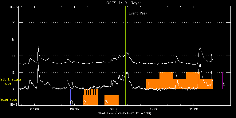 EIS Observation timeline overlay to GOES-Xray curve Code 1" 2" 40" 266" EIS Observations list for this event: STUDY ACRONYM ID DATE OBSERVED DESCRIPTION NOAA# TARGET 0 PRY_slot_contextLITE | 79568 | 2021/10/30 05:40:19 | Pointing Monitoring | | Active Region TIMELINE ID DATE OBSERVED FITS FILE XCEN (+W/-E) YCEN (+N/-S) DUR ----------------------------------------------------------------------------------------------------------------- 79568 | 2021/10/30 05:40:19.000 | eis_l0_20211030_054019.fits.gz | -15.29 | -0.50 | 2m57s 1 XRT_synop_AIA | 79569 | 2021/10/30 05:43:34 | Pointing Monitoring | | Quiet Sun TIMELINE ID DATE OBSERVED FITS FILE XCEN (+W/-E) YCEN (+N/-S) DUR ----------------------------------------------------------------------------------------------------------------- 79569 | 2021/10/30 05:43:34.000 | eis_l0_20211030_054334.fits.gz | -132.49 | -0.58 | 10s 2 HH_Flare+AR_180x152 | 79573 | 2021/10/30 06:39:49 | Flare Studies | | Flare TIMELINE ID DATE OBSERVED FITS FILE XCEN (+W/-E) YCEN (+N/-S) DUR ----------------------------------------------------------------------------------------------------------------- 79573 | 2021/10/30 06:39:49.000 | eis_l0_20211030_063949.fits.gz | 347.47 | -501.90 | 5m18s 79573 | 2021/10/30 06:45:10.000 | eis_l0_20211030_064510.fits.gz | 348.16 | -501.82 | 5m19s 79573 | 2021/10/30 06:50:31.000 | eis_l0_20211030_065031.fits.gz | 348.86 | -501.74 | 5m18s 79573 | 2021/10/30 06:55:51.000 | eis_l0_20211030_065551.fits.gz | 349.48 | -501.74 | 5m18s 79573 | 2021/10/30 07:01:11.000 | eis_l0_20211030_070111.fits.gz | 350.09 | -501.82 | 5m19s 79573 | 2021/10/30 07:06:33.000 | eis_l0_20211030_070633.fits.gz | 350.79 | -501.82 | 5m17s 79573 | 2021/10/30 07:11:53.000 | eis_l0_20211030_071153.fits.gz | 351.48 | -501.74 | 5m18s 79573 | 2021/10/30 07:17:14.000 | eis_l0_20211030_071714.fits.gz | 352.10 | -501.74 | 5m18s 79573 | 2021/10/30 07:22:35.000 | eis_l0_20211030_072235.fits.gz | 352.80 | -501.74 | 5m17s 79573 | 2021/10/30 07:27:55.000 | eis_l0_20211030_072755.fits.gz | 353.42 | -501.74 | 5m18s 79573 | 2021/10/30 07:33:16.000 | eis_l0_20211030_073316.fits.gz | 354.03 | -501.67 | 5m18s 79573 | 2021/10/30 07:38:37.000 | eis_l0_20211030_073837.fits.gz | 354.65 | -501.67 | 5m18s 3 Atlas_60 | 79574 | 2021/10/30 08:17:13 | Active Region Studies | | Quiet Sun TIMELINE ID DATE OBSERVED FITS FILE XCEN (+W/-E) YCEN (+N/-S) DUR ----------------------------------------------------------------------------------------------------------------- 79574 | 2021/10/30 08:17:13.000 | eis_l0_20211030_081713.fits.gz | 361.03 | -501.28 | 1h1m39s 4 Flare_SNS_v2 | 79593 | 2021/10/30 11:25:14 | Major flare watch (sit and stare) | | Flare TIMELINE ID DATE OBSERVED FITS FILE XCEN (+W/-E) YCEN (+N/-S) DUR ----------------------------------------------------------------------------------------------------------------- 79593 | 2021/10/30 11:25:14.000 | eis_l0_20211030_112514.fits.gz | 383.51 | -499.20 | 1h0m19s 79593 | 2021/10/30 12:25:39.000 | eis_l0_20211030_122539.fits.gz | 390.70 | -498.89 | 1h0m21s 79593 | 2021/10/30 13:26:06.000 | eis_l0_20211030_132606.fits.gz | 397.72 | -498.50 | 1h0m20s 79593 | 2021/10/30 14:26:32.000 | eis_l0_20211030_142632.fits.gz | 404.83 | -498.27 | 1h0m20s 79593 | 2021/10/30 15:26:58.000 | eis_l0_20211030_152658.fits.gz | 411.86 | -497.89 | 1h0m20s 5 regcal078 | 79601 | 2021/10/30 17:10:12 | Dark exposures, 0s, 2 exposures, botto | | Engineering TIMELINE ID DATE OBSERVED FITS FILE XCEN (+W/-E) YCEN (+N/-S) DUR ----------------------------------------------------------------------------------------------------------------- 79601 | 2021/10/30 17:10:12.000 | eis_l0_20211030_171012.fits.gz | 440.07 | -836.11 | 2s 6 regcal079 | 79602 | 2021/10/30 17:11:05 | Dark exposures, 0s, 2 exposures, top c | | Engineering TIMELINE ID DATE OBSERVED FITS FILE XCEN (+W/-E) YCEN (+N/-S) DUR ----------------------------------------------------------------------------------------------------------------- 79602 | 2021/10/30 17:11:05.000 | eis_l0_20211030_171105.fits.gz | 440.22 | -325.19 | 1s : Check study information : Download file : View thumbnails For this event, also check for: