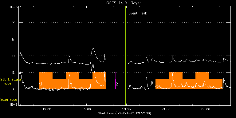 EIS Observation timeline overlay to GOES-Xray curve Code 1" 2" 40" 266" EIS Observations list for this event: STUDY ACRONYM ID DATE OBSERVED DESCRIPTION NOAA# TARGET 0 Flare_SNS_v2 | 79593 | 2021/10/30 11:25:14 | Major flare watch (sit and stare) | | Flare TIMELINE ID DATE OBSERVED FITS FILE XCEN (+W/-E) YCEN (+N/-S) DUR ----------------------------------------------------------------------------------------------------------------- 79593 | 2021/10/30 11:25:14.000 | eis_l0_20211030_112514.fits.gz | 383.51 | -499.20 | 1h0m19s 79593 | 2021/10/30 12:25:39.000 | eis_l0_20211030_122539.fits.gz | 390.70 | -498.89 | 1h0m21s 79593 | 2021/10/30 13:26:06.000 | eis_l0_20211030_132606.fits.gz | 397.72 | -498.50 | 1h0m20s 79593 | 2021/10/30 14:26:32.000 | eis_l0_20211030_142632.fits.gz | 404.83 | -498.27 | 1h0m20s 79593 | 2021/10/30 15:26:58.000 | eis_l0_20211030_152658.fits.gz | 411.86 | -497.89 | 1h0m20s 1 regcal078 | 79601 | 2021/10/30 17:10:12 | Dark exposures, 0s, 2 exposures, botto | | Engineering TIMELINE ID DATE OBSERVED FITS FILE XCEN (+W/-E) YCEN (+N/-S) DUR ----------------------------------------------------------------------------------------------------------------- 79601 | 2021/10/30 17:10:12.000 | eis_l0_20211030_171012.fits.gz | 440.07 | -836.11 | 2s 2 regcal079 | 79602 | 2021/10/30 17:11:05 | Dark exposures, 0s, 2 exposures, top c | | Engineering TIMELINE ID DATE OBSERVED FITS FILE XCEN (+W/-E) YCEN (+N/-S) DUR ----------------------------------------------------------------------------------------------------------------- 79602 | 2021/10/30 17:11:05.000 | eis_l0_20211030_171105.fits.gz | 440.22 | -325.19 | 1s 3 Flare_SNS_v2 | 79611 | 2021/10/30 20:12:13 | Major flare watch (sit and stare) | | Flare TIMELINE ID DATE OBSERVED FITS FILE XCEN (+W/-E) YCEN (+N/-S) DUR ----------------------------------------------------------------------------------------------------------------- 79611 | 2021/10/30 20:12:13.000 | eis_l0_20211030_201213.fits.gz | 444.36 | -496.03 | 1h0m20s 79611 | 2021/10/30 21:12:39.000 | eis_l0_20211030_211239.fits.gz | 451.08 | -495.49 | 1h0m20s 79611 | 2021/10/30 22:13:05.000 | eis_l0_20211030_221305.fits.gz | 457.88 | -495.18 | 1h0m20s 79611 | 2021/10/30 23:13:31.000 | eis_l0_20211030_231331.fits.gz | 464.60 | -494.57 | 1h0m20s 79611 | 2021/10/31 00:13:57.000 | eis_l0_20211031_001357.fits.gz | 471.25 | -494.26 | 1h0m21s : Check study information : Download file : View thumbnails For this event, also check for: