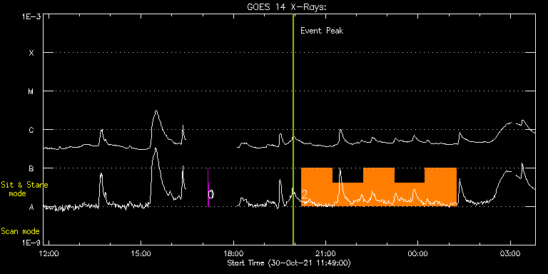 EIS Observation timeline overlay to GOES-Xray curve Code 1" 2" 40" 266" EIS Observations list for this event: STUDY ACRONYM ID DATE OBSERVED DESCRIPTION NOAA# TARGET 0 regcal078 | 79601 | 2021/10/30 17:10:12 | Dark exposures, 0s, 2 exposures, botto | | Engineering TIMELINE ID DATE OBSERVED FITS FILE XCEN (+W/-E) YCEN (+N/-S) DUR ----------------------------------------------------------------------------------------------------------------- 79601 | 2021/10/30 17:10:12.000 | eis_l0_20211030_171012.fits.gz | 440.07 | -836.11 | 2s 1 regcal079 | 79602 | 2021/10/30 17:11:05 | Dark exposures, 0s, 2 exposures, top c | | Engineering TIMELINE ID DATE OBSERVED FITS FILE XCEN (+W/-E) YCEN (+N/-S) DUR ----------------------------------------------------------------------------------------------------------------- 79602 | 2021/10/30 17:11:05.000 | eis_l0_20211030_171105.fits.gz | 440.22 | -325.19 | 1s 2 Flare_SNS_v2 | 79611 | 2021/10/30 20:12:13 | Major flare watch (sit and stare) | | Flare TIMELINE ID DATE OBSERVED FITS FILE XCEN (+W/-E) YCEN (+N/-S) DUR ----------------------------------------------------------------------------------------------------------------- 79611 | 2021/10/30 20:12:13.000 | eis_l0_20211030_201213.fits.gz | 444.36 | -496.03 | 1h0m20s 79611 | 2021/10/30 21:12:39.000 | eis_l0_20211030_211239.fits.gz | 451.08 | -495.49 | 1h0m20s 79611 | 2021/10/30 22:13:05.000 | eis_l0_20211030_221305.fits.gz | 457.88 | -495.18 | 1h0m20s 79611 | 2021/10/30 23:13:31.000 | eis_l0_20211030_231331.fits.gz | 464.60 | -494.57 | 1h0m20s 79611 | 2021/10/31 00:13:57.000 | eis_l0_20211031_001357.fits.gz | 471.25 | -494.26 | 1h0m21s : Check study information : Download file : View thumbnails For this event, also check for: