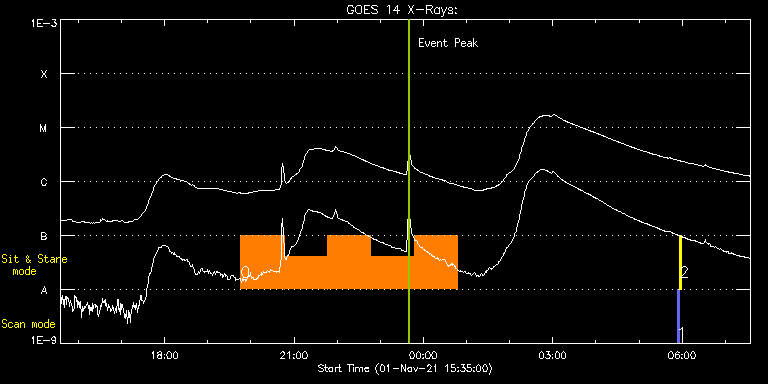 EIS Observation timeline overlay to GOES-Xray curve Code 1" 2" 40" 266" EIS Observations list for this event: STUDY ACRONYM ID DATE OBSERVED DESCRIPTION NOAA# TARGET 0 Flare_SNS_v2 | 79613 | 2021/11/01 19:45:42 | Major flare watch (sit and stare) | | Flare TIMELINE ID DATE OBSERVED FITS FILE XCEN (+W/-E) YCEN (+N/-S) DUR ----------------------------------------------------------------------------------------------------------------- 79613 | 2021/11/01 19:45:42.000 | eis_l0_20211101_194542.fits.gz | 710.08 | -472.47 | 1h0m20s 79613 | 2021/11/01 20:46:08.000 | eis_l0_20211101_204608.fits.gz | 714.33 | -471.93 | 1h0m20s 79613 | 2021/11/01 21:46:34.000 | eis_l0_20211101_214634.fits.gz | 718.50 | -471.39 | 1h0m19s 79613 | 2021/11/01 22:46:59.000 | eis_l0_20211101_224659.fits.gz | 722.52 | -470.70 | 1h0m20s 79613 | 2021/11/01 23:47:25.000 | eis_l0_20211101_234725.fits.gz | 726.53 | -470.31 | 1h0m20s 1 PRY_slot_contextLITE | 79591 | 2021/11/02 05:53:18 | Pointing Monitoring | 2891 | Active Region TIMELINE ID DATE OBSERVED FITS FILE XCEN (+W/-E) YCEN (+N/-S) DUR ----------------------------------------------------------------------------------------------------------------- 79591 | 2021/11/02 05:53:18.000 | eis_l0_20211102_055318.fits.gz | -15.37 | -0.50 | 2m57s 2 XRT_synop_AIA | 79592 | 2021/11/02 05:56:34 | Pointing Monitoring | | Quiet Sun TIMELINE ID DATE OBSERVED FITS FILE XCEN (+W/-E) YCEN (+N/-S) DUR ----------------------------------------------------------------------------------------------------------------- 79592 | 2021/11/02 05:56:34.000 | eis_l0_20211102_055634.fits.gz | -132.57 | -0.35 | 10s 79592 | 2021/11/02 05:56:49.000 | eis_l0_20211102_055649.fits.gz | -132.57 | -0.27 | 10s 79592 | 2021/11/02 05:57:04.000 | eis_l0_20211102_055704.fits.gz | -132.64 | -0.42 | 10s 79592 | 2021/11/02 05:57:19.000 | eis_l0_20211102_055719.fits.gz | -132.57 | -0.50 | 10s 79592 | 2021/11/02 05:57:35.000 | eis_l0_20211102_055735.fits.gz | -132.49 | -0.42 | 10s 79592 | 2021/11/02 05:57:50.000 | eis_l0_20211102_055750.fits.gz | -132.64 | -0.35 | 10s 79592 | 2021/11/02 05:58:05.000 | eis_l0_20211102_055805.fits.gz | -132.57 | -0.42 | 10s 79592 | 2021/11/02 05:58:20.000 | eis_l0_20211102_055820.fits.gz | -132.57 | -0.35 | 11s 79592 | 2021/11/02 05:58:36.000 | eis_l0_20211102_055836.fits.gz | -132.57 | -0.42 | 10s 79592 | 2021/11/02 05:58:51.000 | eis_l0_20211102_055851.fits.gz | -132.49 | -0.50 | 10s : Check study information : Download file : View thumbnails For this event, also check for: