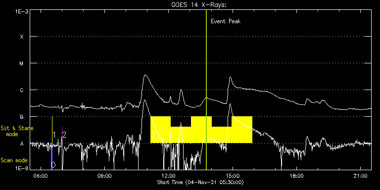 EIS Observation timeline overlay to GOES-Xray curve Code 1" 2" 40" 266" EIS Observations list for this event: STUDY ACRONYM ID DATE OBSERVED DESCRIPTION NOAA# TARGET 0 PRY_slot_contextLITE | 79618 | 2021/11/04 06:29:18 | Pointing Monitoring | | Active Region TIMELINE ID DATE OBSERVED FITS FILE XCEN (+W/-E) YCEN (+N/-S) DUR ----------------------------------------------------------------------------------------------------------------- 79618 | 2021/11/04 06:29:18.000 | eis_l0_20211104_062918.fits.gz | -15.37 | -0.42 | 2m57s 1 XRT_synop_AIA | 79619 | 2021/11/04 06:32:33 | Pointing Monitoring | | Quiet Sun TIMELINE ID DATE OBSERVED FITS FILE XCEN (+W/-E) YCEN (+N/-S) DUR ----------------------------------------------------------------------------------------------------------------- 79619 | 2021/11/04 06:32:33.000 | eis_l0_20211104_063233.fits.gz | -132.57 | -0.42 | 10s 2 regcal077 | 79631 | 2021/11/04 07:00:10 | Flatfield, 2 exposures, led 80ms, full | | Engineering TIMELINE ID DATE OBSERVED FITS FILE XCEN (+W/-E) YCEN (+N/-S) DUR ----------------------------------------------------------------------------------------------------------------- 79631 | 2021/11/04 07:00:10.000 | eis_l0_20211104_070010.fits.gz | 814.49 | -510.51 | 4s 3 Flare266_Hunter01 | 79657 | 2021/11/04 11:09:14 | Flare study | | Flare TIMELINE ID DATE OBSERVED FITS FILE XCEN (+W/-E) YCEN (+N/-S) DUR ----------------------------------------------------------------------------------------------------------------- 79657 | 2021/11/04 11:09:14.000 | eis_l0_20211104_110914.fits.gz | 311.52 | 228.16 | 56m22s 79657 | 2021/11/04 12:06:28.000 | eis_l0_20211104_120628.fits.gz | 319.10 | 228.40 | 56m23s 79657 | 2021/11/04 13:03:43.000 | eis_l0_20211104_130343.fits.gz | 326.51 | 228.63 | 56m22s 79657 | 2021/11/04 14:00:57.000 | eis_l0_20211104_140057.fits.gz | 334.08 | 229.09 | 56m22s 79657 | 2021/11/04 14:58:12.000 | eis_l0_20211104_145812.fits.gz | 341.42 | 229.32 | 56m22s : Check study information : Download file : View thumbnails For this event, also check for: