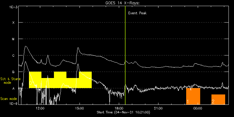 EIS Observation timeline overlay to GOES-Xray curve Code 1" 2" 40" 266" EIS Observations list for this event: STUDY ACRONYM ID DATE OBSERVED DESCRIPTION NOAA# TARGET 0 Flare266_Hunter01 | 79657 | 2021/11/04 11:09:14 | Flare study | | Flare TIMELINE ID DATE OBSERVED FITS FILE XCEN (+W/-E) YCEN (+N/-S) DUR ----------------------------------------------------------------------------------------------------------------- 79657 | 2021/11/04 11:09:14.000 | eis_l0_20211104_110914.fits.gz | 311.52 | 228.16 | 56m22s 79657 | 2021/11/04 12:06:28.000 | eis_l0_20211104_120628.fits.gz | 319.10 | 228.40 | 56m23s 79657 | 2021/11/04 13:03:43.000 | eis_l0_20211104_130343.fits.gz | 326.51 | 228.63 | 56m22s 79657 | 2021/11/04 14:00:57.000 | eis_l0_20211104_140057.fits.gz | 334.08 | 229.09 | 56m22s 79657 | 2021/11/04 14:58:12.000 | eis_l0_20211104_145812.fits.gz | 341.42 | 229.32 | 56m22s 1 Large_CH_Map | 79637 | 2021/11/04 23:07:50 | HOP 336 (Cycle 25 bright points) South | | Quiet Sun TIMELINE ID DATE OBSERVED FITS FILE XCEN (+W/-E) YCEN (+N/-S) DUR ----------------------------------------------------------------------------------------------------------------- 79637 | 2021/11/04 23:07:50.000 | eis_l0_20211104_230750.fits.gz | -20.14 | -676.56 | 1h1m53s 2 HPW021VEL260x512v2 | 79638 | 2021/11/05 01:03:14 | HOP 428(Solar Orbiter SPICE and EUI cr | 2893 | Active Region TIMELINE ID DATE OBSERVED FITS FILE XCEN (+W/-E) YCEN (+N/-S) DUR ----------------------------------------------------------------------------------------------------------------- 79638 | 2021/11/05 01:03:14.000 | eis_l0_20211105_010314.fits.gz | -26.26 | -1.35 | 1h0m44s : Check study information : Download file : View thumbnails For this event, also check for: