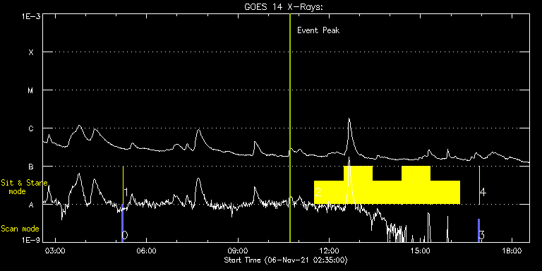 EIS Observation timeline overlay to GOES-Xray curve Code 1" 2" 40" 266" EIS Observations list for this event: STUDY ACRONYM ID DATE OBSERVED DESCRIPTION NOAA# TARGET 0 PRY_slot_contextLITE | 79654 | 2021/11/06 05:10:19 | Pointing Monitoring | 2893 | Active Region TIMELINE ID DATE OBSERVED FITS FILE XCEN (+W/-E) YCEN (+N/-S) DUR ----------------------------------------------------------------------------------------------------------------- 79654 | 2021/11/06 05:10:19.000 | eis_l0_20211106_051019.fits.gz | -15.29 | -0.50 | 2m57s 1 XRT_synop_AIA | 79655 | 2021/11/06 05:13:34 | Pointing Monitoring | | Quiet Sun TIMELINE ID DATE OBSERVED FITS FILE XCEN (+W/-E) YCEN (+N/-S) DUR ----------------------------------------------------------------------------------------------------------------- 79655 | 2021/11/06 05:13:34.000 | eis_l0_20211106_051334.fits.gz | -132.49 | -0.58 | 10s 2 Flare266_Hunter01 | 79676 | 2021/11/06 11:31:15 | Flare study | | Flare TIMELINE ID DATE OBSERVED FITS FILE XCEN (+W/-E) YCEN (+N/-S) DUR ----------------------------------------------------------------------------------------------------------------- 79676 | 2021/11/06 11:31:15.000 | eis_l0_20211106_113115.fits.gz | 632.72 | 250.33 | 56m22s 79676 | 2021/11/06 12:28:29.000 | eis_l0_20211106_122829.fits.gz | 637.59 | 250.88 | 56m22s 79676 | 2021/11/06 13:25:43.000 | eis_l0_20211106_132543.fits.gz | 642.38 | 251.34 | 56m23s 79676 | 2021/11/06 14:22:58.000 | eis_l0_20211106_142258.fits.gz | 647.17 | 251.88 | 56m22s 79676 | 2021/11/06 15:20:13.000 | eis_l0_20211106_152013.fits.gz | 651.80 | 252.42 | 56m22s 3 PRY_slot_contextLITE | 79658 | 2021/11/06 16:53:28 | Pointing Monitoring | 2893 | Active Region TIMELINE ID DATE OBSERVED FITS FILE XCEN (+W/-E) YCEN (+N/-S) DUR ----------------------------------------------------------------------------------------------------------------- 79658 | 2021/11/06 16:53:28.000 | eis_l0_20211106_165328.fits.gz | -15.29 | -0.50 | 2m56s 4 XRT_synop_AIA | 79659 | 2021/11/06 16:56:43 | Pointing Monitoring | | Quiet Sun TIMELINE ID DATE OBSERVED FITS FILE XCEN (+W/-E) YCEN (+N/-S) DUR ----------------------------------------------------------------------------------------------------------------- 79659 | 2021/11/06 16:56:43.000 | eis_l0_20211106_165643.fits.gz | -132.49 | -0.58 | 10s : Check study information : Download file : View thumbnails For this event, also check for:
