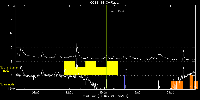 EIS Observation timeline overlay to GOES-Xray curve Code 1" 2" 40" 266" EIS Observations list for this event: STUDY ACRONYM ID DATE OBSERVED DESCRIPTION NOAA# TARGET 0 Flare266_Hunter01 | 79676 | 2021/11/06 11:31:15 | Flare study | | Flare TIMELINE ID DATE OBSERVED FITS FILE XCEN (+W/-E) YCEN (+N/-S) DUR ----------------------------------------------------------------------------------------------------------------- 79676 | 2021/11/06 11:31:15.000 | eis_l0_20211106_113115.fits.gz | 632.72 | 250.33 | 56m22s 79676 | 2021/11/06 12:28:29.000 | eis_l0_20211106_122829.fits.gz | 637.59 | 250.88 | 56m22s 79676 | 2021/11/06 13:25:43.000 | eis_l0_20211106_132543.fits.gz | 642.38 | 251.34 | 56m23s 79676 | 2021/11/06 14:22:58.000 | eis_l0_20211106_142258.fits.gz | 647.17 | 251.88 | 56m22s 79676 | 2021/11/06 15:20:13.000 | eis_l0_20211106_152013.fits.gz | 651.80 | 252.42 | 56m22s 1 PRY_slot_contextLITE | 79658 | 2021/11/06 16:53:28 | Pointing Monitoring | 2893 | Active Region TIMELINE ID DATE OBSERVED FITS FILE XCEN (+W/-E) YCEN (+N/-S) DUR ----------------------------------------------------------------------------------------------------------------- 79658 | 2021/11/06 16:53:28.000 | eis_l0_20211106_165328.fits.gz | -15.29 | -0.50 | 2m56s 2 XRT_synop_AIA | 79659 | 2021/11/06 16:56:43 | Pointing Monitoring | | Quiet Sun TIMELINE ID DATE OBSERVED FITS FILE XCEN (+W/-E) YCEN (+N/-S) DUR ----------------------------------------------------------------------------------------------------------------- 79659 | 2021/11/06 16:56:43.000 | eis_l0_20211106_165643.fits.gz | -132.49 | -0.58 | 10s 3 Atlas_60 | 79672 | 2021/11/06 21:04:50 | HOP428 (Solar Orbiter SPICE and EUI cr | | Quiet Sun TIMELINE ID DATE OBSERVED FITS FILE XCEN (+W/-E) YCEN (+N/-S) DUR ----------------------------------------------------------------------------------------------------------------- 79672 | 2021/11/06 21:04:50.000 | eis_l0_20211106_210450.fits.gz | -49.37 | -71.33 | 1h1m40s 4 fullccd_scan_m106 | 79669 | 2021/11/06 22:41:44 | HOP428 (Solar Orbiter SPICE and EUI cr | | Quiet Sun TIMELINE ID DATE OBSERVED FITS FILE XCEN (+W/-E) YCEN (+N/-S) DUR ----------------------------------------------------------------------------------------------------------------- 79669 | 2021/11/06 22:41:44.000 | eis_l0_20211106_224144.fits.gz | 54.36 | -71.25 | 17m55s 5 fullccd_scan_m106 | 79670 | 2021/11/06 23:07:14 | HOP428 (Solar Orbiter SPICE and EUI cr | | Quiet Sun TIMELINE ID DATE OBSERVED FITS FILE XCEN (+W/-E) YCEN (+N/-S) DUR ----------------------------------------------------------------------------------------------------------------- 79670 | 2021/11/06 23:07:14.000 | eis_l0_20211106_230714.fits.gz | -49.70 | -71.33 | 17m55s : Check study information : Download file : View thumbnails For this event, also check for: