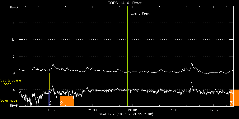 EIS Observation timeline overlay to GOES-Xray curve Code 1" 2" 40" 266" EIS Observations list for this event: STUDY ACRONYM ID DATE OBSERVED DESCRIPTION NOAA# TARGET 0 PRY_slot_contextLITE | 79693 | 2021/11/10 17:44:51 | Pointing Monitoring | | Active Region TIMELINE ID DATE OBSERVED FITS FILE XCEN (+W/-E) YCEN (+N/-S) DUR ----------------------------------------------------------------------------------------------------------------- 79693 | 2021/11/10 17:44:51.000 | eis_l0_20211110_174451.fits.gz | -15.21 | -0.27 | 2m56s 1 XRT_synop_AIA | 79694 | 2021/11/10 17:48:05 | Pointing Monitoring | | Quiet Sun TIMELINE ID DATE OBSERVED FITS FILE XCEN (+W/-E) YCEN (+N/-S) DUR ----------------------------------------------------------------------------------------------------------------- 79694 | 2021/11/10 17:48:05.000 | eis_l0_20211110_174805.fits.gz | -132.49 | -0.50 | 10s 2 HPW021VEL260x512v2 | 79711 | 2021/11/10 18:34:49 | Active Region Studies | 2894 | Active Region TIMELINE ID DATE OBSERVED FITS FILE XCEN (+W/-E) YCEN (+N/-S) DUR ----------------------------------------------------------------------------------------------------------------- 79711 | 2021/11/10 18:34:49.000 | eis_l0_20211110_183449.fits.gz | -142.85 | -500.59 | 1h0m46s 3 HPW021VEL260x512v2 | 79713 | 2021/11/11 07:14:13 | Active Region Studies | | Active Region TIMELINE ID DATE OBSERVED FITS FILE XCEN (+W/-E) YCEN (+N/-S) DUR ----------------------------------------------------------------------------------------------------------------- 79713 | 2021/11/11 07:14:13.000 | eis_l0_20211111_071413.fits.gz | -41.43 | -500.13 | 1h0m45s : Check study information : Download file : View thumbnails For this event, also check for: