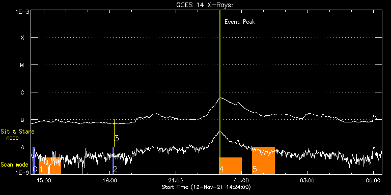 EIS Observation timeline overlay to GOES-Xray curve Code 1" 2" 40" 266" EIS Observations list for this event: STUDY ACRONYM ID DATE OBSERVED DESCRIPTION NOAA# TARGET 0 full_sun_slot_scan_2 | 79752 | 2021/11/12 14:29:13 | HOP130 - #15/15 | | Quiet Sun TIMELINE ID DATE OBSERVED FITS FILE XCEN (+W/-E) YCEN (+N/-S) DUR ----------------------------------------------------------------------------------------------------------------- 79752 | 2021/11/12 14:29:13.000 | eis_l0_20211112_142913.fits.gz | -857.54 | -757.17 | 5m27s 1 HPW021VEL260x512v2 | 79757 | 2021/11/12 14:45:34 | Active Region Studies | 2894 | Active Region TIMELINE ID DATE OBSERVED FITS FILE XCEN (+W/-E) YCEN (+N/-S) DUR ----------------------------------------------------------------------------------------------------------------- 79757 | 2021/11/12 14:45:34.000 | eis_l0_20211112_144534.fits.gz | 209.09 | -496.19 | 1h0m44s 2 PRY_slot_contextLITE | 79723 | 2021/11/12 18:08:19 | Pointing Monitoring | | Active Region TIMELINE ID DATE OBSERVED FITS FILE XCEN (+W/-E) YCEN (+N/-S) DUR ----------------------------------------------------------------------------------------------------------------- 79723 | 2021/11/12 18:08:19.000 | eis_l0_20211112_180819.fits.gz | -15.37 | -0.50 | 2m57s 3 XRT_synop_AIA | 79724 | 2021/11/12 18:11:34 | Pointing Monitoring | | Quiet Sun TIMELINE ID DATE OBSERVED FITS FILE XCEN (+W/-E) YCEN (+N/-S) DUR ----------------------------------------------------------------------------------------------------------------- 79724 | 2021/11/12 18:11:34.000 | eis_l0_20211112_181134.fits.gz | -132.57 | -0.42 | 10s 4 Large_CH_Map | 79727 | 2021/11/12 22:58:19 | HOP393 | | Quiet Sun TIMELINE ID DATE OBSERVED FITS FILE XCEN (+W/-E) YCEN (+N/-S) DUR ----------------------------------------------------------------------------------------------------------------- 79727 | 2021/11/12 22:58:19.000 | eis_l0_20211112_225819.fits.gz | -28.31 | -52.64 | 1h1m53s 5 Large_CH_Map | 79760 | 2021/11/13 00:29:13 | HOP393 | | Quiet Sun TIMELINE ID DATE OBSERVED FITS FILE XCEN (+W/-E) YCEN (+N/-S) DUR ----------------------------------------------------------------------------------------------------------------- 79760 | 2021/11/13 00:29:13.000 | eis_l0_20211113_002913.fits.gz | -36.05 | -52.64 | 1h1m53s : Check study information : Download file : View thumbnails For this event, also check for: