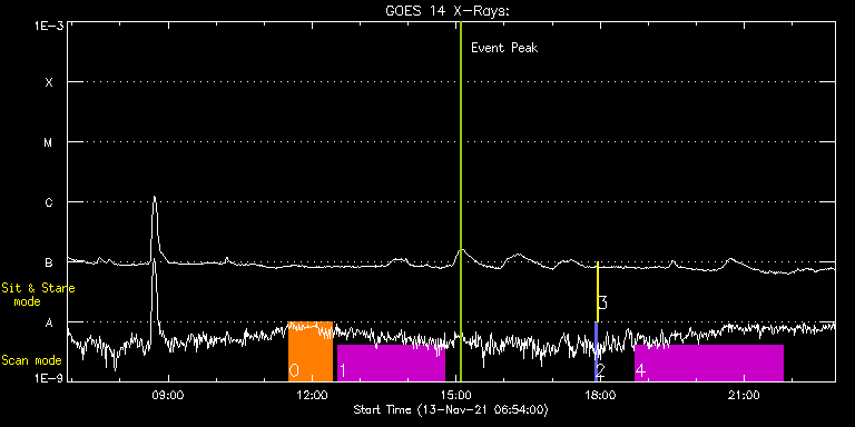 EIS Observation timeline overlay to GOES-Xray curve Code 1" 2" 40" 266" EIS Observations list for this event: STUDY ACRONYM ID DATE OBSERVED DESCRIPTION NOAA# TARGET 0 GDZ_300x360_S2S3_30S | 79761 | 2021/11/13 11:31:14 | HOP 307 trailing edge | | Active Region TIMELINE ID DATE OBSERVED FITS FILE XCEN (+W/-E) YCEN (+N/-S) DUR ----------------------------------------------------------------------------------------------------------------- 79761 | 2021/11/13 11:31:14.000 | eis_l0_20211113_113114.fits.gz | 23.72 | 296.12 | 53m18s 1 VHH_SlowAR_2h20_DPCM | 79762 | 2021/11/13 12:32:27 | HOP 307 leading edge | | Active Region TIMELINE ID DATE OBSERVED FITS FILE XCEN (+W/-E) YCEN (+N/-S) DUR ----------------------------------------------------------------------------------------------------------------- 79762 | 2021/11/13 12:32:27.000 | eis_l0_20211113_123227.fits.gz | 151.51 | 289.87 | 2h12m37s 2 PRY_slot_contextLITE | 79771 | 2021/11/13 17:53:34 | Change of EIS pointing and alignment w | | Active Region TIMELINE ID DATE OBSERVED FITS FILE XCEN (+W/-E) YCEN (+N/-S) DUR ----------------------------------------------------------------------------------------------------------------- 79771 | 2021/11/13 17:53:34.000 | eis_l0_20211113_175334.fits.gz | -15.29 | -0.58 | 2m56s 3 XRT_synop_AIA | 79772 | 2021/11/13 17:56:49 | Change of EIS pointing and alignment w | | Quiet Sun TIMELINE ID DATE OBSERVED FITS FILE XCEN (+W/-E) YCEN (+N/-S) DUR ----------------------------------------------------------------------------------------------------------------- 79772 | 2021/11/13 17:56:49.000 | eis_l0_20211113_175649.fits.gz | -132.57 | -0.50 | 10s 4 HPW021_VEL_360x512v1 | 79782 | 2021/11/13 18:43:34 | AR12895 study | 2895 | Active Region TIMELINE ID DATE OBSERVED FITS FILE XCEN (+W/-E) YCEN (+N/-S) DUR ----------------------------------------------------------------------------------------------------------------- 79782 | 2021/11/13 18:43:34.000 | eis_l0_20211113_184334.fits.gz | 136.66 | 297.44 | 3h5m43s : Check study information : Download file : View thumbnails For this event, also check for: