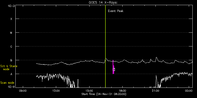 EIS Observation timeline overlay to GOES-Xray curve Code 1" 2" 40" 266" EIS Observations list for this event: STUDY ACRONYM ID DATE OBSERVED DESCRIPTION NOAA# TARGET 0 regcal071 | 79958 | 2021/11/24 17:07:11 | Dark exposures, CCD bottom rows (100s | | Engineering TIMELINE ID DATE OBSERVED FITS FILE XCEN (+W/-E) YCEN (+N/-S) DUR ----------------------------------------------------------------------------------------------------------------- 79958 | 2021/11/24 17:07:11.000 | eis_l0_20211124_170711.fits.gz | 579.73 | -80.94 | 3m22s 1 regcal072 | 79959 | 2021/11/24 17:11:00 | Dark exposures, top CCD rows (100s exp | | Engineering TIMELINE ID DATE OBSERVED FITS FILE XCEN (+W/-E) YCEN (+N/-S) DUR ----------------------------------------------------------------------------------------------------------------- 79959 | 2021/11/24 17:11:00.000 | eis_l0_20211124_171100.fits.gz | 580.27 | 429.98 | 3m22s : Check study information : Download file : View thumbnails For this event, also check for: