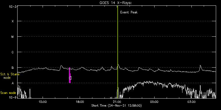 EIS Observation timeline overlay to GOES-Xray curve Code 1" 2" 40" 266" EIS Observations list for this event: STUDY ACRONYM ID DATE OBSERVED DESCRIPTION NOAA# TARGET 0 regcal071 | 79958 | 2021/11/24 17:07:11 | Dark exposures, CCD bottom rows (100s | | Engineering TIMELINE ID DATE OBSERVED FITS FILE XCEN (+W/-E) YCEN (+N/-S) DUR ----------------------------------------------------------------------------------------------------------------- 79958 | 2021/11/24 17:07:11.000 | eis_l0_20211124_170711.fits.gz | 579.73 | -80.94 | 3m22s 1 regcal072 | 79959 | 2021/11/24 17:11:00 | Dark exposures, top CCD rows (100s exp | | Engineering TIMELINE ID DATE OBSERVED FITS FILE XCEN (+W/-E) YCEN (+N/-S) DUR ----------------------------------------------------------------------------------------------------------------- 79959 | 2021/11/24 17:11:00.000 | eis_l0_20211124_171100.fits.gz | 580.27 | 429.98 | 3m22s : Check study information : Download file : View thumbnails For this event, also check for:
