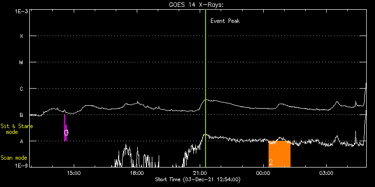 EIS Observation timeline overlay to GOES-Xray curve Code 1" 2" 40" 266" EIS Observations list for this event: STUDY ACRONYM ID DATE OBSERVED DESCRIPTION NOAA# TARGET 0 regcal071 | 80031 | 2021/12/03 14:32:10 | Dark exposures, CCD bottom rows (100s | | Engineering TIMELINE ID DATE OBSERVED FITS FILE XCEN (+W/-E) YCEN (+N/-S) DUR ----------------------------------------------------------------------------------------------------------------- 80031 | 2021/12/03 14:32:10.000 | eis_l0_20211203_143210.fits.gz | -71.93 | -89.13 | 3m22s 1 regcal072 | 80032 | 2021/12/03 14:35:59 | Dark exposures, top CCD rows (100s exp | | Engineering TIMELINE ID DATE OBSERVED FITS FILE XCEN (+W/-E) YCEN (+N/-S) DUR ----------------------------------------------------------------------------------------------------------------- 80032 | 2021/12/03 14:35:59.000 | eis_l0_20211203_143559.fits.gz | -71.54 | 421.95 | 3m22s 2 Large_CH_Map | 79965 | 2021/12/04 00:15:12 | HOP 393 (Cycle 24/25 equatorial transi | | Quiet Sun TIMELINE ID DATE OBSERVED FITS FILE XCEN (+W/-E) YCEN (+N/-S) DUR ----------------------------------------------------------------------------------------------------------------- 79965 | 2021/12/04 00:15:12.000 | eis_l0_20211204_001512.fits.gz | -42.82 | -8.54 | 1h1m53s : Check study information : Download file : View thumbnails For this event, also check for: